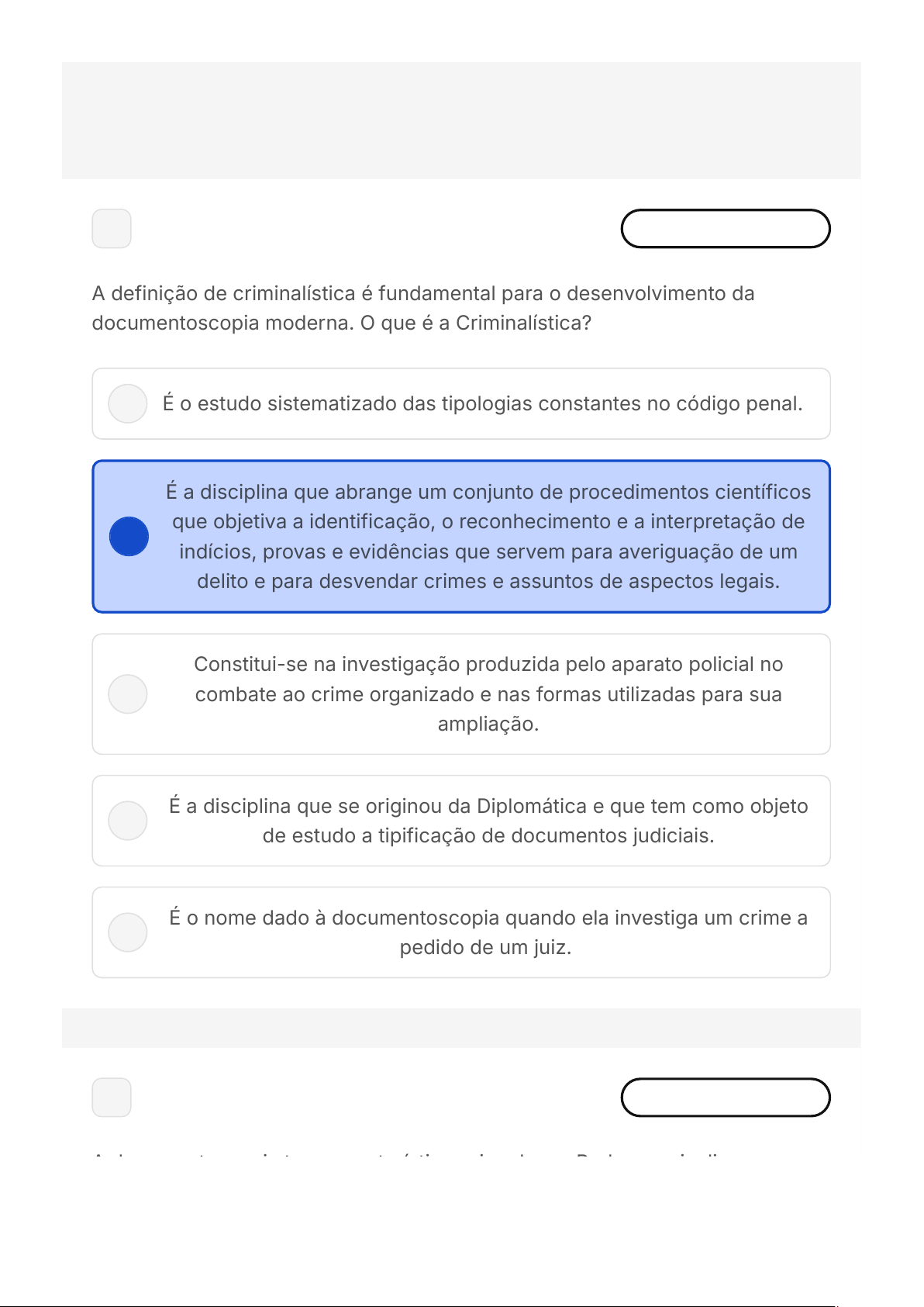 A B C D E 1 Marcar para revisão A definição de criminalística é fundamental para o desenvolvimento da documentoscopia moderna. O que é a Criminalística? É o estudo sistematizado das tipologias constantes no código penal. É a disciplina que abrange um conjunto de procedimentos científicos que objetiva a identificação, o reconhecimento e a interpretação de indícios, provas e evidências que servem para averiguação de um delito e para desvendar crimes e assuntos de aspectos legais. Constitui-se na investigação produzida pelo aparato policial no combate ao crime organizado e nas formas utilizadas para sua ampliação. É a disciplina que se originou da Diplomática e que tem como objeto de estudo a tipificação de documentos judiciais. É o nome dado à documentoscopia quando ela investiga um crime a pedido de um juiz. 2 Marcar para revisão A documentoscopia tem características singulares. Podemos sinalizar por https://estacio.saladeavaliacoes.com.br/prova/696a9a7282052a7da44c9ff1/ 16/01/2026, 17:17 Página 1 de 9 A B C D E A B C A documentoscopia tem características singulares. Podemos sinalizar por exemplo: Análise de corpos Análise de rastros de uma pessoa Análise de uso de software Análise psciotécnica Análise documental 3 Marcar para revisão Os exames grafoscópicos para serem realizados deverão atender a determinados requisitos. Dentre as alternativas abaixo, assinale aquela que apresenta corretamente requisitos a serem atendidos nos referidos exames. Autenticidade, adequabilidade, quantidade e contemporaneidade. Legitimidade, conformidade, numerabilidade e desigualdade. Quantidade, contemporaneidade, loquacidade e estanqueidade. Prova AV Perícia Forense – Documentoscopia https://estacio.saladeavaliacoes.com.br/prova/696a9a7282052a7da44c9ff1/ 16/01/2026, 17:17 Página 2 de 9 Para que os exames periciais de comparação gráfica sejam realizados com segurança, é necessário que os padrões de confronto preencham determinados requisitos técnicos. Assinale a alternativa que apresenta corretamente requisitos a serem atendidos nos referidos exames D E A B C D E Individualidade, profundidade, oportunidade e territorialidade. Materialidade, desigualdade, paternidade e quantidade. 4 Marcar para revisão Uma marca registrada é um símbolo, logotipo, palavra, frase, design ou qualquer outro elemento distintivo que é usado para identificar e distinguir os produtos ou serviços de uma empresa dos de outras empresas. Sobre o tema, é correto afirmar que: Uma marca pode se valer de símbolos e formato de letras de outra marca, sem que isso implique em algum tipo de problema judicial. Uma empresa pode alegar ter feito uma “homenagem” e copiar uma marca mais famosa, o que garante que não será processada. A marca é a identidade visual de uma empresa, sendo garantido por lei seu direito de uso. Nomes similares não levam um consumidor a adquirir outro produto por engano. Apenas a imagem é resguardada pelo direito sobre marcas registradas. Questões Finalizar prova https://estacio.saladeavaliacoes.com.br/prova/696a9a7282052a7da44c9ff1/ 16/01/2026, 17:17 Página 3 de 9 A marca pode ser definida como toda palavra, frase, símbolo, design ou combinação destes elementos que serve para identificar e distinguir os produtos ou serviços de uma empresa em relação às demais empresas concorrentes. Sobre o tema, é correto afirmar que: A B C D E 5 Marcar para revisão Ao lidar com fatos que exigem conhecimento técnico especializado, o magistrado poderá ser assistido por um profissional com expertise na área em questão. Esse apoio é fundamental em processos que envolvem aspectos científicos ou técnicos que não fazem parte do domínio jurídico. Com base nesse contexto, qual característica define a atuação desse profissional no processo? Atua exclusivamente como representante de uma das partes no processo. Possui liberdade para emitir juízos de valor sobre os fatos jurídicos envolvidos. Substitui o juiz nas decisões técnicas do processo. Apresenta sua análise técnica de forma documentada, sob a forma de laudo. Atua apenas em processos que envolvam perícia médica ou contábil. 6 Marcar para revisão Uma das principais ações a serem tomadas para correta condução e estabelecimento da conclusão pericial é a realização da coleta de padrões com as técnicas adequadas. A coleta de padrões contemporâneos é de fundamental importância para o exame pericial pois permite ao perito analisar: https://estacio.saladeavaliacoes.com.br/prova/696a9a7282052a7da44c9ff1/ 16/01/2026, 17:17 Página 4 de 9 A B C D E A B C somente a evolução da velocidade encontrada no grafismo ao decorrer do tempo. o tipo de falsificação encontrada no documento questionado. a fase do gesto gráfico encontrada no grafismo questionado. a coordenação dos movimentos encontrados no grafismo questionado. a evolução encontrada no grafismo ao decorrer do tempo. 7 Marcar para revisão Estilo é uma palavra que deriva do lati “stillus”, um instrumento de metal usado para desenhar e ornamentar letras. Sobre estilo, no campo da linguística, é correto afirmar que: Indivíduos diferentes apresentam padrões diferentes no uso da língua. É possível identificar apenas os estilos de grandes escritores. A língua é de uso comum de todos, logo, não há diferenças no uso da língua entre um indivíduo e outro. https://estacio.saladeavaliacoes.com.br/prova/696a9a7282052a7da44c9ff1/ 16/01/2026, 17:17 Página 5 de 9 Highlight Highlight Resposta correta E D E A B C D da língua entre um indivíduo e outro. Estilo se refere apenas à forma de produzir artes em determinados períodos históricos. As noções de estilo barroco, neoclássico, moderno etc. são instrumentos de análise em linguística forense. 8 Marcar para revisão (IADES/2018 – Adaptada) A Teoria Geral da Prova é um ramo do direito probatório que estuda os princípios, conceitos e regras gerais que regem a produ
