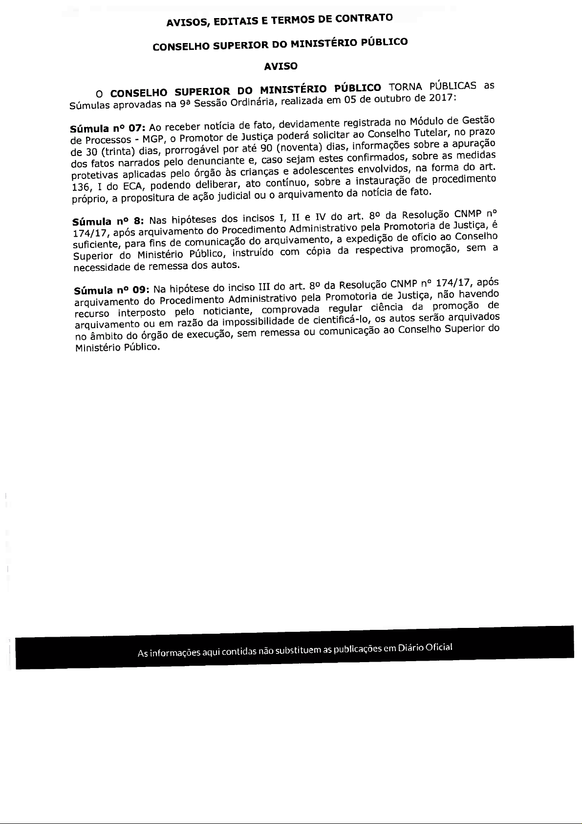 AVISOS, EDITAIS E TERMOS DE CONTRATO CONSELHO SUPERIOR DO MINISTÉRIO PÚBLICO AVISO CONSELHO SUPERIOR DO MINISTÉRIO PÚBLICO TORNA PÚBLICAS as Súmulas aprovadas na Sessão Ordinária, realizada em 05 de outubro de 2017: Súmula n° 07: Ao receber notícia de fato, devidamente registrada no Módulo de Gestão de Processos MGP, Promotor de Justiça poderá solicitar ao Conselho Tutelar, no prazo de 30 (trinta) dias, prorrogável por até 90 (noventa) dias, informações sobre a apuração dos fatos narrados pelo denunciante e, caso sejam estes confirmados, sobre as medidas protetivas aplicadas pelo órgão às crianças e adolescentes envolvidos, na forma do art. 136, I do ECA, podendo deliberar, ato contínuo, sobre a instauração de procedimento próprio, a propositura de ação judicial ou arquivamento da notícia de fato. Súmula 8: Nas hipóteses dos incisos I, II e IV do art. da Resolução CNMP n° 174/17, após arquivamento do Procedimento Administrativo pela Promotoria de Justiça, é suficiente, para fins de comunicação do arquivamento, a expedição de ofício ao Conselho Superior do Ministério Público, instruído com cópia da respectiva promoção, sem a necessidade de remessa dos autos. Súmula 09: Na hipótese do inciso III do art. da Resolução CNMP n° 174/17, após arquivamento do Procedimento Administrativo pela Promotoria de Justiça, não havendo recurso interposto pelo noticiante, comprovada regular ciência da promoção de arquivamento ou em razão da impossibilidade de cientificá-lo, os autos serão arquivados no âmbito do órgão de execução, sem remessa ou comunicação ao Conselho Superior do Ministério Público. As informações aqui contidas não substituem as publicações em Diário Oficial