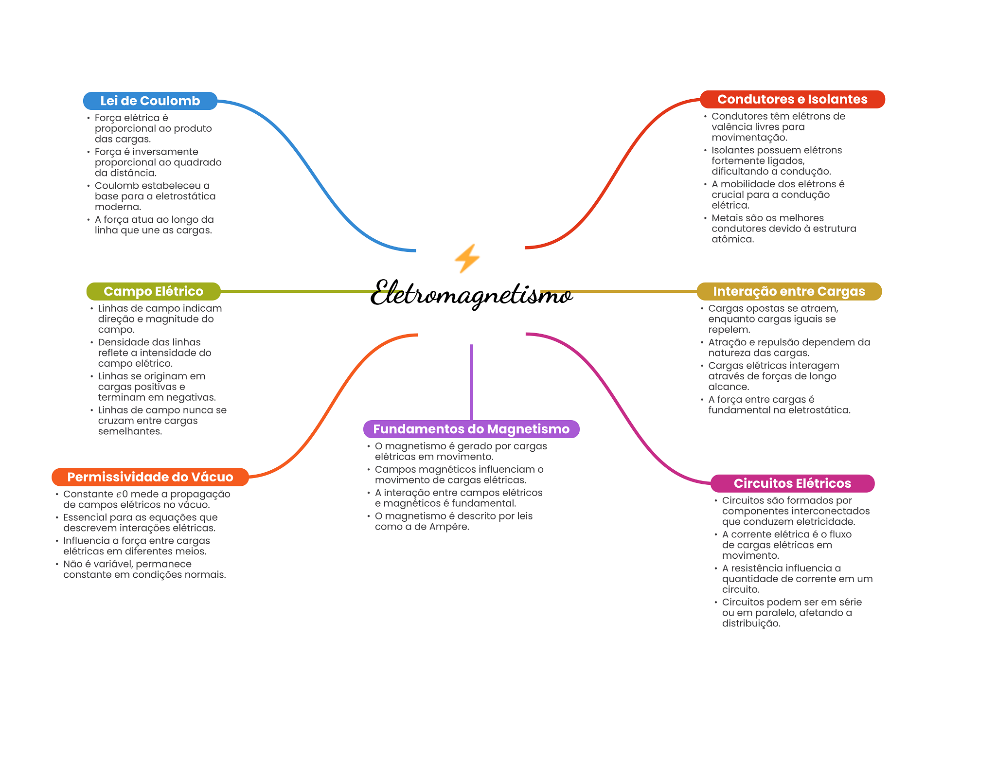 Lei de Coulomb Condutores e Isolantes Força elétrica é Condutores têm elétrons de proporcional ao produto valência livres para das cargas. movimentação. Força é inversamente Isolantes possuem elétrons proporcional ao quadrado fortemente ligados, da distância. dificultando a condução. Coulomb estabeleceu a A mobilidade dos elétrons é base para a eletrostática crucial para a condução moderna. elétrica. A força atua ao longo da Metais são OS melhores linha que une as cargas. condutores devido à estrutura atômica. Campo Elétrico Eletromagnetismo Interação entre Cargas Linhas de campo indicam Cargas opostas se atraem, direção e magnitude do enquanto cargas iguais se campo. repelem. Densidade das linhas Atração e repulsão dependem da reflete a intensidade do natureza das cargas. campo elétrico. Cargas elétricas interagem Linhas se originam em através de forças de longo cargas positivas e alcance. terminam em negativas. A força entre cargas é Linhas de campo nunca se fundamental na eletrostática. cruzam entre cargas semelhantes. Fundamentos do Magnetismo magnetismo é gerado por cargas elétricas em movimento. Campos magnéticos influenciam Permissividade do Vácuo movimento de cargas elétricas. Circuitos Elétricos Constante mede a propagação A interação entre campos elétricos de campos elétricos no vácuo. e magnéticos é fundamental. Circuitos são formados por magnetismo é descrito por leis componentes interconectados Essencial para as equações que como a de Ampère. que conduzem eletricidade. descrevem interações elétricas. A corrente elétrica é O fluxo Influencia a força entre cargas de cargas elétricas em elétricas em diferentes meios. movimento. Não é variável, permanece A resistência influencia a constante em condições normais. quantidade de corrente em um circuito. Circuitos podem ser em série ou em paralelo, afetando a distribuição.