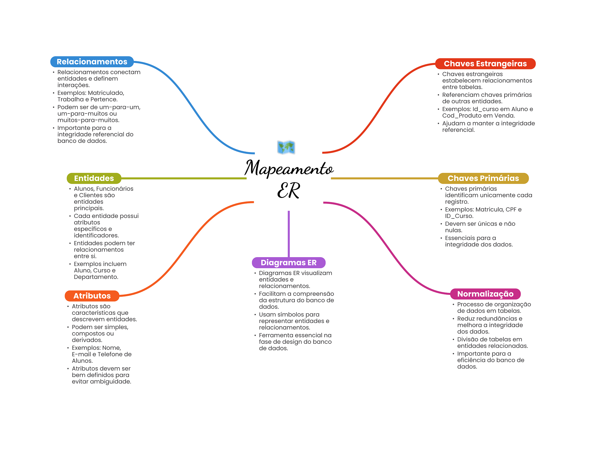 Relacionamentos Chaves Estrangeiras Relacionamentos conectam Chaves estrangeiras entidades e definem estabelecem relacionamentos interações. entre tabelas. Exemplos: Matriculado, Referenciam chaves primárias Trabalha e Pertence. de outras entidades. Podem ser de um-para-um, Exemplos: Id_curso em Aluno e um-para-muitos ou Cod_Produto em Venda. muitos-para-muitos. Ajudam a manter a integridade Importante para a referencial. integridade referencial do banco de dados. Mapeamento Entidades Chaves Primárias Alunos, Funcionários e Clientes são ER Chaves primárias identificam unicamente cada entidades registro. principais. Exemplos: Matricula, CPF e Cada entidade possui ID_Curso. atributos Devem ser únicas e não específicos e nulas. identificadores. Essenciais para a Entidades podem ter integridade dos dados. relacionamentos entre si. Exemplos incluem Diagramas ER Aluno, Curso e Diagramas ER visualizam Departamento. entidades e relacionamentos. Atributos Facilitam a compreensão Normalização da estrutura do banco de Atributos são dados. Processo de organização características que de dados em tabelas. Usam símbolos para descrevem entidades. representar entidades e Reduz redundâncias e Podem ser simples, relacionamentos. melhora a integridade compostos ou dos dados. Ferramenta essencial na derivados. fase de design do banco Divisão de tabelas em Exemplos: Nome, de dados. entidades relacionadas. E-mail e Telefone de Importante para a Alunos. eficiência do banco de Atributos devem ser dados. bem definidos para evitar ambiguidade.