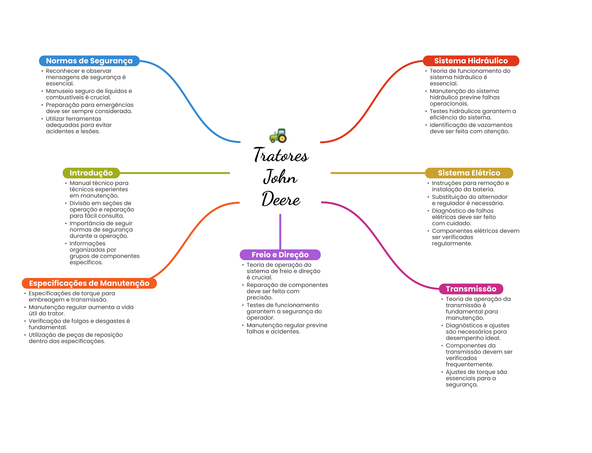 Normas de Segurança Sistema Hidráulico Reconhecer e observar Teoria de funcionamento do mensagens de segurança é sistema hidráulico é essencial. essencial. Manuseio seguro de líquidos e Manutenção do sistema combustíveis é crucial. hidráulico previne falhas Preparação para emergências operacionais. deve ser sempre considerada. Testes hidráulicos garantem a Utilizar ferramentas eficiência do sistema. adequadas para evitar Identificação de vazamentos acidentes e lesões. deve ser feita com atenção. Tratores Introdução John Sistema Elétrico Manual técnico para Instruções para remoção e técnicos experientes instalação da bateria. em manutenção. Deere Substituição do alternador Divisão em seções de e regulador é necessária. operação e reparação Diagnóstico de falhas para fácil consulta. elétricas deve ser feito Importância de seguir com cuidado. normas de segurança Componentes elétricos devem durante a operação. ser verificados Informações regularmente. organizadas por grupos de componentes Freio e Direção específicos. Teoria de operação do sistema de freio e direção é crucial. Especificações de Manutenção Reparação de componentes Especificações de torque para deve ser feita com Transmissão embreagem e transmissão. precisão. Teoria de operação da Manutenção regular aumenta a vida Testes de funcionamento transmissão é útil do trator. garantem a segurança do fundamental para Verificação de folgas e desgastes é operador. manutenção. fundamental. Manutenção regular previne Diagnósticos e ajustes falhas e acidentes. Utilização de peças de reposição são necessários para dentro das especificações. desempenho ideal. Componentes da transmissão devem ser verificados frequentemente. Ajustes de torque são essenciais para a segurança.