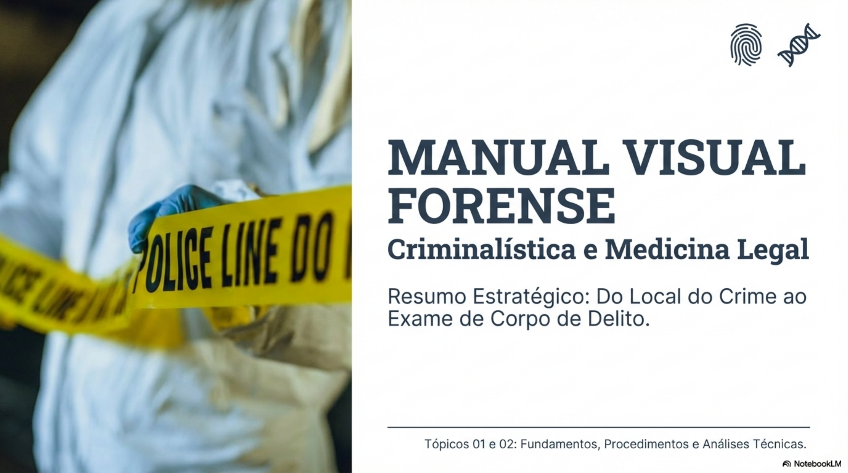 MANUAL VISUAL FORENSE POLICE LINE DO Criminalística e Medicina Legal Resumo Estratégico: Do Local do Crime ao Exame de Corpo de Delito. Tópicos 01 e 02: Fundamentos, Procedimentos e Análises Técnicas. NotebookLMNoções de Criminalística: Conceito e História Definições Clássicas Evolução e Princípios Hans Gross (1893): 'Pai da Criminalística'. Evolução: Definiu-a como estudo da fenomenologia - 1. Estática ('Visum et repertum' - ver e relatar) do crime e métodos práticos de investigação 2. Dinâmica (Interação com vestígio) ('Sistema de ("Sistema de - 3. Pós-Moderna (Autonomia científica e interpretação baseada em fatos) José Del Picchia (1947): Disciplina que visa o reconhecimento e interpretação dos indícios Princípio da Observação (Locard): materiais extrínsecos (ao corpo/crime) e contato deixa uma marca". Não existe identidade do criminoso. crime perfeito, apenas incapacidade de detectar vestígio. ! Alert Insight: A Medicina Legal estuda vestígios Princípios Fundamentais: intrínsecos; a Criminalística estuda - Análise (Método científico) vestígios extrínsecos. - Descrição (Linguagem ética/jurídica) - Interpretação (Individualidade) NotebookLMA Perícia e Perito (Art. 159 CPP) + Tipos de Perito ! Perito Oficial: Servidor Requisição e Prazos Assistente Técnico público, investido no cargo, Quem Requisita: Delegado, portador de diploma de Juiz, MP. (Partes não Atua após a admissão pelo curso superior. (Basta 1 requisitam, mas podem juiz e após a conclusão do perito para o laudo). formular quesitos). laudo oficial. Perito "Ad (Não Prazos (Art. 160): 10 dias Oficial): Na falta do oficial. para elaboração do Laudo Exige-se 02 (duas) pessoas (prorrogável em casos idôneas, com diploma de excepcionais). curso superior (preferencialmente na área), sob compromisso legal. NotebookLMA Prova e Corpo de Delito Definições Hierarquia da Fundamentais Classificação da Perícia Prova (Contexto) Prova: Elementos Exame feito sobre os 1. Confessional (Réu) produzidos para Perícia próprios vestígios convencer juiz sobre a 1 (obrigatória quando a 2. Testemunhal Direta veracidade dos fatos infração deixa (Pessoas) (Art. 155 CPP). marcas - Art. 158). 3. Documental Corpo de Delito: Realizada quando os (Escritos/Vídeos) conjunto de vestígios vestígios materiais (sensíveis) Perícia 4. Pericial 2 desapareceram. deixados pela infração Indireta Suprida pela prova - penal. testemunhal ou "Rainha das Provas") documental. NotebookLMLocais de Crime: Classificação e Preservação Quanto ao Ambiente Quanto à Preservação Interno: Prédios/Cercados Idôneo: Preservado/Intacto Externo: Vias públicas/Terrenos baldios Inidôneo: Violado/Alterado Imediata (Onde ocorreu fato/corpo) Mediata Relacionada (Locais ligados, ex: descarte da arma) Isolamento (Art. 169 CPP): Autoridade policial deve providenciar imediatamente ROT CROSS para que não se altere estado das coisas até a chegada dos peritos. Fraude Processual: Alterar a cena antes da liberação é crime. NotebookLMA Cadeia de Custódia (Lei 13.964/2019) caminho do vestígio: Do reconhecimento ao descarte. Conceito: Conjunto de todos os procedimentos para manter e documentar a história cronológica do vestígio. Acondicionamento Reconhecimento Isolamento Fixação Coleta 2 (Selo/Lacre) Transporte Fase Externa Fase Interna Armazenamento Recebimento Processamento (Central de Descarte 1 Custódia) NotebookLMVestígios e Tipos de Levantamento Vestígio: Material bruto constado/recolhido Indício: Circunstância conhecida e provada no local (Art. 158-A que leva à conclusão de outra (Art. 239). Levantamento Contra a Pessoa Levantamento Contra (Perinecroscopia) Patrimônio Exame externo no local. Foco em: Foco em danos materiais: Posição do corpo Arrombamento: Destruição de Manchas de sangue obstáculo (Art. 155 CP) (projetadas/escorridas) Escalada: Acesso por via anormal Lesões de defesa Ferramentas: Marcas de alavanca, Livores (indicam se chaves falsas (michas) corpo foi movido) Avaliação de dano e valor Referências clínicas de lesões NotebookLMNoções de Balística Forense 1 Balística Terminal Balística Interna Balística Externa (ou de Efeitos) Estuda funcionamento da Estuda a trajetória no meio Estuda os danos produzidos arma e movimento do projétil (ar) desde a saída do cano no alvo (poder de parada, dentro do cano (percussão, até alvo (gravidade, cavidade combustão, raiamento). resistência do ar). Aplicação: Identificação da arma (confronto microbalístico) e distância do tiro. NotebookLMTraumatologia Forense: Agentes e Instrumentos Tema 02 - Energia Mecânica Classificação dos Instrumentos Instrumentos Mistos (A Causa) Perfurante: Age por pressão num Perfurocortante: Ponta e gume ponto (ex: Agulha, picador de gelo). (ex: Faca de cozinha, punhal). Cortante: Age por Cortocontundente: Gume e deslizamento de gume massa/peso (ex: Machado, (ex: Navalha, papel). guilhotina). Contundente: Age por Perfurocontundente: Impacto e choque/impacto de Exemplo: Faca penetração (ex: Projétil de arma de superfície romba fogo). (ex: Pedra, chão). NotebookLMTraumatologia: Análise das Lesões A relação Instrumento -> Lesão (O Efeito) INSTRUMENTO LESÃO RESULTANTE Instrumento Perfurante Lesão Punctura (Ponto, pequena abertura, profundo). Instrumento Cortante Lesão Incisa (Linear, bordas regulares, 2 1 cauda de escoriação). Instrumento Contundente Lesão Contusa (Escoriação, Equimose, Hematoma, Fratura). Instrumento Lesão Perfuro-contusa. (Tiro) Sinais de Tiro (Balística Terminal) "Orla de Enxugo:" Limpeza do projétil (entrada). "Orla de Equimose:" Rompimento de vasos. "Zona de Tatuagem:" Pólvora incrustada (curta distância). "Zona de Esfumaçamento." Fuligem (queima-roupa/muito perto). NotebookLMEnergias de Ordem Física e Química Energias Físicas Energias Químicas (Toxicologia) Temperatura: Queimaduras Cáusticos: Coagulação ou (Calor) Geladuras (Frio)