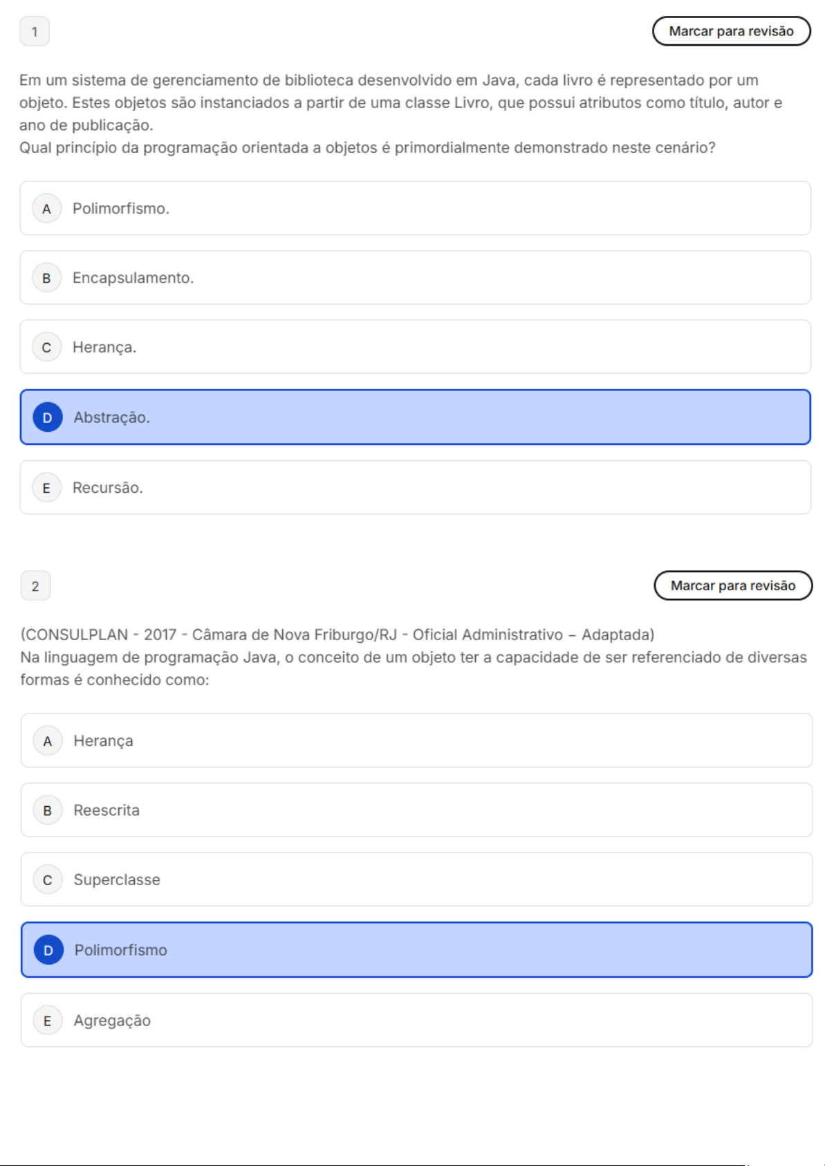 1 Marcar para revisão Em um sistema de gerenciamento de biblioteca desenvolvido em Java, cada livro é representado por um objeto. Estes objetos são instanciados a partir de uma classe Livro, que possui atributos como título, autor e ano de publicação. Qual princípio da programação orientada a objetos é primordialmente demonstrado neste cenário? A Polimorfismo. Encapsulamento. Herança. D Abstração. E Recursão. 2 Marcar para revisão (CONSULPLAN 2017 - Câmara de Nova Friburgo/RJ Oficial Administrativo - Adaptada) Na linguagem de programação Java, conceito de um objeto ter a capacidade de ser referenciado de diversas formas é conhecido como: A Herança B Reescrita C Superclasse D Polimorfismo E Agregação3 Marcar para revisão (COMPERVE - 2020 - TJ/RN - Analista de Sistemas Sênior - Adaptada) Analise trecho de código Java a seguir. public class MyClass { public static void main(String args[]) { int x=10; int y=25; z=x+y; = " + z); } } A partir da análise do código, observa-se que: A Será exibido um texto no console. código não compila. Será exibido endereço de memória do objeto. D Os modificadores de acesso não podem estar ocultos. E código compila, mas não mostra nada.4 Marcar para revisão (FUNDATEC 2018 - CIGA/SC Analista de Sistemas) Adaptada Para responder à questão, considere a Figura 11, que mostra um programa elaborado utilizando-se a linguagem de programação Java. Nessa Figura, inseriu-se, intencionalmente, um retângulo no local apontado pela seta 2, de modo a ocultar qualquer código fonte existente nesse local. package ciga: import public class public static void arga) String repetir 1 int valorB, calculor while 2 valorB calculo valorBr (mull, "Valor: calculo): ("Digite > para Figura 11 Programa em Java A Figura 11 mostra um programa em Java que permite realizar, repetidamente, determinada multiplicação e apresentar o seu resultado, enquanto conteúdo da variável "repetir" for "SIM", independente de ser maiúscula ou minúscula. Para que esse programa funcione adequadamente e possa ser encerrado corretamente, basta que no local apontado pela seta n° 1 exista, apenas, seguinte código fonte: 1. while (repetir == "SIM") { 2. while { 3. while { Quais estão corretas? A Apenas I. Apenas II. Apenas e II. D Apenas e III. E I, e III.5 Marcar para revisão Ano: 2018 Banca: FAURGS Órgão: BANRISUL Prova: FAURGS - 2018 BANRISUL - Desenvolvimento de Sistemas polimorfismo em Java é um conceito fundamental da programação orientada a objetos que permite que objetos de diferentes classes sejam tratados como instâncias de uma classe comum. Considere as afirmações abaixo sobre polimorfismo na linguagem de programação JAVA. I. A vinculação tardia ocorre se compilador escolher um método dentre os possíveis candidatos. II. polimorfismo indica princípio de que 0 tipo real do objeto determina método a ser chamado. III. A vinculação antecipada ocorre se a escolha do método é feita quando programa está sendo executado. Quais afirmativas estão corretas? A Apenas I. Apenas II. C Apenas III. D Apenas e II. E I, e III.6 Marcar para revisão Ano: 2016 Banca: UFES Órgão: UFES Prova: UFES 2016 UFES Técnico de Tecnologia da Informação o polimorfismo é um conceito poderoso que, quando bem compreendido e aplicado, pode levar a um design de software mais limpo, mais modular e mais expansível. Considerando 0 conceito de polimorfismo, analise 0 programa composto pelas três classes abaixo e escrito em Java. public class ClasseBase public void metA() System.out.print public class ClasseDerivada extends ClasseBase public void metA() System.out.print public class TestMethod public static void main (String args ClasseBase obj1 = new ClasseBase obj2 = new ClasseDerivada(): ClasseDerivada obj3 = new obj2.metA(); A saída a ser impressa pelo programa é: A ClasseBase!ClasseDerivada! B C D E7 Marcar para revisão Ano: 2012 Banca: CESGRANRIO Órgão: Petrobras Prova: CESGRANRIO 2012 BR Distribuidora Profissional Júnior Formação Analista de Sistemas Ênfase em Java Crm e Web Nas linguagens orientadas a objeto, existe uma diferença entre a referência a um objeto e o valor do objeto. Em java, o operador == e o método equals, este definido para a classe Object, apresentam comportamento específico que tem relação com essa característica. Considere o exemplo de um código Java 6 a seguir. public class Questao public static volid main(String args) ( Integer a, b, d, f; char r3, String s; 1; b; 1; ( a.equals(b) ( a.equals(c) ( Executando-se esse código, em que é possível testar como comportamento exemplificado foi implementado para a classe Integer e o tipo int, a resposta impressa será: A SSSSS ssnns C snnns D nnsss E nssss8 Marcar para revisão Abaixo vê-se um trecho de programa em Java onde "Derivada" é subclasse de "Base". 1. public class Base 2. //Código oculto 3. protected void atualizarVarSub int valor 4. = valor; 5. 6.) A linha 4 é um exemplo de: A Downcasting. Upcasting. C Herança. D Referência para classe aninhada. E Erro de referenciação. 9 Marcar para revisão No Java Collections Framework (JCF), existem interfaces, classes abstratas e classes concretas que fornecem diferentes funcionalidades. Analise as afirmativas a seguir: I. ArrayList e LinkedList são classes concretas que implementam a interface List. II. HashMap é uma interface que precisa ser implementada pelo programador. III. AbstractSet é uma classe abstrata que fornece implementações parciais da interface Set. Assinale a alternativa correta: A Apenas está correta. Apenas Il está correta. C Apenas está correta. D le III estão corretas. E I, e III estão corretas.10 Marcar para revisão Ano: 2020 Banca: COMPERVE Órgão: TJ-RN Prova: COMPERVE 2020 TJ-RN Analista de Sistemas Sênior (ADAPTADA) Uma interface na linguagem Java é apenas um contrato que a classe deve cumprir com a interface que a implementa. Sobre interfaces na linguagem Java, é correto afirmar: A A