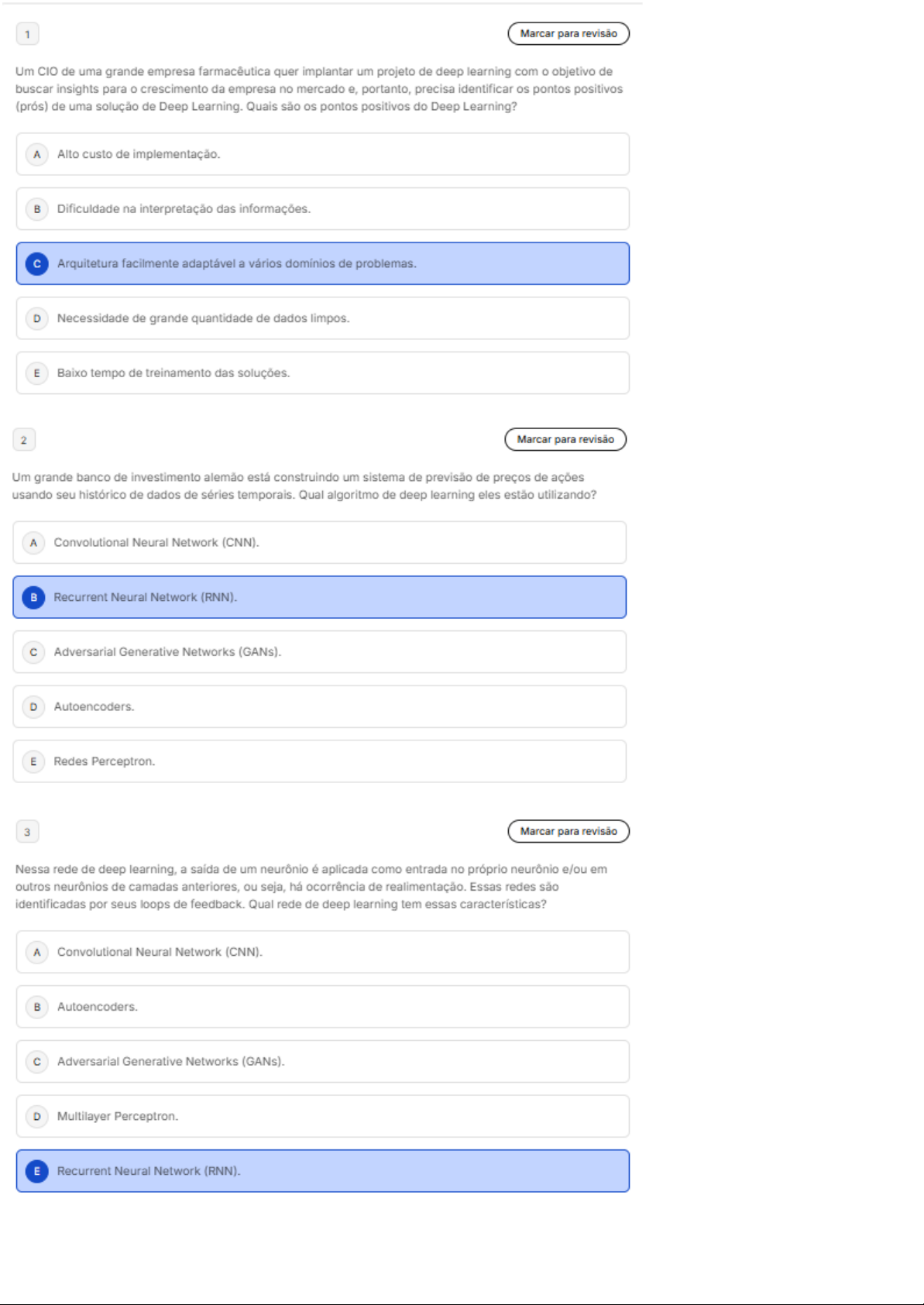 1 Marcar para revisão Um CIO de uma grande empresa farmacêutica quer implantar um projeto de deep learning com o objetivo de buscar insights para o crescimento da empresa no mercado e, portanto, precisa identificar os pontos positivos (prós) de uma solução de Deep Learning. Quais são os pontos positivos do Deep Learning? A Alto custo de implementação. Dificuldade na interpretação das informações. Arquitetura facilmente adaptável a vários domínios de problemas. D Necessidade de grande quantidade de dados limpos. E Baixo tempo de treinamento das soluções. 2 Marcar para revisão Um grande banco de investimento alemão está construindo um sistema de previsão de preços de ações usando seu histórico de dados de séries temporais. Qual algoritmo de deep learning eles estão utilizando? A Convolutional Neural Network (CNN). Recurrent Neural Network (RNN). C Adversarial Generative Networks (GANs). D Autoencoders. E Redes Perceptron. 3 Marcar para revisão Nessa rede de deep learning, a saída de um neurônio é aplicada como entrada no próprio neurônio e/ou em outros neurônios de camadas anteriores, ou seja, há ocorrência de realimentação. Essas redes são identificadas por seus loops de feedback. Qual rede de deep learning tem essas características? A Convolutional Neural Network (CNN). Autoencoders. C Adversarial Generative Networks (GANs). D Multilayer Perceptron. E Recurrent Neural Network (RNN).4 Marcar para revisão fato da área de visão computacional ter tanta popularidade, em especial, comercialmente, ocorre como uma demanda da sociedade para resolver problemas reais. Nesse sentido, selecione a opção correta que apresente um exemplo de aplicação de visão computacional que é muito útil no dia a dia das pessoas. A Reconhecer a veracidade das obras de arte Aplicações de reconhecimento facial em smartphones C Ampliação de imagens de propagandas D Realizar melhoramentos nas imagens E Causar sensações de vertigens em jogos de realidade virtual 5 Marcar para revisão Logo nos primórdios dos estudos sobre visão computacional, os pesquisadores fizeram uma descoberta fundamental para a evolução da área. Nesse sentido, selecione a opção correta sobre essa descoberta. A único processo de visão que pode ser reproduzido é do ser humano processo de visão é hierárquico C A visão é um sistema simples D É impossível reproduzir as etapas que envolvem a visão computacional E A visão computacional é baseada exclusivamente em operações matemáticas 6 Marcar para revisão No dia a dia de qualquer projeto de desenvolvimento é necessário preocupar-se com a qualidade e posterior manutenção dos códigos. Isso também ocorre em aplicações de visão computacional. Por isso mesmo, é tão importante uso de frameworks. Nesse sentido, selecione a opção correta que apresente uma vantagem de usar frameworks para desenvolver aplicações de visão computacional. A Padronizar o desenvolvimento com estruturas padrões de código B Trabalhar exatamente como as bibliotecas C Utilizar os melhores algoritmos de visão computacional D Oferecer garantia de suporte sempre que houver algum bug de funcionalidade E Aumentar a quantidade de código para priorizar a manutenção posteriormenteAo inspecionarmos as classes gramaticais de um conjunto de palavras, estamos passando para nosso algoritmo a noção de estrutura, de regras e composição linguística. Tal técnica pertence à área de análise sintática, permitindo a extração de A POS-Tags Tokens C Segmentos D Lemas E SOP-Tags 8 Marcar para revisão Dentro do processamento de linguagem natural temos uma subdivisão de áreas de especialização, ou tarefas que procuram entender: a estrutura do texto, sentido passado nas mensagens, e referências e co-referências. São assim chamadas então respectivamente de: A Análise Sintática, Análise Semântica, e Análise Pragmática Análise Sintática, Análise Pragmática, e Análise Semântica C Análise Sintática, Análise Clínica, e Análise Pragmática D Análise Univariável, Análise Semântica, e Análise Pragmática E Análise Sintática, Análise Semântica, e Análise de Predicados 9 Marcar para revisão A IA Generativa está transformando o processo de desenvolvimento de software, mudando 0 foco das tarefas que consomem o tempo dos programadores. Qual das seguintes opções descreve melhor a principal mudança no foco do desenvolvedor com a ascensão da IA Generativa? A Deixar de escrever qualquer linha de código Concentrar-se exclusivamente em tarefas de deploy e manutenção Mover o foco da escrita linha a linha para a orquestração, refinamento e validação do código. D Dedicar-se apenas à gestão de projetos e equipes E Ignorar a IA e continuar com os métodos tradicionais de programação10 Marcar para revisão (Adaptada de CONCURSO PÚBLICO BANCO DO BRASIL CESGRANRIO 2023) A capacidade de uma Inteligência Artificial Generativa para criar um formulário funcional é um avanço significativo. No entanto, o contexto de uso do formulário, incluindo sua integração com sistemas existentes, exige atenção especializada do desenvolvedor. Considere que um formulário de cadastro foi gerado por uma IA. Qual das seguintes tarefas é mais provável que exija uma intervenção humana substancial e um conhecimento aprofundado do sistema existente? A Inserir um novo campo de texto simples no formulário Alterar a cor de um botão no formulário Integrar o formulário gerado com um sistema de autenticação de usuários e um banco de dados legado D Corrigir um erro de digitação no rótulo de um campo E Mudar o tipo de fonte utilizada nos títulos do formulárioGabarito da prova Nota Confira gabarito da prova de Inteligência Artificial Para Devs 0,8/ 1,0 Realizada em 22/01/2026 o conteúdo do gabarito é apresentado de maneira resumida para preservar a integridade do nosso banco de questões. Questão Enunciado Sua resposta Resposta correta 