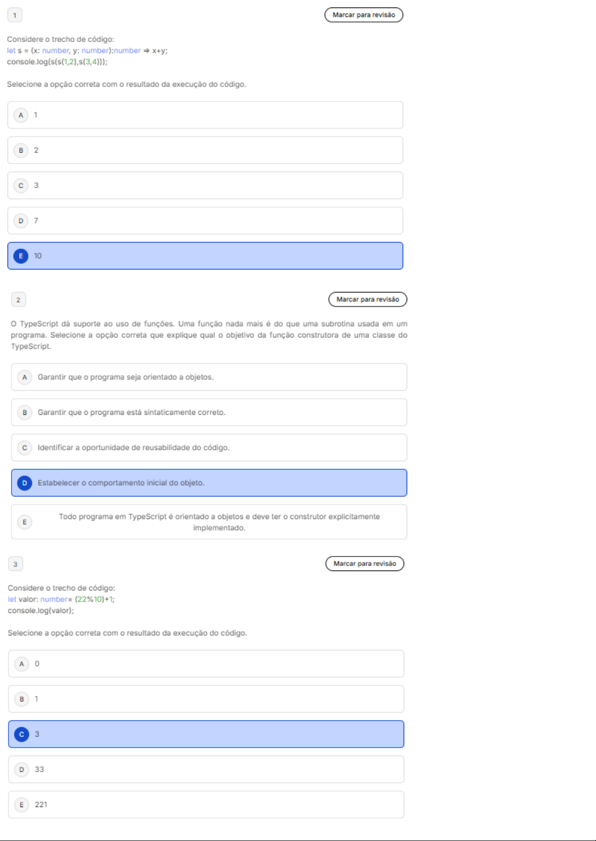 1 Marcar para revisão Considere o trecho de código: let = (x: number, y: number):number Selecione a opção correta com o resultado da execução do código. A 1 2 C 3 D 7 E 10 2 Marcar para revisão o TypeScript dá suporte ao uso de funções. Uma função nada mais é do que uma subrotina usada em um programa. Selecione a opção correta que explique qual objetivo da função construtora de uma classe do TypeScript. A Garantir que o programa seja orientado a objetos. Garantir que o programa está sintaticamente correto. C Identificar a oportunidade de reusabilidade do código. D Estabelecer o comportamento inicial do objeto. Todo programa em TypeScript é orientado a objetos e deve ter construtor explicitamente E implementado. 3 Marcar para revisão Considere o trecho de código: let valor: number= (22%10)+1; console.log(valor); Selecione a opção correta com o resultado da execução do código. A 0 B 1 3 D 33 E 2214 Marcar para revisão Considere trecho de código: function f1(msg: string, num: number): number { return msg+num; let tnum: number = 10; let tmsg: string = "10"; console.log(f1(tmsg, tnum)) Selecione a opção correta com resultado da execução do código. A "1010" 10 C 20 D "10" E "20" 5 Marcar para revisão Para trabalhar com as coleções do MongoDB a partir de um serviço Web, construído com base no NodeJS, devemos inicialmente obter uma conexão com a base de dados, através de um objeto do tipo MongoClient, oferecido na biblioteca mongodb. A partir da conexão, acessamos as coleções, e podemos utilizar os métodos que são disponibilizados por elas para manipulação e consulta de documentos. Qual desses métodos permite a inclusão de um documento? A insertOne persist C findOne D create E find6 Marcar para revisão Para diversas funcionalidades de um sistema ocorre a necessidade de um usuário válido, ou seja, deve haver algum meio de autenticação disponível. Em termos do Angular, acesso a uma rota pode ser controlado de forma simples, com base em um serviço para verificação de usuário que é associado às rotas privadas. Qual interface deve ser implementada pelo serviço? A Signin CanActivate C Authenticate D SignOut E VerifyUser 7 Marcar para revisão Partindo de uma iniciativa do Google, com foco no sistema Android, Material Design trouxe diretivas relacionadas ao design que se tornaram uma referência de mercado, visando sempre a garantia de usabilidade, responsividade e acessibilidade nas mais diversas plataformas. Além das diretivas estabelecidas, temos a especificação de componentes padronizados modelo para implementação em cada plataforma, como Android, Web, iOS e Flutter. Os componentes podem ser categorizados de acordo com seus objetivos, segundo essa classificação, qual das opções a seguir contém apenas elementos para comunicação, feita através da exibição de mensagens? A Card, Tabs e Dialog SnackBar, Banner e Dialog C TextField, Switch e Card D Button, Banner e List E SnackBar, Dialog e Tabs 8 Marcar para revisão Após a instalação das bibliotecas necessárias quando da configuração do ambiente, utiliza-se um comando para criar uma aplicação React, o Create React App, basicamente um script que configura um novo projeto. Após sua execução, que comando precisamos chamar para abrir nossa aplicação, considerando que estamos na pasta da referida aplicação? A npm init. npx create-react-app nome_app. C npm install. D npx start. E npm start.9 Marcar para revisão A partir da versão 16.8 do React, foi introduzido conceito de Hooks, que trouxe uma nova dinâmica. Avalie as assertivas relacionadas com a motivação de sua criação. I) Classes em React sempre foram uma forma confusa de utilizar, como por exemplo a utilização do this. Em componentes complexos, isso se tornava cada vez mais difícil sua reutilização. II) Componentes complexos e grandes eram difíceis de refatorar. III) A partir dessa versão, componentes de classes foram excluídas, forçando que todo o código antigo fosse refatorado. Quais são as afirmativas CORRETAS? A I, e III. III. II. D III. E Apenas a I. 10 Marcar para revisão Sobre React e suas características, assinale a alternativa correta: Biblioteca Javascript desenvolvida pelo Facebook. II. Utiliza o conceito de componentes, ajudando na construção de interfaces, facilitando na sua reutilização. III. Apesar de ser de código aberto, sua comunidade é muito pequena, pois muitos não aderiram a forma complexa de utilizar JSX. IV. Usado para desenvolvimento de interface tanto para usuários web quanto para mobile (React native). A e II, apenas. e III, apenas. I, e IV, apenas. D I, e IV, apenas. E III e IV, apenas.Gabarito da prova Nota Confira o gabarito da prova de Desenvolvimento De Front-end 1,0/1,0 Realizada em 22/01/2026 o conteúdo do gabarito é apresentado de maneira resumida para preservar a integridade do nosso banco de questões. Questão Enunciado Sua resposta Resposta correta Tema Consultar 1 Correta Considere trecho de 4 Programação cliente código: let = (x: 10 10 o ID: 65c4169b92547b2a79432b5c com TypeScript 2 Correta o TypeScript dá suporte Estabelecer Estabelecer o 4 Programação cliente ao uso de funções. Uma comportamento inicial comportamento inicial ID: 65b11655eccdbbbddeacc7d7 com TypeScript fun... do objeto. do objeto. 3 Correta Considere trecho de 4 Programação cliente código: let valor: 3 3 o ID: 65c418fc92547b2a79437439 com TypeScript number= 4 Correta Considere o trecho de 4 Programação cliente código: function "1010" "1010" ID: com TypeScript f1(msg: st... 5 Correta Para trabalhar com as coleções do MongoDB insertOne insertOne 5 Angular ID: 65b122abeccdbbbddeaf398f a partir... 6 Correta Para diversas funcionalidades de um CanActivate CanActivate 5 Angular o ID: sistema ocorre... 7 Correta Partindo de uma SnackBar, Banner e SnackBar, Banner e iniciativa do Google, 5 Angular o ID: 65b11fd2eccdbbbddeaeb2d6 Dialog Dialog com foco no 8 Correta Ap