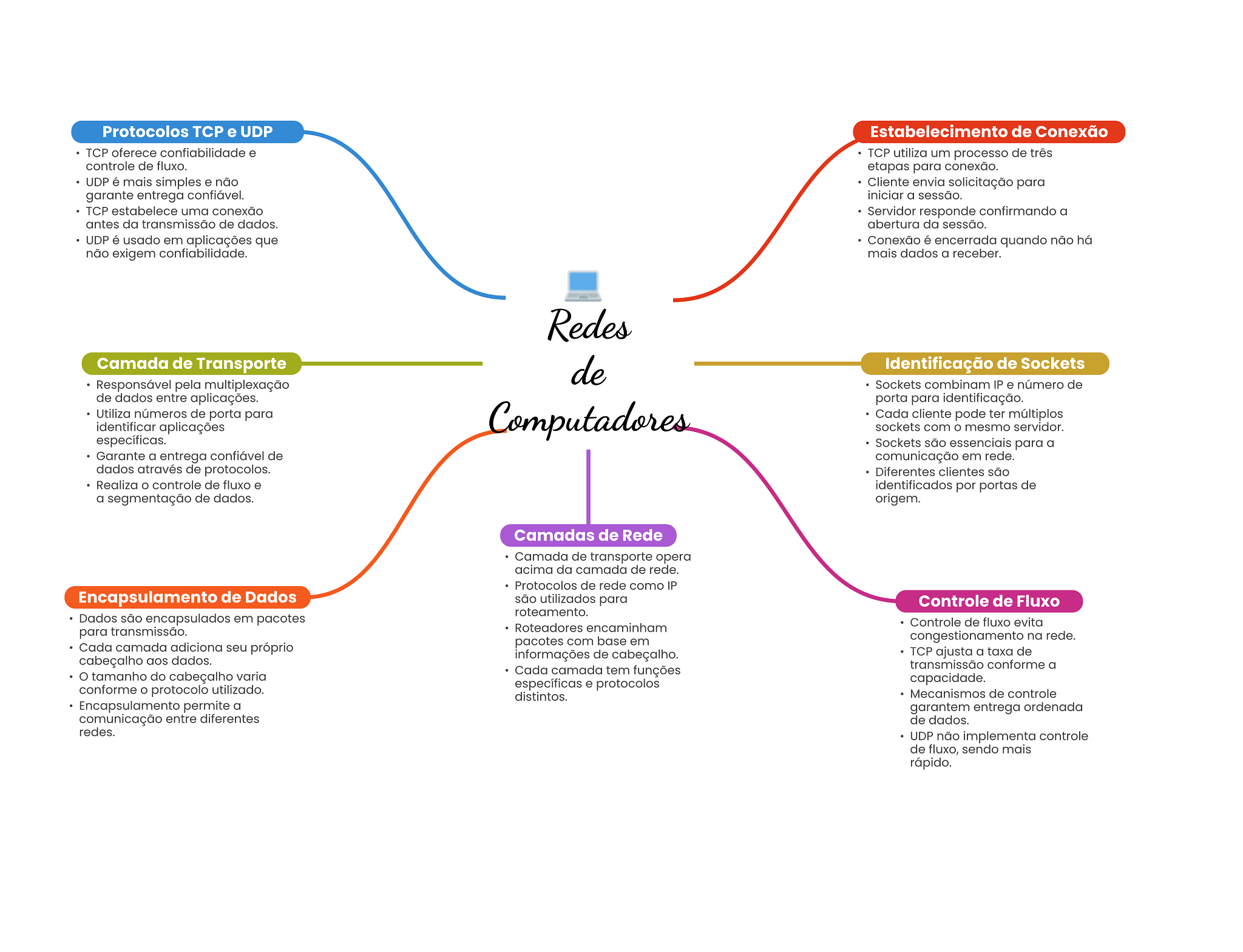 Protocolos e UDP Estabelecimento de Conexão TCP oferece confiabilidade e TCP utiliza um processo de três controle de fluxo. etapas para conexão. UDP é mais simples e não Cliente envia solicitação para garante entrega confiável. iniciar a sessão. TCP estabelece uma conexão Servidor responde confirmando a antes da transmissão de dados. abertura da sessão. UDP é usado em aplicações que Conexão é encerrada quando não há não exigem confiabilidade. mais dados a receber. Redes Camada de Transporte de Identificação de Sockets Responsável pela multiplexação Sockets combinam IP e número de de dados entre aplicações. porta para identificação. Utiliza números de porta para Computadores Cada cliente pode ter múltiplos identificar aplicações sockets com mesmo servidor. específicas. Sockets são essenciais para a Garante a entrega confiável de comunicação em rede. dados através de protocolos. Diferentes clientes são Realiza controle de fluxo e identificados por portas de a segmentação de dados. origem. Camadas de Rede Camada de transporte opera acima da camada de rede. Protocolos de rede como IP Encapsulamento de Dados são utilizados para Controle de Fluxo roteamento. Dados são encapsulados em pacotes Roteadores encaminham Controle de fluxo evita para transmissão. Cada camada adiciona seu próprio pacotes com base em congestionamento na rede. cabeçalho aos dados. informações de cabeçalho. TCP ajusta a taxa de transmissão conforme a tamanho do cabeçalho varia Cada camada tem funções específicas e protocolos capacidade. conforme protocolo utilizado. distintos. Mecanismos de controle Encapsulamento permite a garantem entrega ordenada comunicação entre diferentes de dados. redes. UDP não implementa controle de fluxo, sendo mais rápido.