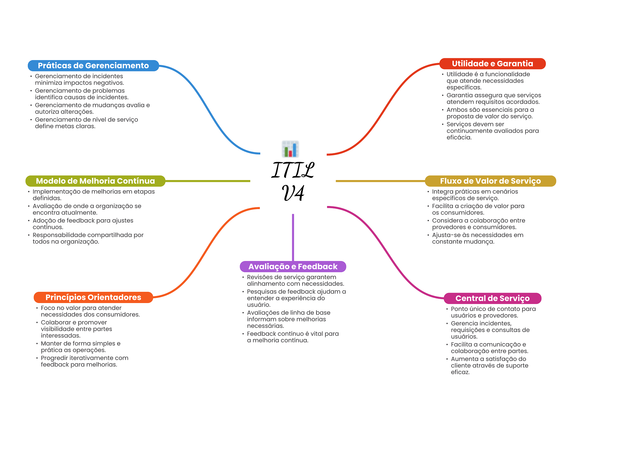 Práticas de Gerenciamento Utilidade e Garantia Gerenciamento de incidentes Utilidade é a funcionalidade minimiza impactos negativos. que atende necessidades Gerenciamento de problemas específicas. identifica causas de incidentes. Garantia assegura que serviços Gerenciamento de mudanças avalia e atendem requisitos acordados. autoriza alterações. Ambos são essenciais para a Gerenciamento de nível de serviço proposta de valor do serviço. define metas claras. Serviços devem ser continuamente avaliados para eficácia. ITIL Modelo de Melhoria Contínua Fluxo de Valor de Serviço Implementação de melhorias em etapas V4 Integra práticas em cenários definidas. específicos de serviço. Avaliação de onde a organização se Facilita a criação de valor para encontra atualmente. OS consumidores. Adoção de feedback para ajustes Considera a colaboração entre contínuos. provedores e consumidores. Responsabilidade compartilhada por Ajusta-se às necessidades em todos na organização. constante mudança. Avaliação e Feedback Revisões de serviço garantem alinhamento com necessidades. Pesquisas de feedback ajudam a Princípios Orientadores entender a experiência do Central de Serviço usuário. Foco no valor para atender Ponto único de contato para necessidades dos consumidores. Avaliações de linha de base informam sobre melhorias usuários e provedores. Colaborar e promover necessárias. Gerencia incidentes, visibilidade entre partes requisições e consultas de interessadas. Feedback contínuo é vital para usuários. a melhoria contínua. Manter de forma simples e Facilita a comunicação e prática as operações. colaboração entre partes. Progredir iterativamente com Aumenta a satisfação do feedback para melhorias. cliente através de suporte eficaz.