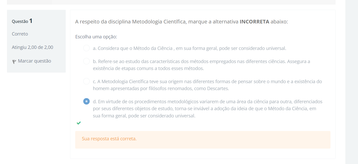 Questão 1 A respeito da disciplina Metodologia Científica, marque a alternativa INCORRETA abaixo: Correto Escolha uma opção: Atingiu 2,00 de 2,00 a. Considera que O Método da Ciência em sua forma geral, pode ser considerado universal. Marcar questão b. Refere-se ao estudo das características dos métodos empregados nas diferentes ciências. Assegura a existência de etapas comuns a todos esses métodos. C. A Metodologia Científica teve sua origem nas diferentes formas de pensar sobre mundo e a existência do homem apresentadas por filósofos renomados, como Descartes. d. Em virtude de os procedimentos metodológicos variarem de uma área da ciência para outra, diferenciados por seus diferentes objetos de estudo, torna-se inviável a adoção da ideia de que Método da Ciência, em sua forma geral, pode ser considerado universal. Sua resposta está correta.