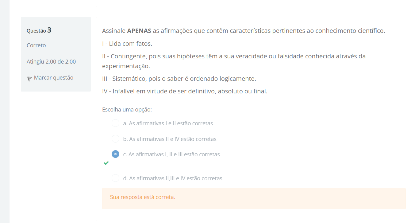 Questão 3 Assinale APENAS as afirmações que contêm características pertinentes ao conhecimento científico. Correto I Lida com fatos. - Contingente, pois suas hipóteses têm a sua veracidade ou falsidade conhecida através da Atingiu 2,00 de 2,00 experimentação. Marcar questão III Sistemático, pois saber é ordenado logicamente. IV Infalível em virtude de ser definitivo, absoluto ou final. Escolha uma opção: a. As afirmativas I e estão corretas b. As afirmativas e IV estão corretas C. As afirmativas I, e III estão corretas d. As afirmativas e IV estão corretas Sua resposta está correta.