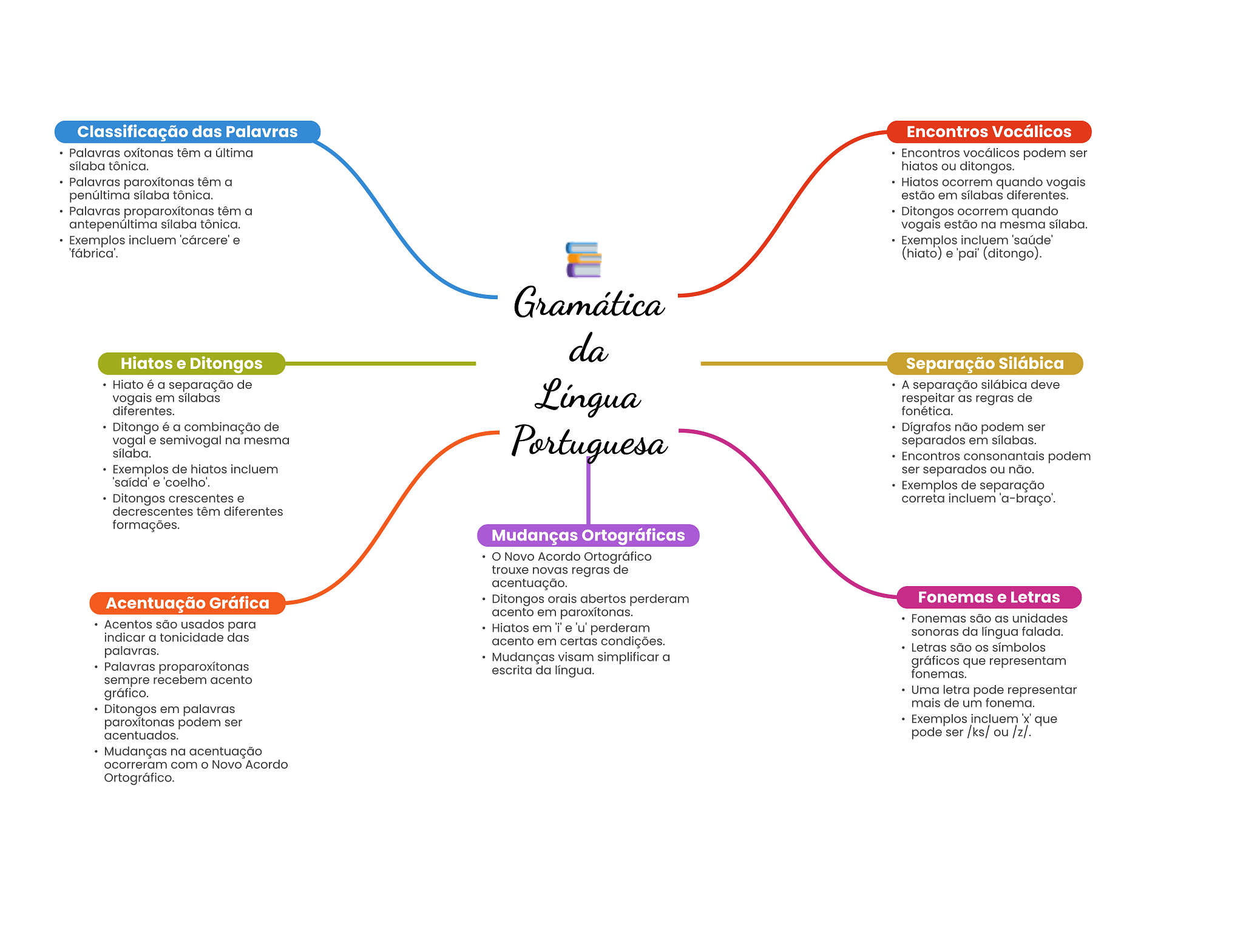 Classificação das Palavras Encontros Vocálicos Palavras oxítonas têm a última Encontros vocálicos podem ser sílaba tônica. hiatos ou ditongos. Palavras paroxítonas têm a Hiatos ocorrem quando vogais penúltima sílaba tônica. estão em sílabas diferentes. Palavras proparoxítonas têm a Ditongos ocorrem quando antepenúltima sílaba tônica. vogais estão na mesma sílaba. Exemplos incluem 'cárcere' e Exemplos incluem 'saúde' 'fábrica'. (hiato) e 'pai' (ditongo). Gramática da Hiatos e Ditongos Separação Silábica Hiato é a separação de Língua A separação silábica deve vogais em sílabas respeitar as regras de diferentes. fonética. Ditongo é a combinação de Dígrafos não podem ser vogal e semivogal na mesma sílaba. Portuguesa separados em sílabas. Encontros consonantais podem Exemplos de hiatos incluem ser separados ou não. e 'coelho'. Exemplos de separação Ditongos crescentes e correta incluem 'a-braço'. decrescentes têm diferentes formações. Mudanças Ortográficas Novo Acordo Ortográfico trouxe novas regras de acentuação. Acentuação Gráfica Ditongos orais abertos perderam Fonemas e Letras acento em paroxítonas. Fonemas são as unidades Acentos são usados para Hiatos em e 'u' perderam indicar a tonicidade das sonoras da língua falada. acento em certas condições. palavras. Letras são símbolos Mudanças visam simplificar a Palavras proparoxítonas gráficos que representam escrita da língua. fonemas. sempre recebem acento gráfico. Uma letra pode representar mais de um fonema. Ditongos em palavras paroxitonas podem ser Exemplos incluem 'x' que acentuados. pode ser /ks/ ou /z/. Mudanças na acentuação ocorreram com Novo Acordo Ortográfico.