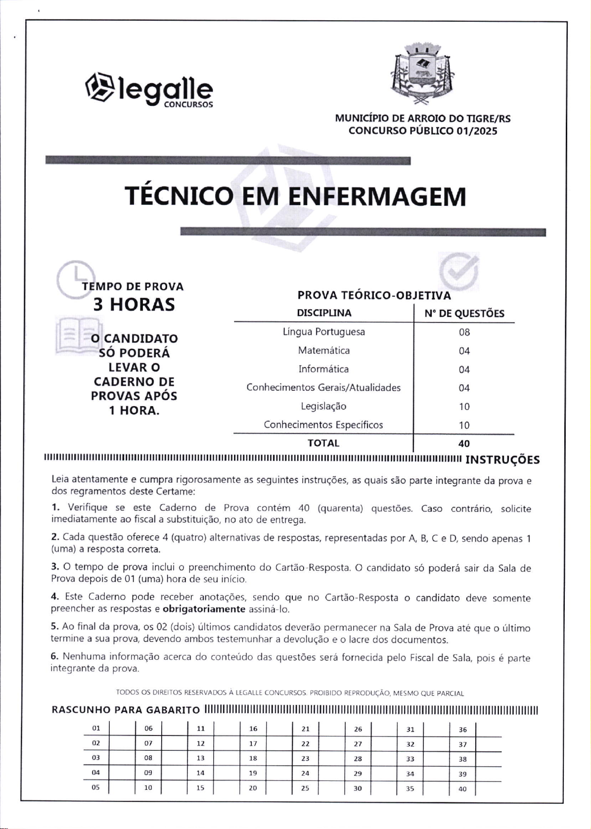 e Iegolle coNcuRsos TVTUHICÍPIO DE ARROIO DO TIGRVRS coNcuRso púsuco orlzozs TECNICO EM ENFERMAGEM TEMPO DE PROVA PRovA tgóRrco-oeletlva 3 HORAS u or quesrôes O CANDIDATO só poorRÁ TEVAR O CADERNO DE pRovls após 1 HORA. 08 04 04 04 '10 10 TOTAT 40 Leia atentãmente e cumpra rigorosamentê âs seguintes instruçóes, as quais são parte integrante da prova e dos regramentos deste Certame: Í, Verifique se este Caderno de Prova contem 40 (quarenta) questões. caso contrário, solicite imediatamente ao fiscal a substituiçâo, no ato de entrega. 2. Cada questão oíerece 4 (quatro) alternativas de respostal representadas por A, B, C e D, sendo apenas 1 (uma) a resposta correta. 3. o tempo de prova inclui o preenchimento do Cartão-Resposta. O candidato só poderá sair da Sala de Prova depois de 01 (uma) hora de seu início. 4. Este Cãderno pode receber anotaçÕes, sendo que no Cartão-Resposta o candidato deve somente preencher as respostas e obrigatoriamente assiná-lo. 5. Ao final da prova. os 02 (dois) últimos candidatos deverão permanecer na Sala de Prova até que o último termine a sua pÍova, devendo ambos testemunhar a devolução e o lacre dos documentos. 6. Nenhuma informação acerca do conteúdo das questÕes será fornecida pelo Fiscal de Sala, pois é parte integrânte da prova. Iooos os oIRT]IoS RTSIRVADOS A LL6ALLI CoNcURsos PRoIBIDo RTPRoDUçÀo MÉ5Mo QUE PARcIÀL RAscuNHo pARA GABARTTo lllllllllllllllllllllllllllllllllllllllllilllililililililililililililililililililiiiiiiiiiiiit 01 06 1l l6 2l 26 31 36 o2 ol o4 o7 l2 t1 22 2l l) 3t o8 ll l8 23 33 o9 14 24 l4 39 10 15 25 to 35 40 DISCIPUNA Língua Portuguesa Matemática Informática Conhecimentos Gerais/Atualidades Legislação Conhecimentos Específicos 19 29 o5 20 LiilGuA PORTUGUESA Questão 01. Qual alternativa preenche, CORRETA e respectivamente, as lacunas das linhas 41, 49 e 50? B C D à; a; porque orque. or que or que a; a, p ài à,p a,à.p Questão 02. O texto aborda a busca pela autenticidade e o valor dãs experiências pessoais em contraposição à necessidade de aprovação social. Nesse contexto, a principal reflexâo do autor está relacionada: (A) À importância de aprimorar habilidades técnicas em atividades cotidianas para obter reconhecimento social. (B) Ao incentivo para que as pessoas abandonem práticas que náo dominam, a Íim de evitar frustraçÕes pessoais. (C) À valorizaçáo do prazer e da espontaneidade em detrimento da cobrança por desempenho e perfeição. (D) À necessidade de seguir padrões culturais e estéticos que conduzem à aceitação social e à felicidade. Questão 03. Ao afirmar Há algo errado em saber Íazer bem o que não me desperta nenhuma emoção e não ser o melhoÍ naquilo quê me alegra? É claro que não tem nada anormal nisso (/.4548), o autor reforça uma ideia que perpassa todo o texto. O sentido dessa afirmaÇáo revela que: (A) A busca pela Íelicidade está associada ao desempenho técnico e à capacidade de transformar prazer em competência. (B) O verdadeiro valoÍ das ações humanas reside na emoçáo e na satisfaçáo pessoal, e náo na comparaçáo com o outro. (C) O aprendizado só é válido quando resulta em reconhecimento e aprovaçáo social. (D) O fracasso é inevitável quando se tenta desenvolver algo que não se domina tecnicamente. Questão 04. No contexto da formaçâo de palavras, cachorrinha (l 75) ê um exêmplo de palavra formada por: A) Derivaçáoregressiva B) DerivaÇáoimprópria. C) Derivaçâo preÍixal. D) Derivação suílxal. Quesüio 05. Quanto às formas nominais dos verbos em lingua portuguesa, é correto afirmar que Cozinhar (/.34 consiste em um verbo no _; por sua vez, cantando (/.53) está no _. Qual alternativa preenche, CORRETA e respectivamente, as lacunas? A) imperativo; acusativo B) particÍpio, gerúndio. C) infinitivo, particípio. D) infinitivo, gerúndio. Questão 06. No trecho Mas se tivesse que escolher entre beijar alguém ou dançar - ficaria na pista (/.33- 35), o autor utiliza a conjunção ou para expressar uma relaçáo entre duas açÕes possíveis no contexto da Írase. Considerando o valor semântico da coniunÇão, observa- se que o termo ou indica uma ideia de: (A) Alternância (B) Explicaçáo (C) Exclusão (D) Adição 2 PaÍa Íesponder às questões 01 a 08, leia o texto abaixo. Cante mal e dance pior ainda 1 Não existe receita para ser feliz, mas uma coisa é 2 certa: deixar de fazer algo que você gosta - por náo 3 ser tâo bom naquilo - é um grande erro. 4 O peso que a gente carrega da vergonha de ser 5 avaliado pelos outros é imenso. Quantas vezes você 6 deixou de postar algo que te gerava soÍrisos por tentar 7 imaginar o que os outros pensariam daquilo? 8 Alinhar a expectativa de terceiros nas nossas aÇÕes 9 tem tudo para ser um fracasso. Ora, se cada pessoa é 10 uma pessoa, nada mais natural que ser diÍerente e 1 'l tomar os caminhos que bem desejar. 12 Eu amo cantar. Frequentemente coloco karaokê na '13 televisão da sala e mesmo sem microfone me agarÍo 14 no cont[ole da televisão e apresento um show '15 particular para a minha cachorrinha Raposa (que aliás, 16 nunca demonstrou tanto interesse pelo espetáculo). Já 17 reparei que Íaço isso em dias que chego em casa 18 muito cansado ou tristonho por alguma coisa. 19 A música, de preferências as com letras em 20 português e que não são tão literais, me abastece de 2'l boas energias. Eu me conecto na força de cada 22 palawa numa tentativa de ar decifrando ou 23 ressignificando as cançÕes. 24 Mas eu canto MUITO mal. Essa é uma das minhas 25 maiores fruskaçÕes e é por isso que já pensei dezenas 26 de vezes ir para algum curso de canto e tentar 27 aTendeÍ alguma técnica que transforme meu canto 28 em algo bem agradável para quem estiver na sala. 29 Na dança eu invento passos desengonçados e sem 30 harmonia alguma. Meu samba é um pê pra lá e pÍa cá. 3'l Só tive sorte nas paqueÍas da juventude e