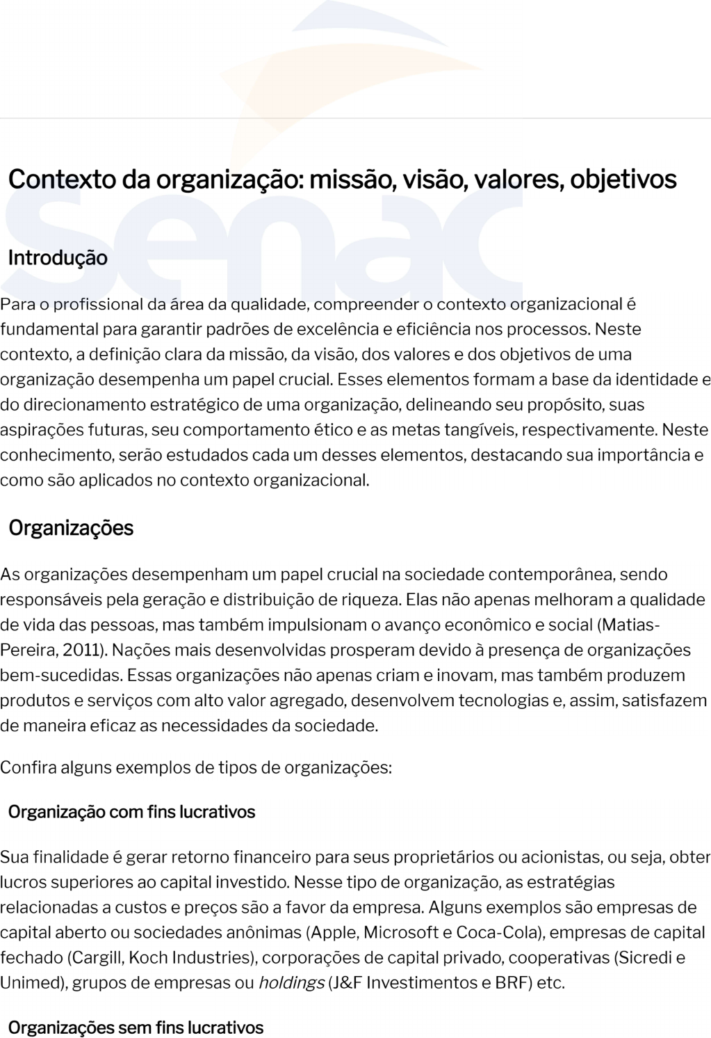 Contexto da organização: missão, visão, valores, objetivos Introdução Para profissional da área da qualidade, compreender contexto organizacional é fundamental para garantir padrões de excelência e eficiência nos processos. Neste contexto, a definição clara da missão, da visão, dos valores e dos objetivos de uma organização desempenha um papel crucial. Esses elementos formam a base da identidade e do direcionamento estratégico de uma organização, delineando seu propósito, suas aspirações futuras, seu comportamento ético e as metas tangíveis, respectivamente. Neste conhecimento, serão estudados cada um desses elementos, destacando sua importância e como são aplicados no contexto organizacional. Organizações As organizações desempenham um papel crucial na sociedade contemporânea, sendo responsáveis pela geração e distribuição de riqueza. Elas não apenas melhoram a qualidade de vida das pessoas, mas também impulsionam O avanço econômico e social (Matias- Pereira, 2011). Nações mais desenvolvidas prosperam devido à presença de organizações bem-sucedidas. Essas organizações não apenas criam e inovam, mas também produzem produtos e serviços com alto valor agregado, desenvolvem tecnologias e, assim, satisfazem de maneira eficaz as necessidades da sociedade. Confira alguns exemplos de tipos de organizações: Organização com fins lucrativos Sua finalidade é gerar retorno financeiro para seus proprietários ou acionistas, ou seja, obter lucros superiores ao capital investido. Nesse tipo de organização, as estratégias relacionadas a custos e preços são a favor da empresa. Alguns exemplos são empresas de capital aberto ou sociedades anônimas (Apple, Microsoft e Coca-Cola), empresas de capital fechado (Cargill, Koch Industries), corporações de capital privado, cooperativas (Sicredi e Unimed), grupos de empresas ou holdings (J&F Investimentos e BRF) etc. Organizações sem fins lucrativosSão criadas com propósito de fornecer um serviço específico à comunidade e dependem de contribuições de membros e doações para suas atividades. Diferentemente da anterior, as escolhas estratégicas desse tipo de organização são em favor da sociedade. Vale salientar que os fundos angariados não são distribuídos como lucro para os responsáveis pela gestão da organização. Alguns exemplos são as organizações não governamentais ONGs (Instituto Ayrton Senna), as organizações civis (Instituto Brasileiro de Defesa do Consumidor) e as fundações (Fundação Getulio Vargas). Organizações estatais São instituições públicas estabelecidas para executar a administração governamental de um país e incluem os ministérios, as secretarias e as agências de receita, por exemplo. As organizações têm características em comum, mas que podem variar com O tipo, tamanho e contexto em que operam. Segundo Bateman e Snell (2012), as principais características das organizações são: Estrutura hierárquica: Define os níveis de autoridade e responsabilidade, que auxilia na definição das relações de poder e na distribuição de tarefas dentro da organização. Atualmente, a maioria dos líderes corporativos está convencida de que uma estrutura organizacional com menos níveis hierárquicos resulta em uma empresa mais eficiente, ágil e economicamente eficaz. Divisão de trabalho: As tarefas em uma organização são divididas entre os membros da equipe de acordo com suas habilidades, seus conhecimentos e suas funções específicas. Isso ajuda a aumentar a eficiência e a produtividade. Coordenação e comunicação: As tarefas de uma empresa não podem ser completamente independentes, por isso, as organizações dependem de procedimentos de coordenação e comunicação para ligar as diversas equipes à realização da sua missão geral. Ambiente externo: A organização precisa adquirir, processar e reagir O grande volume de informações vindas das partes interessadas, ou seja, adaptar-se à demanda do ambiente externo, que é dinâmico, de forma eficaz, visando à sobrevivência e ao sucesso. Cultura organizacional: Representa normas, valores, crenças e comportamentos compartilhados pelos membros de cada organização. Ela orienta O comportamento profissional. Adaptação e mudança: Capacidade de se adaptar e mudar ao longo do tempo para enfrentar desafios e aproveitar oportunidades. A flexibilidade, a inovação e aprendizado com experiências passadas são essenciais para realizar com mais eficiência e eficácia as tarefas básicas e, também, para manter a vantagem sobre os competidores. Missão: é a razão de existir, propósito fundamental que guia as atividades e define O impacto da organização na sociedade. Ela reflete que a organização faz, para quem e como, fornecendo uma direção clara para suas operações. Visão: rRepresenta a aspiração futura da organização, descrevendo onde ela quer chegar a longo prazo. A visão é alvo de sucesso futuro, que motiva e inspira os membros da organização.Valores: São os princípios fundamentais e as crenças que orientam comportamento e as decisões da organização e de seus membros. Eles influenciam a cultura, as relações com partes interessadas, as políticas e práticas operacionais como um guia comportamental. Objetivos: São os resultados esperados que orientam as atividades da organização. Eles são relacionados aos níveis hierárquicos, geralmente quantificáveis e específicos, e podem estar ligados a produtividade, lucratividade, crescimento, impacto social, entre outros fatores. Mais adiante, neste mesmo conhecimento, você aprenderá mais detalhes sobre missão, visão, valores e objetivos. Antes, além das características previamente mencionadas, para abordar organizações, é fundamental conhecimento das partes interessadas. Tais partes englobam todos os elementos (indivíduos, instituições, grupos, entidades governamentais, entre outros) que, de al