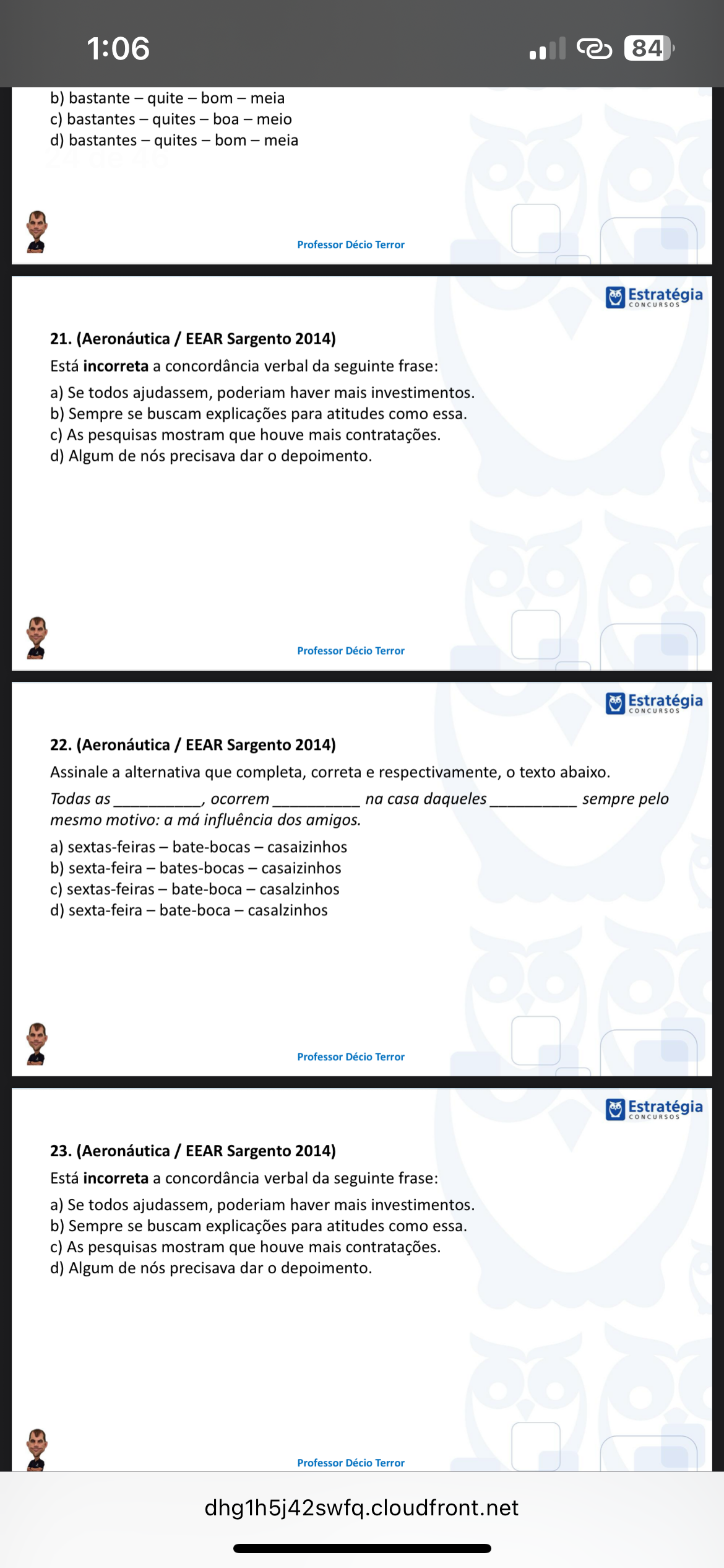 1:06 84 b) bastante - quite - bom meia c) bastantes - quites boa - meio d) bastantes - quites bom - meia Professor Décio Terror Estratégia CONCURSOS 21. (Aeronáutica / EEAR Sargento 2014) Está incorreta a concordância verbal da seguinte frase: a) Se todos ajudassem, poderiam haver mais investimentos. b) Sempre se buscam explicações para atitudes como essa. c) As pesquisas mostram que houve mais contratações. d) Algum de nós precisava dar o depoimento. Professor Décio Terror Estratégia CONCURSOS 22. (Aeronáutica / EEAR Sargento 2014) Assinale a alternativa que completa, correta e respectivamente, o texto abaixo. Todas as ocorrem na casa daqueles sempre pelo mesmo motivo: a má influência dos amigos. a) sextas-feiras - bate-bocas - casaizinhos b) sexta-feira bates-bocas - casaizinhos c) sextas-feiras bate-boca - casalzinhos d) sexta-feira - bate-boca - casalzinhos Professor Décio Terror Estratégia CONCURSOS 23. (Aeronáutica / EEAR Sargento 2014) Está incorreta a concordância verbal da seguinte frase: a) Se todos ajudassem, poderiam haver mais investimentos. b) Sempre se buscam explicações para atitudes como essa. c) As pesquisas mostram que houve mais contratações. d) Algum de nós precisava dar o depoimento. Professor Décio Terror dhg1h5j42swfq.cloudfront.net