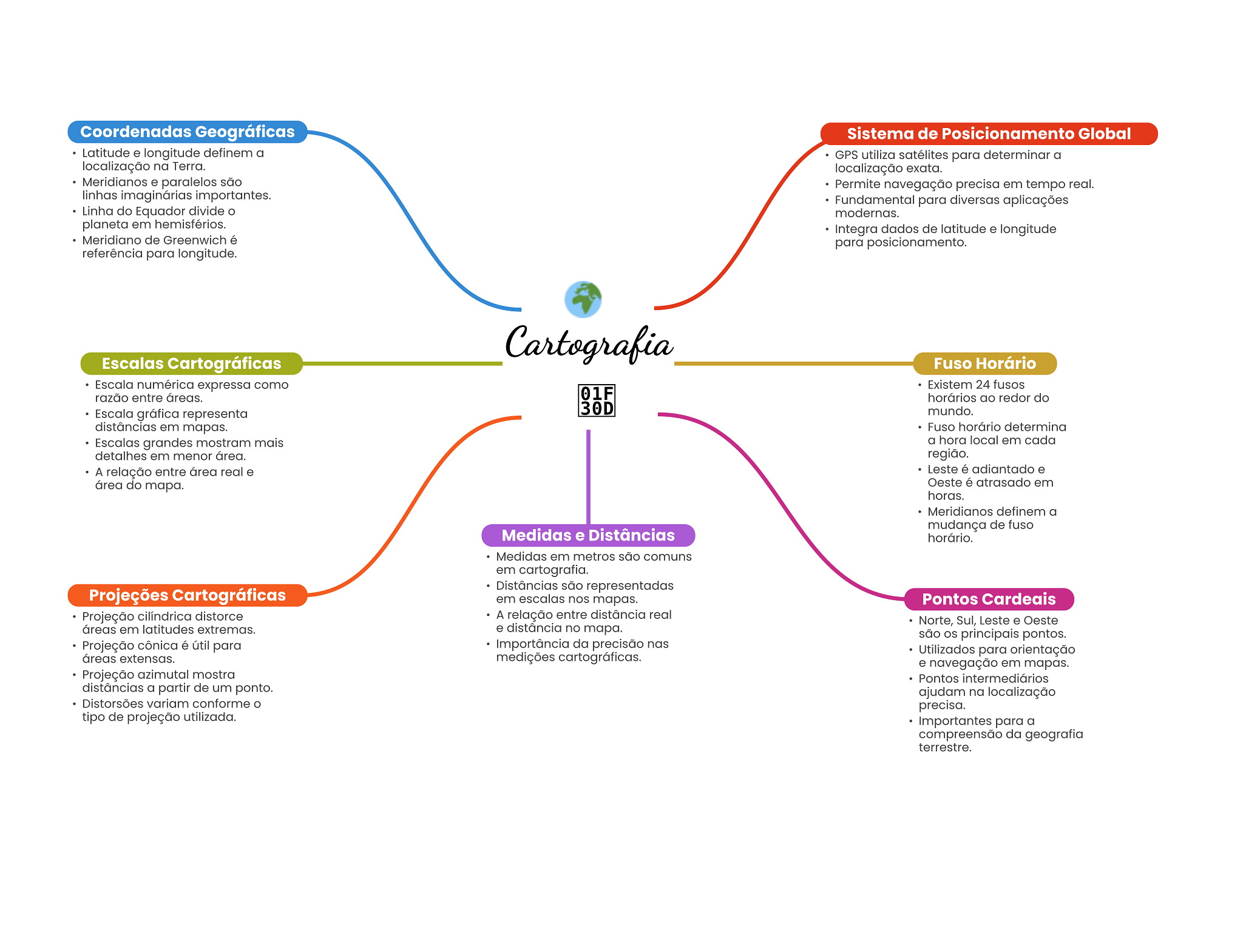 Coordenadas Geográficas Sistema de Posicionamento Global Latitude e longitude definem a GPS utiliza satélites para determinar a localização na Terra. localização exata. Meridianos e paralelos são Permite navegação precisa em tempo real. linhas imaginárias importantes. Fundamental para diversas aplicações Linha do Equador divide modernas. planeta em hemisférios. Integra dados de latitude e longitude Meridiano de Greenwich é para posicionamento. referência para longitude. Cartografia Escalas Cartográficas Fuso Horário Escala numérica expressa como Existem 24 fusos razão entre áreas. 01F horários ao redor do Escala gráfica representa 30D mundo. distâncias em mapas. Fuso horário determina Escalas grandes mostram mais a hora local em cada detalhes em menor área. região. A relação entre área real e Leste é adiantado e área do mapa. Oeste é atrasado em horas. Meridianos definem a mudança de fuso Medidas e Distâncias horário. Medidas em metros são comuns em cartografia. Distâncias são representadas Projeções Cartográficas em escalas nos mapas. Pontos Cardeais Projeção cilíndrica distorce A relação entre distância real Norte, Sul, Leste e Oeste áreas em latitudes extremas. e distância no mapa. são principais pontos. Projeção cônica é útil para Importância da precisão nas Utilizados para orientação áreas extensas. medições cartográficas. e navegação em mapas. Projeção azimutal mostra Pontos intermediários distâncias a partir de um ponto. ajudam na localização Distorsões variam conforme precisa. tipo de projeção utilizada. Importantes para a compreensão da geografia terrestre.