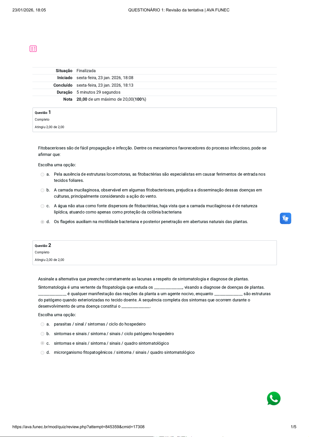 Situação Finalizada Iniciado sexta-feira, 23 jan. 2026, 18:08 Concluído sexta-feira, 23 jan. 2026, 18:13 Duração 5 minutos 29 segundos Nota 20,00 de um máximo de 20,00(100%) Questão 1 Completo Atingiu 2,00 de 2,00 Questão 2 Completo Atingiu 2,00 de 2,00 Fitobacerioses são de fácil propagação e infecção. Dentre os mecanismos favorecedores do processo infeccioso, pode-se afirmar que: Escolha uma opção: a. Pela ausência de estruturas locomotoras, as fitobactérias são especialistas em causar ferimentos de entrada nos tecidos foliares. b. A camada mucilaginosa, observável em algumas fitobacterioses, prejudica a disseminação dessas doenças em culturas, principalmente considerando a ação do vento. c. A água não atua como fonte dispersora de fitobactérias, haja vista que a camada mucilaginosa é de natureza lipídica, atuando como apenas como proteção da colônia bacteriana d. Os flagelos auxiliam na motilidade bacteriana e posterior penetração em aberturas naturais das plantas. Assinale a alternativa que preenche corretamente as lacunas a respeito de sintomatologia e diagnose de plantas. Sintomatologia é uma vertente da fitopatologia que estuda os _______________, visando a diagnose de doenças de plantas. _______________ é qualquer manifestação das reações da planta a um agente nocivo, enquanto _______________ são estruturas do patógeno quando exteriorizadas no tecido doente. A sequência completa dos sintomas que ocorrem durante o desenvolvimento de uma doença constitui o _______________. Escolha uma opção: a. parasitas / sinal / sintomas / ciclo do hospedeiro b. sintomas e sinais / sintoma / sinais / ciclo patógeno hospedeiro c. sintomas e sinais / sintoma / sinais / quadro sintomatológico d. microrganismo fitopatogênicos / sintoma / sinais / quadro sintomatológico 23/01/2026, 18:05 QUESTIONÁRIO 1: Revisão da tentativa | AVA FUNEC https://ava.funec.br/mod/quiz/review.php?attempt=845359&cmid=17308 1/5 Questão 3 Completo Atingiu 2,00 de 2,00 Questão 4 Completo Atingiu 2,00 de 2,00 Existe um tipo de patogenicidade, sem envolvimento de parasitismo, que é aquele encontrado na atuação de uma planta sobre outra, pela liberação de produtos tóxicos no meio, característica do fenômeno conhecido como Escolha uma opção: a. Amensalismo b. Alelopatia c. Mutualismo d. Neutralismo A ferrugem do cafeeiro provoca a queda precoce das folhas e seca dos ramos, afetando a produção do ano seguinte e provocando prejuízos durante os anos de alta produção das culturas. Essa doença é causada pelo seguinte fungo Escolha uma opção: a. Phakopsora pachyrhizi b. Uromyces phaseoli c. Hemileia vastatrix d. Puccinia polysora 23/01/2026, 18:05 QUESTIONÁRIO 1: Revisão da tentativa | AVA FUNEC https://ava.funec.br/mod/quiz/review.php?attempt=845359&cmid=17308 2/5 Questão 5 Completo Atingiu 2,00 de 2,00 Questão 6 Completo Atingiu 2,00 de 2,00 Assim como os animais, as plantas também são acometidas por doenças que podem atacar partes isoladas ou toda a planta. Fitopatologia é a ciência que estuda as doenças de plantas, abrangendo todos os seus aspectos, desde a diagnose, sintomatologia, etiologia, epidemiologia, até o seu controle. Um ramo da fitopalogia é a sintomatologia que estuda os sintomas e sinais que caracterizam uma determinada doença. Os ______________________ são estruturas do patógeno quando exteriorizadas no tecido doente, enquanto _________________ são reações da planta ante qualquer manifestação de agentes nocivos. Esses conceitos ajudam a identificar corretamente sintomas como ______________________, que é o escurecimento de tecido resultante da morte/desintegração de células, e ______________________, que é morte e desintegração de tecidos, decorrente da atividade enzimática de fitopatógenos. Assinale a alternativa que preenche, correta e respectivamente, as lacunas do trecho acima. Escolha uma opção: a. sinais – sintomas – necrose – podridão b. fungos – pústula – podridão – anasarca c. sintomas – fungos – anasarca – mosaico d. escleródios – expurgo – mancha púrpura – cancro Em fitopatologia existe uma definição sobre um tipo de dano causado por patógenos que se refere aos danos na capacidade futura de produção causada pelas doenças. Sendo este gênero de dano muito comum quando o patógeno é veiculado pelo solo ou disseminado por órgãos de propagação vegetativa de seu hospedeiro. Incluindo-se neste caso patógenos que debilitam seu hospedeiro. Este gênero de dano é o: Escolha uma opção: a. Primário b. Secundário c. Potencial d. Simples 23/01/2026, 18:05 QUESTIONÁRIO 1: Revisão da tentativa | AVA FUNEC https://ava.funec.br/mod/quiz/review.php?attempt=845359&cmid=17308 3/5 Questão 7 Completo Atingiu 2,00 de 2,00 Questão 8 Completo Atingiu 2,00 de 2,00 A fitopatologia tem como principal objetivo estudar os sintomas e sinais que caracterizam uma determinada doença na planta. Os sintomas são reações da planta (hospedeiro) ante qualquer manifestação de agentes nocivos. Uma doença muito comum em plantas apresenta os seguintes sintomas: “crescimento excessivo de tecidos epidérmicos e corticais, geralmente modificados pela ruptura e suberificação das paredes celulares, originando lesões salientes e ásperas, em frutos, tubérculos e folhas”. A doença de plantas à qual corresponde esse conjunto de sintomas é o/a Escolha uma opção: a. Pústula b. Necrose c. Tombamento d. Verrugose A sequência de procedimentos utilizados para se estabelecer a relação causal entre um microrganismo e uma doença é conhecida por Postulados de Koch (Robert Koch, 1881). Inicialmente a sequência foi utilizada para patógenos humanos, e foi adaptada posteriormente para a área fitopatológica. Com base nos Postulados de Koch, assinale a alternativa que apresenta a sequência correta desses procedimentos. Escolha uma opção: a. Associação constante patógeno-hospedeiro; iso