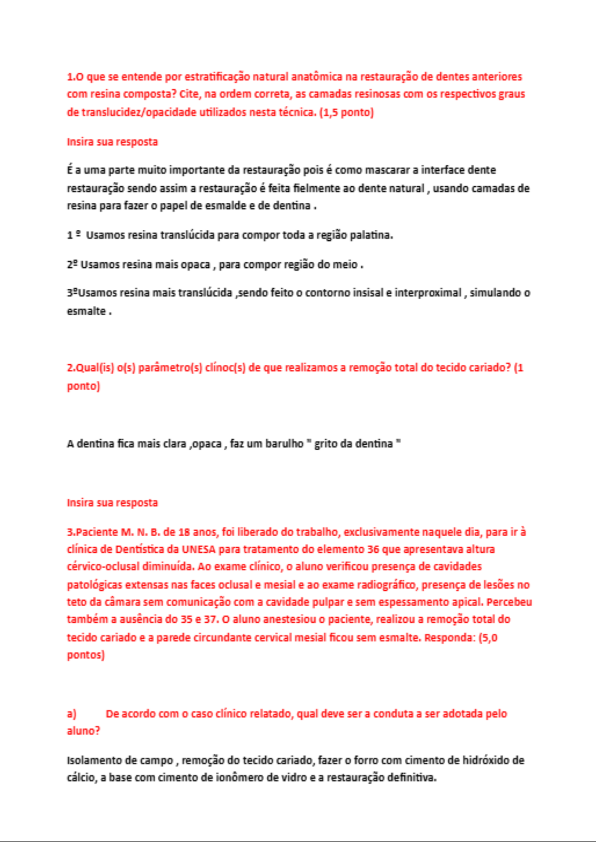 1.0 que se entende por estratificação natural anatômica na restauração de dentes anteriores com resina composta? Cite, na ordem correta, as camadas resinosas com 05 respectivos graus de translucidez/opacidade utilizados nesta técnica. (1,5 ponto) Insira sua resposta É a uma parte muito importante da restauração pois é como mascarar a interface dente restauração sendo assim a restauração é feita fielmente ao dente natural usando camadas de resina para fazer o papel de esmalde e de dentina Usamos resina translúcida para compor toda a região palatina. Usamos resina mais opaca para compor região do meio resina mais translúcida feito o contorno insisal e interproximal simulando 0 esmalte 2.Qual(is) o(s) parâmetro(s) clínoc(s) de que realizamos a remoção total do tecido cariado? (1 ponto) A dentina fica mais clara ,opaca faz um barulho grito da dentina Insira sua resposta 3.Paciente M.N.B. de 18 anos, foi liberado do trabalho, exclusivamente naquele dia, para ir à clínica de Dentística da UNESA para tratamento do elemento 36 que apresentava altura cérvico-oclusal diminuída. Ao exame clínico, 0 aluno verificou presença de cavidades patológicas extensas nas faces oclusal e mesial e ao exame radiográfico, presença de lesões no teto da câmara sem comunicação com a cavidade pulpar e sem espessamento apical. Percebeu também a ausência do 35 e aluno anestesiou paciente, realizou a remoção total do tecido cariado e a parede circundante cervical mesial ficou sem esmalte. Responda: (5,0 pontos) a) De acordo com 0 caso clínico relatado, qual deve ser a conduta a ser adotada pelo aluno? Isolamento de campo remoção do tecido cariado, fazer o forro com cimento de hidróxido de cálcio, a base com cimento de ionômero de vidro e a restauração definitiva.b) Quais brocas deverão ser utilizadas na confecção do preparo cavitário? Carbides em baixa rotação para dentina; Cilíndricas de ponta arredondada ou brocas pera longa para a caixa proximal; Brocas cilíndricas de ponta arredondada para ístimo. c) Existe a indicação de técnica do sanduíche fechado para esse caso? Justifique sua resposta. Sim. Porque não apresenta contato com a câmera pulpar e não tem sintomatologia dolorosa. d) Que tipo(s) de matriz e cunhas poderão ser usadas no caso em questão? Podem ser usadas matrizes e cunhas individuais e) Cite o(s) grampos a serem utilizados no caso. Justifique Insira sua resposta 26, W8A ou 14A Porque utilizamos esses grampos em casos de coroa clinicas curtas 4.Clasifique como Falso ou Verdadeiro as afirmativas abaixo, justificando suas opções: (2,5 pontos) a) 0 emprego da técnica do sanduíche como base em resinas posteriores extensas reduz 0 efeito deletério da contração de polimerização das resinas. V Porque a técnica do sanduíche efetua por meio da associação do ionômero de vidro com a resina composta, colaborando para a diminuição do efeito deletério da contração de polimerização de resinas b) Cimentos óxido de zinco e eugenol não devem ser empregados como restaurações provisórias previamente a confecção de restaurações com resinas compostas. V Porque ele é um inibidor de polímero dificultando a polimerização da resina compostac) 0 preparo cavitário para resinas posteriores deverá apresentar ângulo cavosuperficial nítido, sem bisel, e ângulos internos arredondados oriundos da utilização de brocas cilíndricas de ponta arredondadas em cavidades de ístmo de pequena extensão. F Porque nao usamos brocas cilíndricas e sim em forma de pera d) A introdução de um diluente na matriz orgânica de uma resina composta tem por função melhorar a moldabilidade do compósito. V Porque ele propõe mais viscosidade do material e atraves disso conseguimos dar forma a resina e) A propagação da lesão cariosa no esmalte em lesões de cicatrículas e fissuras apresenta formato de um triângulo com o vértice para a oclusal e nas lesões de lisas este triângulo apresenta a base voltada para a superfície externa do dente.Leitura Avançada V- Porque as lesões em cicatrículas e fissuras apresentam formato de triangulo com ápice voltado para oclusal porque seguem as direções dos prismas de esmalte e a mesma coisa acontece com lesões em lisas.1 Questão Acerto: 0,0 / 0,1 Indique instrumento rotatorio de eleição para remoção do tecido carlado e para acesso a lesao respectivamente. Pontas diamantadas esféricas, brocas cabides esféricas e colheres de dentina. Ponta diamantada esférica compativel com tamanho da cavidade, e colheres de dentina do maior para o menor tamanho. Brocas cabides esfericas e pontas diamantadas esféricas, com 0 tamanho da cavidade. Brocas carbides esféricas com o tamanho da cavidade, e colheres de dentina com o maior tamanho Pontas diamantadas esféricas e brocas carbides esféricas, compativeis com tamanho da cavidade. em 22/09/2022 20:18:59 Compare com a sua resposta: 2 Questão Acerto: 0,1 / 0,1 Qual o instrumento de eleição para realizar escultura em restaurações de amalgama dentário? Le cron Tofflemire Hollemback Brunidor n. 29 Espatula inserção n.1 3 Questão Acerto: 0,0 / 0,1 Qual das opções a apresenta que NÃO são utilizados para realização do isolamento absoluto. pinça porta grampo, grampo, arco de young, fio dental pinça porta grampo, grampo, arco de young, lençol de borracha pinça porta grampo, grampo, lençol de borracha, arco de otsby pinça porta grampo, grampo, lençol de borracha, matriz tofflemire pinça porta grampo, grampo, arco de young, barreira gengival 22/09/2022 Compare com a sua resposta: 4 Questão Acerto: 0,1 / 0,1 Quando realizamos uma restauração do tipo classe II em amalgama sabemos que os internos devem ser arredondados. Identifique qual o angulo abaixo é classificado com um angulo DIEDRO de 3 GRUPO. Axio pulpar pulpar Cavo superficial Disto vestibular Axio lingual Compare com a sua resposta: 5 Questão Acerto: 0,1 / 0,1 De acordo com a dos pre