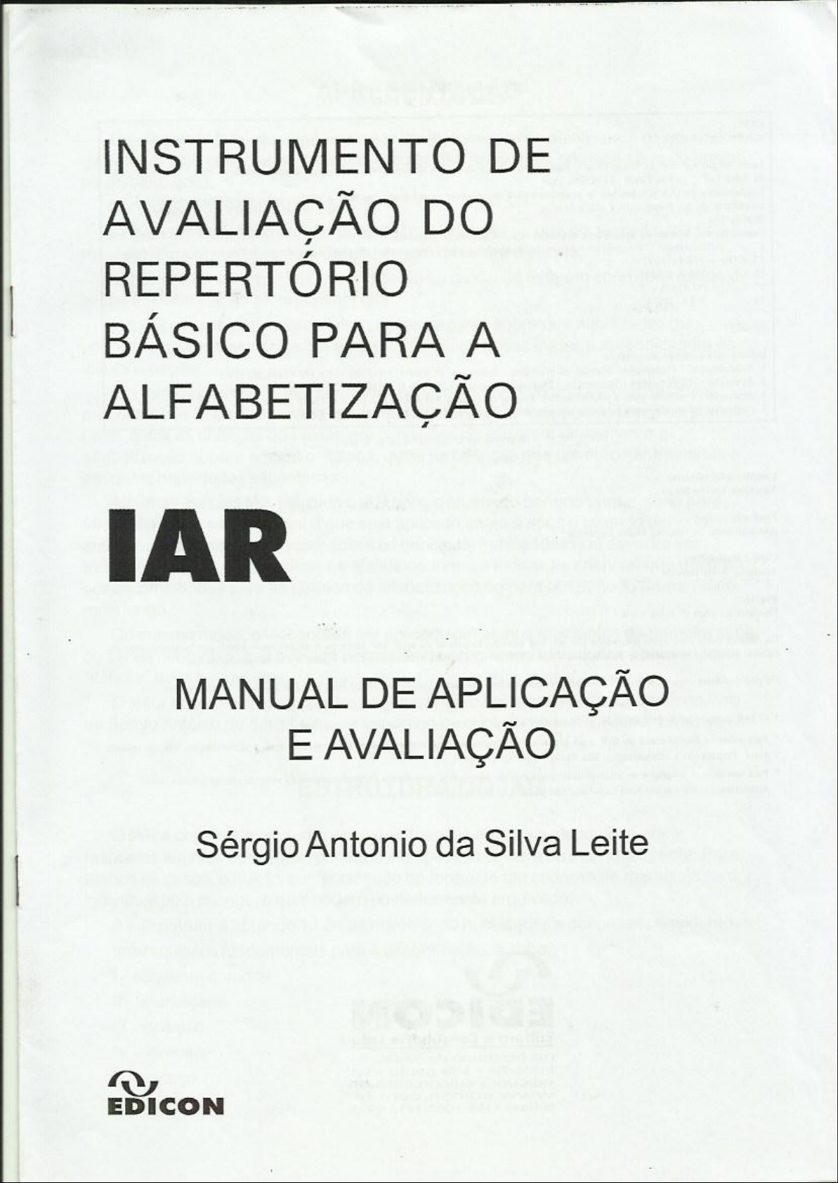 INSTRUMENTO DE AVALIAÇÃO DO REPERTORIO BÁSICO PARA A ALFABETIZAÇÃO IAR MANUAL DE APLICAÇÃO E AVALIAÇÃO Sérgio Antonio da Silva Leite EDICONAPRESENTAÇÃO presente IAR foi planejado para ser um instrumento de auxílio para os educadores que atuam com crianças da faixa pré-escolar (5-6 anos) e da primeira série do ensino de primeiro grau. Seus objetivos específicos são: a) avaliar o repertório comportamental das crianças no que diz respeito aos pré- requisitos fundamentais para a aprendizagem da leitura e escrita; b) possibilitar informações que indicarão se a criança está em condições ideais de iniciar a alfabetização propriamente dita; c) fornecer aos professores informações seguras sobre que habilidades ou conceitos deverão ser treinados para que a criança possa iniciar a aprendizagem da leitura e escrita. Em termos práticos, o IAR pode ser aplicado no início do ano escolar, tanto na primeira série (7 anos ou mais) como na pré-escola (6 anos), pois indicará no primeiro caso, quais as crianças que estão em condições de iniciarem diretamente a alfabetização e, para ambos os casos, quais as crianças que deverão ser treinadas e em quais habilidades específicas. Algumas escolas têm utilizado IAR após chamado período preparatório para formação de classes. ideal é que seja aplicado antes e após o referido período: antes, para orientar professor sobre as principais habilidades que deverão ser treinadas e após, para verificar os efeitos do treino e indicar as crianças que deverão ser encaminhadas para as classes de alfabetização ou para um período preparatório mais longo. Do mesmo modo, o IAR poderá ser aplicado em alunos repetentes da-primeira série ou séries diferentes, que possam necessitar de programas remediativos para suprir "déficits" de pré-requisitos. leitor encontrará exemplos de projetos onde o presente IAR foi aplicado, no livro de Sérgio Antônio da Silva Leite Preparando a alfabetização (EDICON, 1984). ESTRUTURA DO IAR IAR é constituído por uma série de situações em que 0 aluno deve emitir respostas escritas ou verbais, podendo ser aplicado coletiva ou individualmente. Para ambos os casos, IAR foi confeccionado na forma de um caderno de manuseio individual pela criança, 0 qual poderá posteriormente arquivado. A sua estrutura abrange 13 áreas envolvendo habilidades e conceitos considerados pré-requisitos fundamentais para a alfabetização, a saber: I esquema corporal II lateralidade III posição IV direção V espaço VI tamanho 3VII quantidade VIII forma IX discriminação visual X discriminação auditiva XI verbalização de palavras XII XIII coordenação motora fina Obviamente há outros pré-requisitos que poderiam ser incluídos, mas 0 critério foi ater- se aos realmente fundamentais. Cada área, por sua vez, apresenta uma série de exercícios com um número correspondente no início do mesmo. Deve-se ressaltar que em cada área consideraram-se os conteúdos finais teoricamente mais complexos, mas sem os quais aluno certamente encontrará dificuldades na aprendizagem da leitura e escrita. PROCEDIMENTOS PARA APLICAÇÃO COLETIVA A eficiência do IAR dependerá essencialmente do professor seguir exatamente as instruções Instruções gerais professor deverá aplicar o IAR em grupos de 10 a 15 alunos por vez, dispostos na sala de aula de tal forma que não consigam enxergar a folha do colega. Uma sugestão é deixar carteiras livres ao lado de cada criança. professor poderá contar com um auxiliar em sala de aula, caso julgue necessário. Cada criança deve estar munida de lápis preto, borracha e lápis de cor amarelo, vermelho e verde. A borracha pode ser utilizada livremente. professor não deve caracterizar a situação como uma prova, mas deve garantir que as crianças não olhem os cadernos dos companheiros. professor deve aplicar um exercício de cada área por vez, dando instruções no quadro negro, garantindo que todos entenderam as instruções. Nenhuma dica deve ser fornecida quanto à resposta correta. Se o aluno não souber, o professor deverá pedir para deixar a questão em branco. Instruções específicas: I Esquema corporal Antes de cada um dos três primeiros exercícios, professor deverá mostrar o lápis de cor correspondente, e pedir para que todas as crianças peguem e mostrem. Só então deverão seguir suas instruções. Deve-se lembrar que 0 exercício não avalia se o aluno reconhece cores. Os exercícios 4, 5 e 6, podem ser feitos com lápis preto, sendo que aluno pode utilizar a borracha livremente. 4Lateralidade Nos exercícios 1 e 2, a resposta de pintar não especifica a cor, podendo ficar a critério do aluno ou do professor. III Posição Os mesmos cuidados devem ser seguidos. Ressalte-se que cada exercício deve ser realizado seqüencialmente, sendo que nesta área, para cada dois exercícios há uma mesma série de desenhos. IV Direção Os mesmos cuidados devem ser seguidos. V Espaço professor deve explicar 0 que é "marcar com X" e "fazer uma bola em volta". Para tanto, poderá utilizar exemplos no quadro de forma a garantir que todos compreendam. VI Tamanho Os mesmos cuidados devem ser seguidos. VII Quantidade Os mesmos cuidados devem ser seguidos. VIII Forma Os mesmos devem ser seguidos. IX Discriminação visual Antes de iniciar 0 primeiro exercício, o professor deve relembrar para alunos os conceitos de "igual e diferente", utilizando exemplos de figuras na lousa. Nos exercícios 3, 4 e 6, professor deverá utilizar o exemplo descrito na folha e apresentá-lo na lousa, garantindo a compreensão dos alunos. Se necessário, deverá passar mais um exemplo. Após isto, cada aluno deverá resolver o seu. X Discriminação auditiva professor deverá iniciar cada exercício apresentando 0 exemplo na lousa, realizando-o junto com os alunos. Durante as instruções, o professor deve identificar cada desenho de cada tira, antes do aluno resolvê-la. XI Verbali