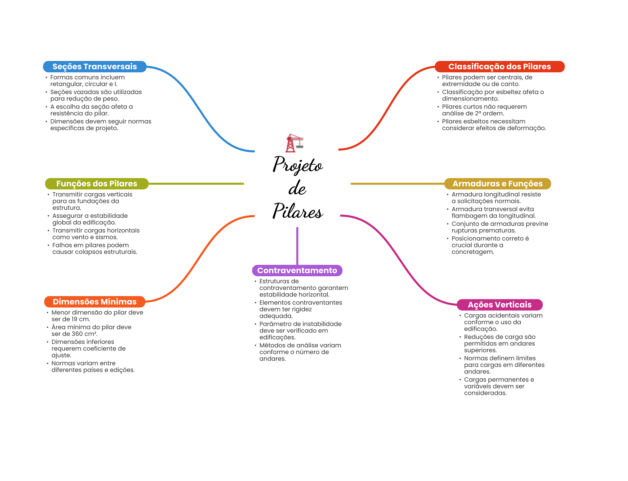 Seções Transversais Classificação dos Pilares Formas comuns incluem Pilares podem ser centrais, de retangular, circular e I. extremidade ou de canto. Seções vazadas são utilizadas Classificação por esbeltez afeta para redução de peso. dimensionamento. A escolha da seção afeta a Pilares curtos não requerem resistência do pilar. análise de ordem. Dimensões devem seguir normas Pilares esbeltos necessitam específicas de projeto. considerar efeitos de deformação. Projeto Funções dos Pilares de Armaduras e Funções Transmitir cargas verticais Armadura longitudinal resiste para as fundações da a solicitações normais. estrutura. Pilares Armadura transversal evita Assegurar a estabilidade flambagem da longitudinal. global da edificação. Conjunto de armaduras previne Transmitir cargas horizontais rupturas prematuras. como vento e sismos. Posicionamento correto é Falhas em pilares podem crucial durante a causar colapsos estruturais. concretagem. Contraventamento Estruturas de garantem estabilidade horizontal. Dimensões Mínimas Elementos contraventantes Ações Verticais Menor dimensão do pilar deve devem ter rigidez adequada. Cargas acidentais variam ser de 19 cm. Área mínima do pilar deve Parâmetro de instabilidade conforme uso da deve ser verificado em edificação. ser de 360 edificações. Reduções de carga são Dimensões inferiores Métodos de análise variam permitidas em andares requerem coeficiente de conforme O número de superiores. ajuste. andares. Normas definem limites Normas variam entre para cargas em diferentes diferentes países e edições. andares. Cargas permanentes e variáveis devem ser consideradas.
