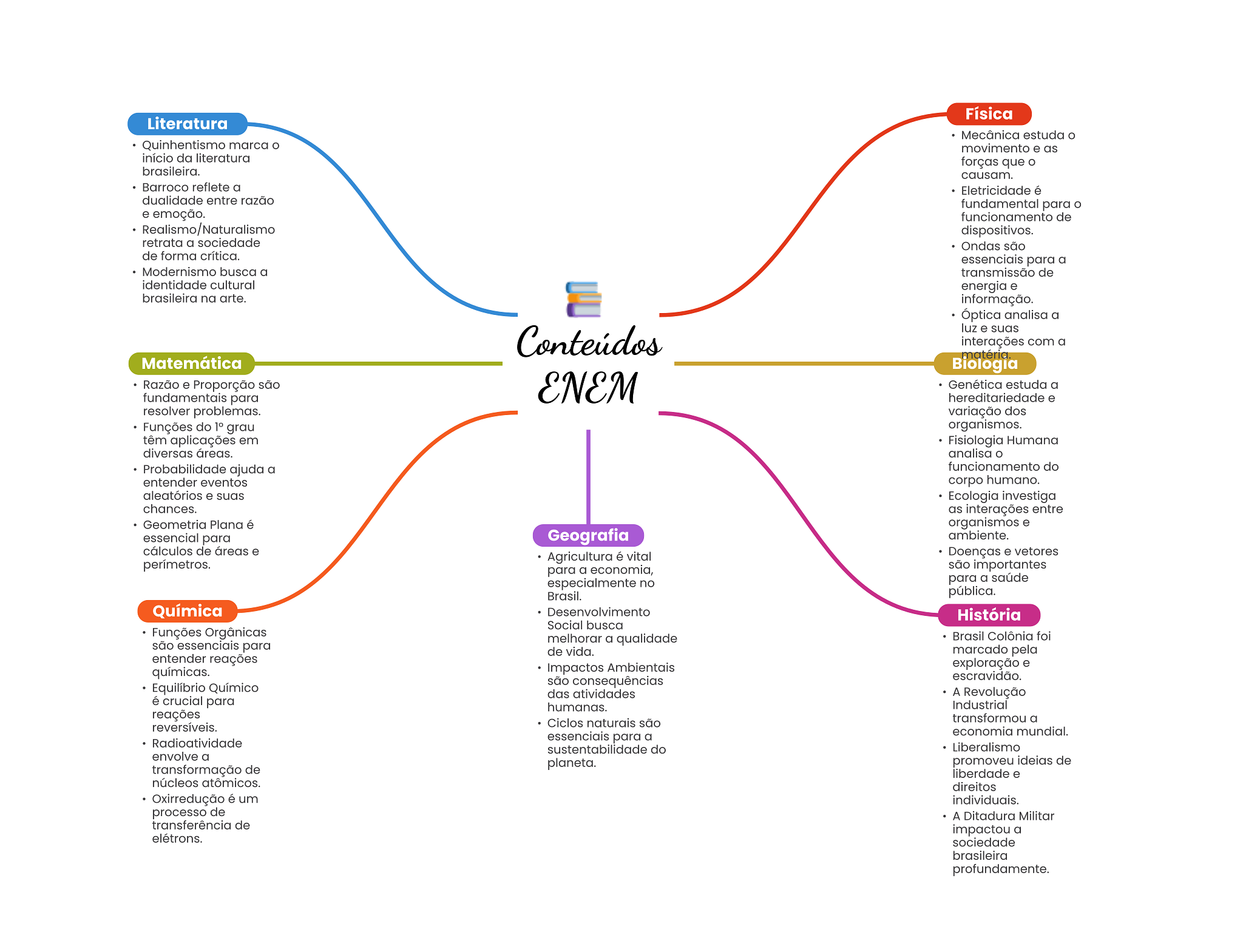 Física Literatura Mecânica estuda Quinhentismo marca movimento e as início da literatura forças que brasileira. causam. Barroco reflete a Eletricidade é dualidade entre razão fundamental para e emoção. funcionamento de dispositivos. retrata a sociedade Ondas são de forma crítica. essenciais para a Modernismo busca a transmissão de identidade cultural energia e brasileira na arte. informação. Óptica analisa a luz e suas Conteúdos interações com a matéria. Matemática Biologia Razão e Proporção são fundamentais para ENEM Genética estuda a hereditariedade e resolver problemas. variação dos Funções do grau organismos. têm aplicações em Fisiologia Humana diversas áreas. analisa O Probabilidade ajuda a funcionamento do entender eventos corpo humano. aleatórios e suas Ecologia investiga chances. as interações entre Geometria Plana é organismos e essencial para Geografia ambiente. cálculos de áreas e Agricultura é vital Doenças e vetores perímetros. para a economia, são importantes especialmente no para a saúde Brasil. pública. Química Desenvolvimento História Social busca Funções Orgânicas são essenciais para melhorar a qualidade Brasil Colônia foi de vida. marcado pela entender reações Impactos Ambientais exploração e químicas. escravidão. Equilíbrio Químico são consequências das atividades A Revolução é crucial para humanas. Industrial reações reversíveis. Ciclos naturais são transformou a Radioatividade essenciais para a economia mundial. sustentabilidade do Liberalismo envolve a transformação de planeta. promoveu ideias de liberdade e núcleos atômicos. direitos Oxirredução é um individuais. processo de A Ditadura Militar transferência de impactou a elétrons. sociedade brasileira profundamente.