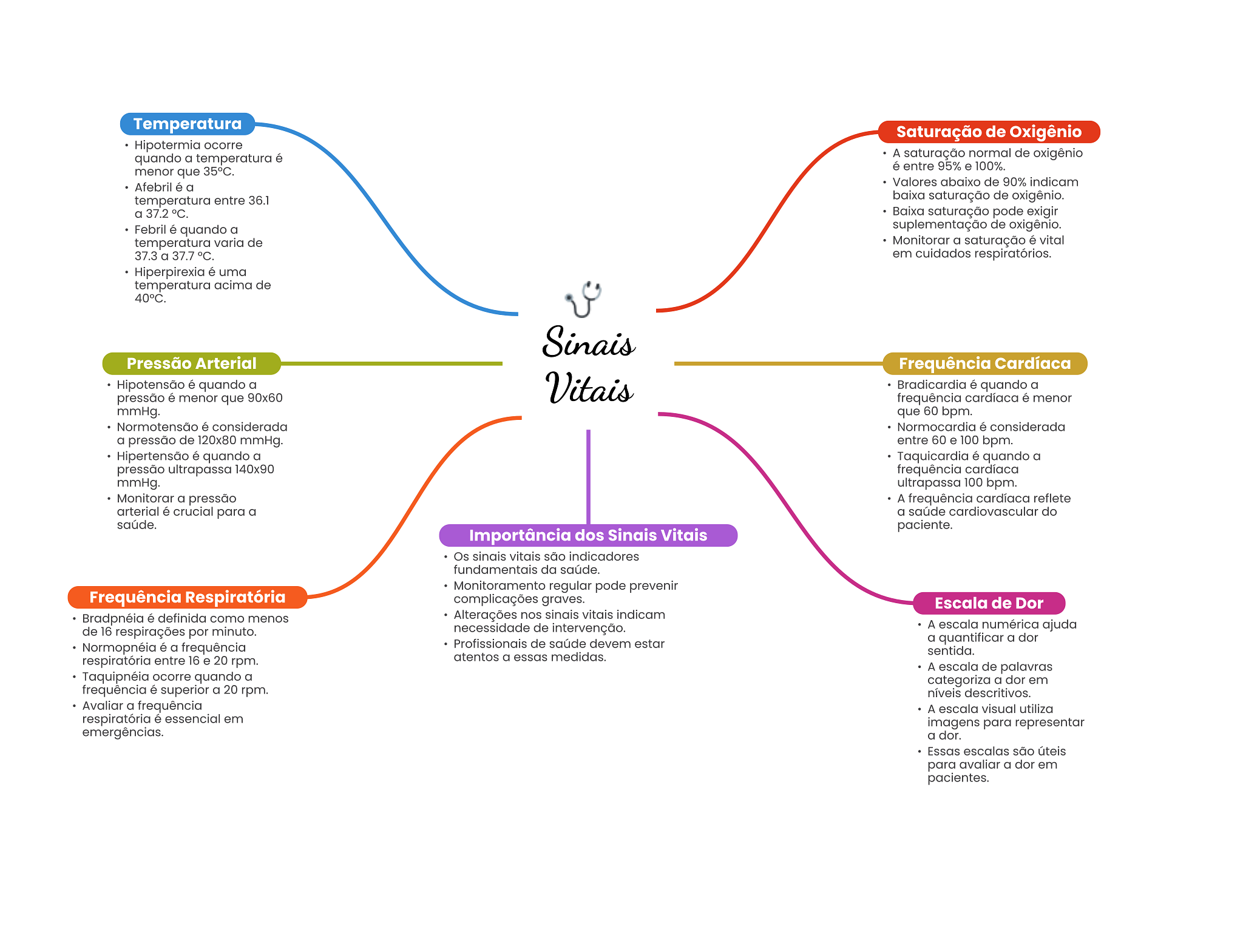 Temperatura Saturação de Oxigênio Hipotermia ocorre quando a temperatura é A saturação normal de oxigênio é entre 95% e 100%. menor que 35°C. Afebril é a Valores abaixo de 90% indicam temperatura entre 36.1 baixa saturação de oxigênio. Baixa saturação pode exigir Febril é quando a suplementação de oxigênio. temperatura varia de Monitorar a saturação é vital 37.3 a 37.7 °C. em cuidados respiratórios. Hiperpirexia é uma temperatura acima de 40°C. Sinais Pressão Arterial Frequência Cardíaca Hipotensão é quando a Vitais Bradicardia é quando a pressão é menor que 90x60 frequência cardíaca é menor mmHg. que 60 bpm. Normotensão é considerada Normocardia é considerada a pressão de 120x80 mmHg. entre 60 e 100 bpm. Hipertensão é quando a Taquicardia é quando a pressão ultrapassa 140x90 frequência cardíaca mmHg. ultrapassa 100 bpm. Monitorar a pressão A frequência cardíaca reflete arterial é crucial para a a saúde cardiovascular do saúde. paciente. Importância dos Sinais Vitais Os sinais vitais são indicadores fundamentais da saúde. Monitoramento regular pode prevenir Frequência Respiratória complicações graves. Escala de Dor Bradpnéia é definida como menos Alterações nos sinais vitais indicam de 16 respirações por minuto. necessidade de intervenção. A escala numérica ajuda Normopnéia é a frequência Profissionais de saúde devem estar a quantificar a dor sentida. respiratória entre 16 e 20 rpm. atentos a essas medidas. A escala de palavras Taquipnéia ocorre quando a categoriza a dor em frequência é superior a 20 rpm. níveis descritivos. Avaliar a frequência A escala visual utiliza respiratória é essencial em imagens para representar emergências. a dor. Essas escalas são úteis para avaliar a dor em pacientes.