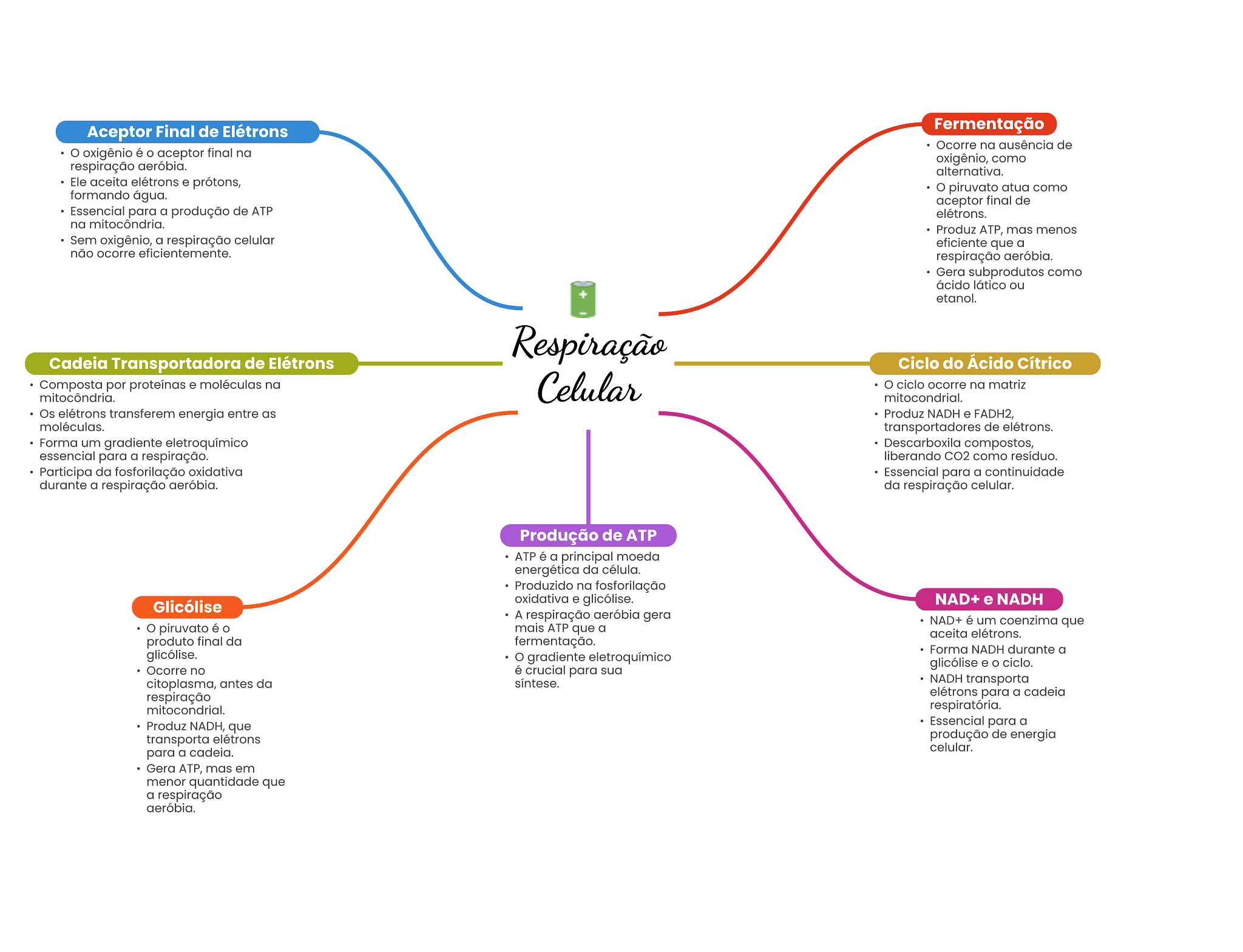 Aceptor Final de Elétrons Fermentação Ocorre na ausência de oxigênio é aceptor final na oxigênio, como respiração aeróbia. alternativa. Ele aceita elétrons e prótons, O piruvato atua como formando água. aceptor final de Essencial para a produção de ATP elétrons. na mitocôndria. Produz ATP, mas menos Sem oxigênio, a respiração celular eficiente que a não ocorre eficientemente. respiração aeróbia. Gera subprodutos como ácido lático ou etanol. Respiração Cadeia Transportadora de Elétrons Ciclo do Ácido Cítrico Composta por proteínas e moléculas na Celular ciclo ocorre na matriz mitocôndria. mitocondrial. Os elétrons transferem energia entre as Produz NADH e FADH2, moléculas. transportadores de elétrons. Forma um gradiente eletroquímico Descarboxila compostos, essencial para a respiração. liberando CO2 como resíduo. Participa da fosforilação oxidativa Essencial para a continuidade durante a respiração aeróbia. da respiração celular. Produção de ATP ATP é a principal moeda energética da célula. Produzido na fosforilação Glicólise oxidativa e glicólise. NAD+ e NADH A respiração aeróbia gera NAD+ é um coenzima que piruvato é mais ATP que a aceita elétrons. produto final da fermentação. glicólise. Forma NADH durante a gradiente eletroquímico Ocorre no é crucial para sua glicólise e ciclo. citoplasma, antes da síntese. NADH transporta respiração elétrons para a cadeia mitocondrial. respiratória. Produz NADH, que Essencial para a transporta elétrons produção de energia para a cadeia. celular. Gera ATP, mas em menor quantidade que a respiração aeróbia.