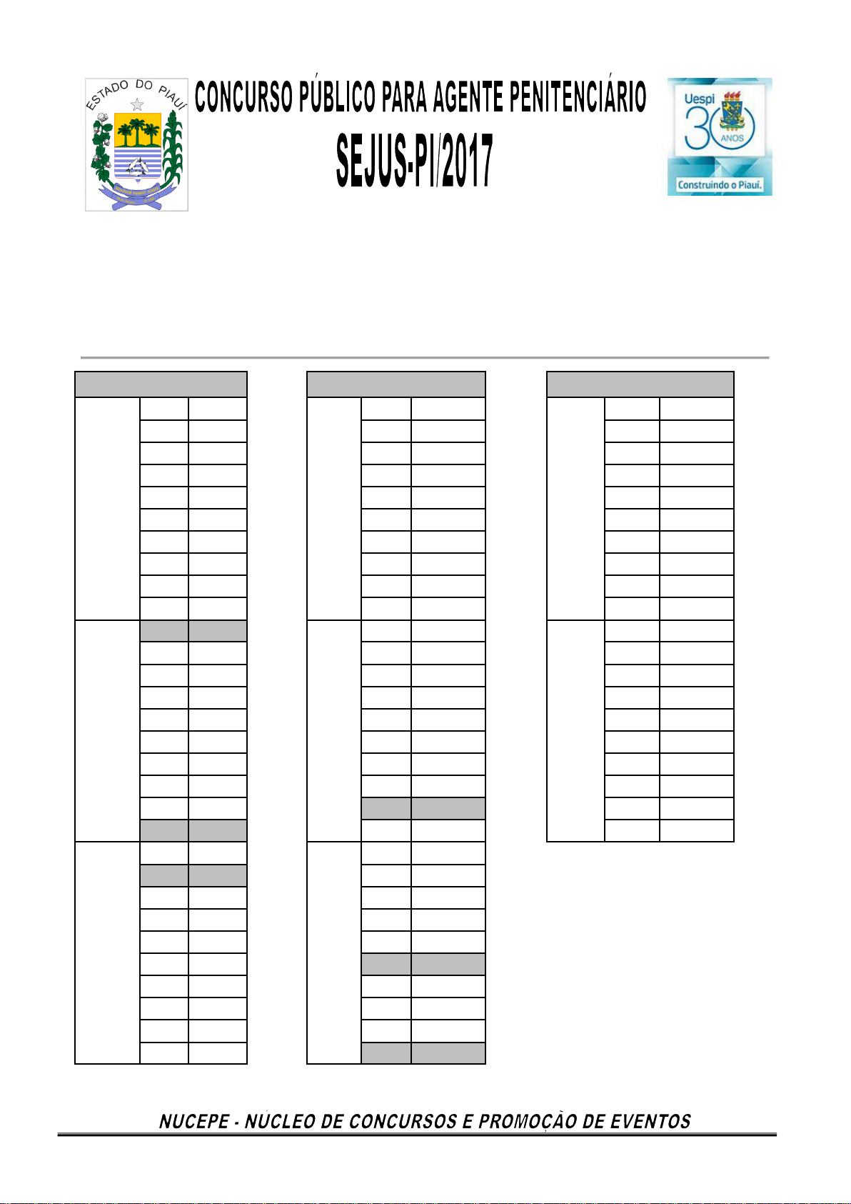G A B A R I T O CONCURSO PÚBLICO – SEJUS/PI - 2017 – CARGO: AGENTE PENITENCIÁRIO Universidade Estadual do Piauí CARGO: AGENTE PENITENCIÁRIO DATA: 04/04/2017 DISCIPLINAS DISCIPLINAS DISCIPLINAS L ÍN G U A P O R T U G U E S A 01 C N O Ç Õ E S D E D IR E IT O A D M IN IS T R A T IV O 31 D N O Ç Õ E S D E D IR E IT O P R O C E S S U A L P E N A L 61 B 02 A 32 B 62 D 03 C 33 E 63 D 04 B 34 B 64 D 05 E 35 A 65 C 06 B 36 C 66 D 07 D 37 A 67 B 08 B 38 E 68 B 09 C 39 D 69 B 10 A 40 C 70 C N O Ç Õ E S D E I N F O R M Á T IC A 11 NULA N O Ç Õ E S D E D IR E IT O C O N S T IT U C IO N A L 41 A L E G IS L A Ç Ã O A P L IC A D A 71 E 12 C 42 C 72 A 13 E 43 B 73 B 14 B 44 D 74 E 15 E 45 E 75 B 16 A 46 C 76 A 17 C 47 E 77 C 18 D 48 A 78 E 19 A 49 NULA 79 B 20 NULA 50 B 80 B A T U A L ID A D E S 21 D N O Ç Õ E S D E D IR E IT O P E N A L 51 E 22 NULA 52 A 23 E 53 E 24 A 54 A 25 B 55 E 26 C 56 NULA 27 C 57 E 28 D 58 D 29 B 59 C 30 C 60 *C *MUDANÇA DE GABARITO