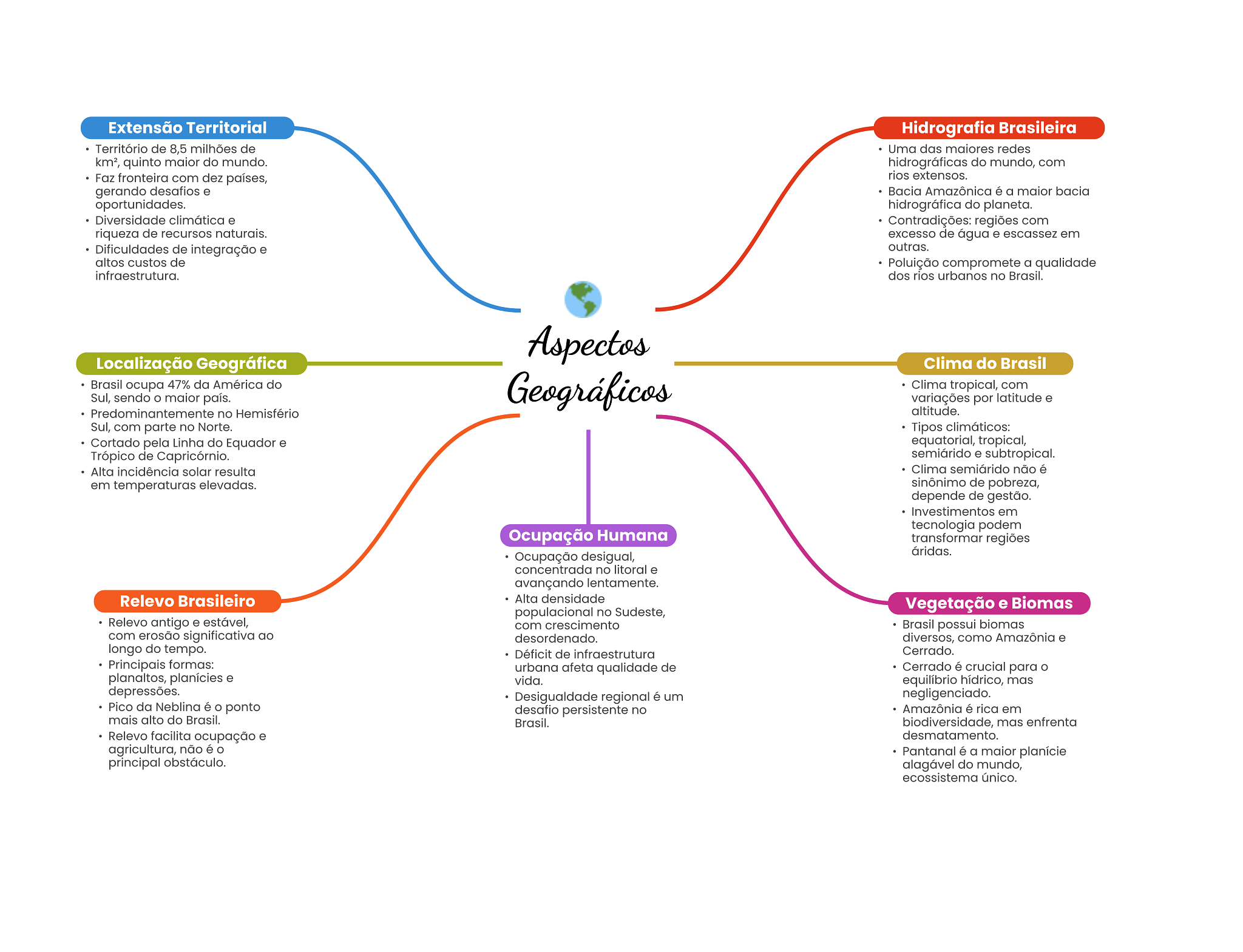Extensão Territorial Hidrografia Brasileira Território de 8,5 milhões de Uma das maiores redes km², quinto maior do mundo. hidrográficas do mundo, com Faz fronteira com dez países, rios extensos. gerando desafios e Bacia Amazônica é a maior bacia oportunidades. hidrográfica do planeta. Diversidade climática e Contradições: regiões com riqueza de recursos naturais. excesso de água e escassez em Dificuldades de integração e outras. altos custos de Poluição compromete a qualidade infraestrutura. dos rios urbanos no Brasil. Aspectos Localização Geográfica Clima do Brasil Brasil ocupa 47% da América do Sul, sendo maior país. Geográficos Clima tropical, com variações por latitude e Predominantemente no Hemisfério altitude. Sul, com parte no Norte. Tipos climáticos: Cortado pela Linha do Equador e equatorial, tropical, Trópico de Capricórnio. semiárido e subtropical. Alta incidência solar resulta Clima semiárido não é em temperaturas elevadas. sinônimo de pobreza, depende de gestão. Investimentos em tecnologia podem Ocupação Humana transformar regiões Ocupação desigual, áridas. concentrada no litoral e avançando lentamente. Relevo Brasileiro Alta densidade populacional no Sudeste, Vegetação e Biomas Relevo antigo e estável, com crescimento Brasil possui biomas com erosão significativa ao desordenado. diversos, como Amazônia e longo do tempo. Déficit de infraestrutura Cerrado. Principais formas: urbana afeta qualidade de Cerrado é crucial para O planaltos, planícies e vida. equilíbrio hídrico, mas depressões. Desigualdade regional é um negligenciado. Pico da Neblina é ponto desafio persistente no Amazônia é rica em mais alto do Brasil. Brasil. biodiversidade, mas enfrenta Relevo facilita ocupação e desmatamento. agricultura, não é Pantanal é a maior planície principal obstáculo. alagável do mundo, ecossistema único.