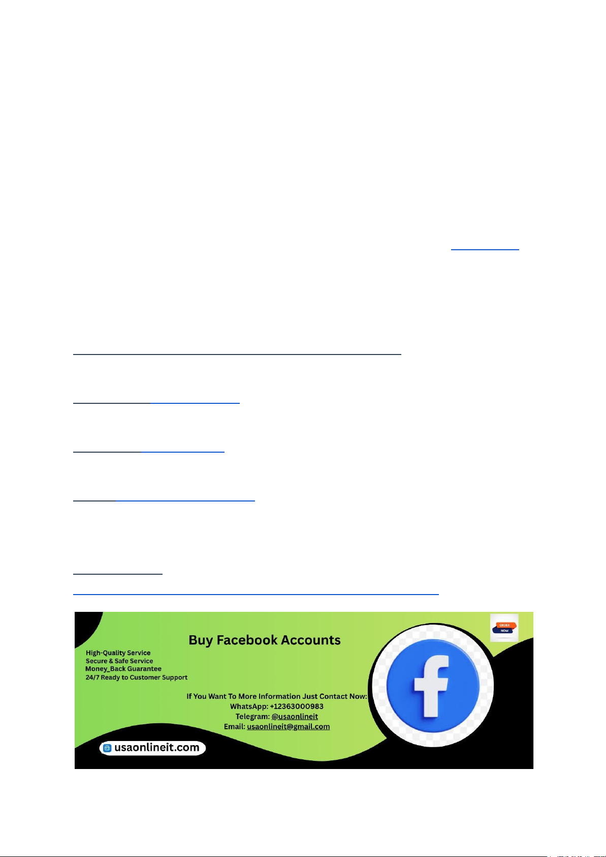 Why Facebook Accounts Are Critical for Social Media Growth Facebook remains one of the most influential social media platforms in 2026. Businesses, influencers, and marketers rely on Facebook accounts to expand reach, build communities, and drive engagement. A well-established account provides instant credibility and can significantly improve the performance of marketing campaigns. Organic reach and advertising success often depend on account age and trust signals, which make new accounts less reliable for immediate growth. For professionals looking to scale their social presence quickly, purchasing Facebook accounts can save months of effort. USAOnlineIT specializes in providing high-quality Facebook accounts that are optimized for growth. These accounts are aged, verified, and ready for use, ensuring that businesses can jumpstart their social strategies without facing restrictions or delays. With the right accounts, brands and marketers can increase visibility, improve engagement rates, and accelerate social media objectives in 2026. If You Want To More Information Just Contact Now: WhatsApp:+12363000983 Telegram: @usaonlineit Email: usaonlineit@gmail.co Website Link : https://usaonlineit.com/product/buy-facebook-accounts/ https://usaonlineit.com/product/buy-facebook-accounts/ https://usaonlineit.com/product/buy-facebook-accounts/ https://usaonlineit.com/product/buy-facebook-accounts/ https://usaonlineit.com/product/buy-facebook-accounts/ https://usaonlineit.com/product/buy-facebook-accounts/ Understanding Verified and Aged Facebook Accounts Verified and aged Facebook accounts offer significant advantages over newly created ones. Aged accounts have a history of normal activity, which helps avoid restrictions and makes them appear trustworthy to the platform’s security algorithms. Verified accounts further increase credibility by demonstrating legitimacy to both Facebook and users. These accounts are less likely to trigger security alerts and more suitable for managing multiple business pages, groups, or ad campaigns. At USAOnlineIT, we provide verified and aged Facebook accounts that come with full access, giving users complete control. This allows businesses to maintain stability, build social proof, and execute growth strategies efficiently. By using these accounts, marketers can focus on engagement and content rather than account management hurdles. Advantages of Buying Facebook Accounts in 2026 Purchasing Facebook accounts offers multiple advantages for businesses and influencers in 2026. First, it saves time by bypassing the long waiting period required to grow a new account. Second, aged accounts carry trust and credibility, which increases engagement and ad efficiency. Third, these accounts are less likely to face restrictions or frequent verification requests, making them ideal for professional use. Additionally, using multiple accounts can help diversify marketing strategies, manage different campaigns, and separate personal and business activities. USAOnlineIT ensures that all Facebook accounts we provide are verified, aged, and ready for immediate use, helping users achieve faster growth while reducing operational risks. How Facebook Account Age Impacts Growth Potential The age of a Facebook account directly influences its potential for social growth. Older accounts have a history of regular activity, which signals legitimacy to Facebook’s algorithms. This reduces the chances of restrictions, verification prompts, or temporary bans. For marketers, aged accounts provide a foundation for scaling campaigns, managing multiple pages, and building audience trust. USAOnlineIT provides aged Facebook accounts with proper credentials, allowing businesses and influencers to start growth strategies immediately. Account age also impacts ad approval and reach, which is crucial for maximizing the return on social media investment. Security Benefits of Purchased Facebook Accounts Security is a major concern for social media professionals. Purchased Facebook accounts from reliable providers like USAOnlineIT come with full access and verified recovery options. These features reduce the risk of account loss and ensure that businesses can maintain uninterrupted growth. Recovery-enabled accounts allow users to reset passwords, update security settings, and receive alerts for suspicious activity. By choosing secure accounts, marketers protect their investment, avoid disruptions in campaigns, and maintain consistent https://usaonlineit.com/product/buy-facebook-accounts/ engagement with their audience. Security and stability are essential components of a successful social media growth strategy in 2026. Common Uses of Facebook Accounts for Growth Facebook accounts can be utilized in several ways for social media growth. Businesses use them to manage pages, run ads, join niche groups, and connect with potential clients. Influencers rely on multiple accounts to engage different audiences, test content strategies, and build brand visibility. Marketers leverage aged accounts to run campaigns without frequent verification interruptions. Accounts with verified recovery options ensure continuous access and prevent account lockouts. USAOnlineIT provides Facebook accounts tailored to these growth strategies, allowing users to implement their marketing plans efficiently and safely. How to Choose the Right Facebook Accounts Choosing the right Facebook accounts is critical for effective social growth. Buyers should prioritize aged, verified accounts with stable histories and full access. Avoid accounts with suspicious activity or previous restrictions, as these can negatively affect campaigns. USAOnlineIT ensures transparency and quality in all accounts we provide, guaranteeing reliability and security. By selecting the right accounts, businesses and marketers can execute campaigns smoothly, engage audiences effectively, and build a strong online presence without unnecessary risks. Why Businesses Prefer Ver