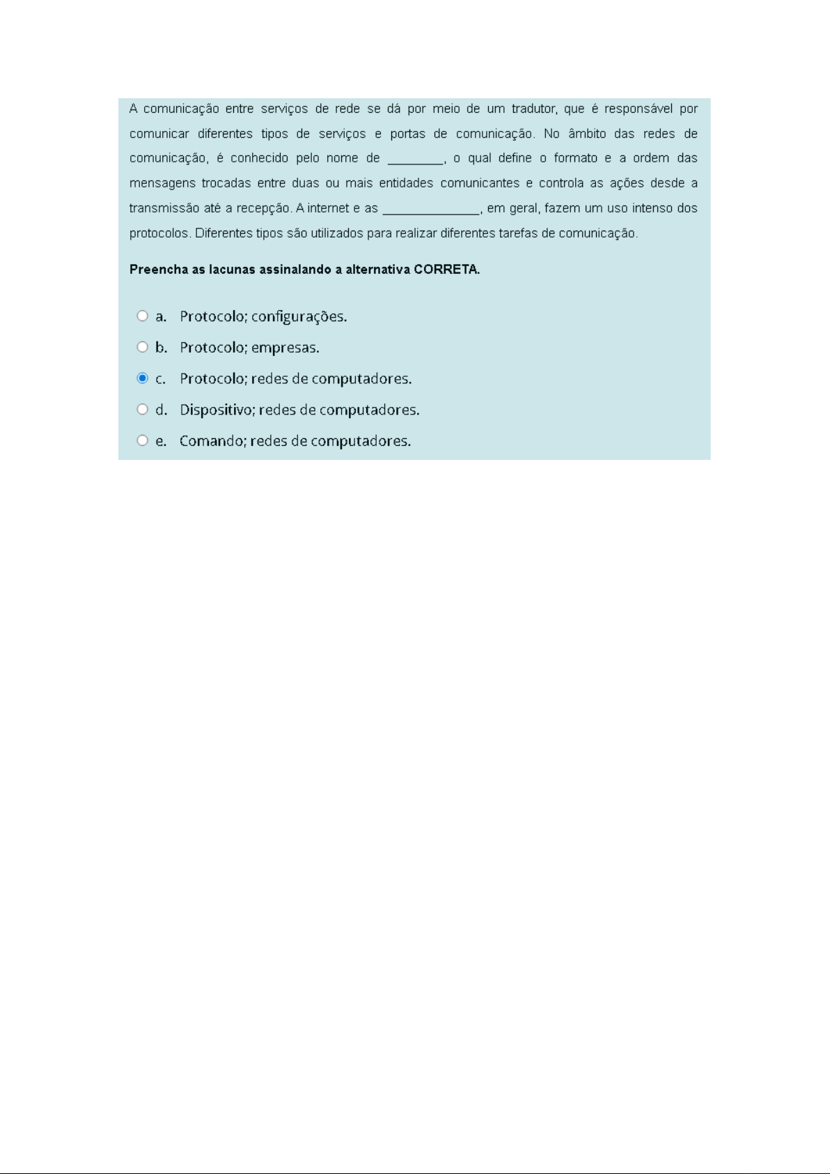 A comunicação entre serviços de rede se dá por meio de um tradutor, que é responsável por comunicar diferentes tipos de serviços e portas de comunicação. No âmbito das redes de comunicação, é conhecido pelo nome de 0 qual define 0 formato e a ordem das mensagens trocadas entre duas ou mais entidades comunicantes e controla as ações desde a transmissão até a recepção. A internet e as em geral, fazem um uso intenso dos protocolos. Diferentes tipos são utilizados para realizar diferentes tarefas de comunicação. Preencha as lacunas assinalando a alternativa CORRETA. a. Protocolo; configurações. b. Protocolo; empresas. C. Protocolo; redes de computadores. d. Dispositivo; redes de computadores. e. Comando; redes de computadores.Atualmente, a infraestrutura computacional é importante para garantir a disponibilidade do serviço. Ela é responsável por manter ativas as aplicações que milhões de usuários utilizam todos dias. Sobre isso, analise as asserções a seguir e a relação proposta entre elas. I. No contexto atual, em que grande parte das aplicações são executadas em algum tipo de nuvem computacional, muitos aspectos precisam ser avaliados. PORQUE II. A segurança do acesso dos usuários, a conectividade com data centers e a disponibilidade dos servidores são aspectos a serem considerados nas infraestruturas. Com base na análise das asserções, conclui-se que: a. ambas as asserções são falsas. b. a primeira asserção é verdadeira, e a segunda asserção é falsa; C. as duas asserções são verdadeiras, e a segunda justifica corretamente a primeira; d. a primeira asserção é falsa, e a segunda asserção é verdadeira; e. as duas asserções são verdadeiras, mas a segunda não justifica corretamente a primeira;Na arquitetura TCP/IP, cada uma das camadas representa uma função na rede, com 0 objetivo de padronizar a arquitetura e 0 uso dos protocolos em diferentes partes do fluxo de transmissão de dados. A camada de é responsável por garantir que 0 usuário possa interagir com as aplicações hospedadas pelo servidor. Já a camada de tem 0 papel, principalmente, de controlar 0 meio físico, detectando suas características e a forma como dispositivos estão conectados. Enquanto isso, a camada de opera protocolo IP para comunicação e endereçamento dos dispositivos na rede. Preencha as lacunas escolhendo a alternativa CORRETA: a. aplicação; física; internet (ou rede). b. transporte; física; internet (ou rede). C. transporte; acesso à rede; internet (ou rede). d. aplicação; acesso à rede; internet (ou rede). e. apresentação; física; acesso à rede. Um datagrama ou pacote definido em IPV4 tem um formato específico. Considerando as características do pacote no IPV4, julgue se são (V) verdadeiras ou (F) falsas as afirmativas a seguir. I. 0 comprimento do pacote é medido em bytes, e seu tamanho máximo teórico é 65.535, de acordo com 0 padrão estabelecido. II. Tanto 0 endereço fonte como 0 destino são definidos por 32 bits, separados em quadro octetos. III. Uma máscara de rede tem 32 bits e é utilizada para a permitir a identificação do endereço da rede e do endereço do host. IV. Dependendo do tipo de serviço (type of service), presente no cabeçalho do pacote, pode ser dada certa prioridade ao seu encaminhamento. Agora, assinale a alternativa que apresenta a sequência CORRETA. a. F-F-F-V. b. F-V-V-V. C. V-V-V-V. d. V-F-V-F e. V-V-F-F.