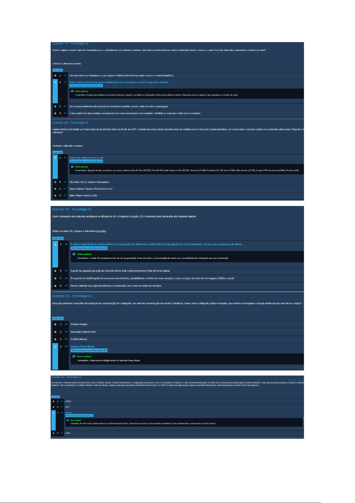 Existem alguns conceitos que são importantes para 0 entendimento dos sistemas celulares, entre eles podemos célula, modulação, banda, enlace eo Qual das alternativas apresenta conceito de canal? Assinale a alternativa correta. Nota: 20.0 A Intervalo entre duas frequências, a sua largura é definida pela diferença entre a maior e a menor frequência Este é meio de transporte que é utilizado para que a mensagem emitida chegue até receptor. Voce assinalou essa alternativa (B) Você acertou! Comentário: A opção a) se refere ao conceito de a opção c) se refere a modulação a letra d) se refere ao enlace. Resposta certa é opção b) que apresenta conceito de canal Tem a responsabilidade pela alteração do sinal eletromagnético gerado, antes de sofrer a propagação. D É uma espécie de sinal analógico em forma de uma onda senoidal que será modulado, refletindo os dados que estão sendo Questão 2/5 Tecnologia 5G Alguns relatórios da Anatel que fazem balanços da telefonia móvel no Brasil, em mostram que ainda existem grandes áreas de sombras em um terço das cidades brasileiras, em zonas rurais e rodovias existem uma penumbra ainda maior. Segundo a cobertura? (Assinale a alternativa correta. 20.0 A Piauí, Pará Mato Grosso do Sul Você assinalou essa alternativa (A) Você acertou! Comentários: Segundo estados com menor cobertura 4G são Piaui (23,3%). Pará Mato Grosso do Sul Tocantins Rondônia Acre (17,8%). Mato Grosso (12,7%). Amapá Amazonas Roraima (3%) São Paulo, Rio de Janeiro e Pernambuco Santa Catarina, Paraná e Rio Grande do Sul D Bahia, Minas Gerais e Goiás Questão 3/5 Tecnologia 5G Com a saturação dos sistemas analógicos na década de 90, a Segunda Geração (2G) é marcada pela introdução dos sistemas digitais. Sobre as redes 2G, marque a alternativa incorreta Nota: 20.0 A A rede 2G apresentava muitos ruídos e comunicação de dados sem a utilização de criptografia em sua transmissão, ou seja, sem segurança de dados. Você assinalou essa alternativa (A) Você acertou! Comentário: A rede 2G apresenta sinais de voz de qualidade, livres de ruídos e comunicação de dados com possibilidade de criptografia em sua transmissão. A partir da segunda geração de conexão móvel, todo funcionamento é feito de forma digital. espectro de radiofrequência mais eficiente, possibilitando a oferta de novos serviços, como a criação de envio de mensagens (SMS) e mail. D Houve melhoria nos aspectos técnicos e comerciais, bem como na oferta de serviços. Questão 4/5 Tecnologia 5G Uma das primeiras invenções tecnológicas de comunicação foi telégrafo, um meio de comunicação de escrita à distância. Quem criou 0 telégrafo prático e simples, que enviava mensagens a longas distâncias por meio de um código? Nota: 20.0 A Claude Chappe Alexandre Graham Bell Antônio Meucci D Samuel Finley Morse assinalou essa alternativa (D) Você acertou! Comentário: Quem criou código morse foi Samuel Finley Questão 5/5 Tecnologia 5G Nos anos telefonia celular do Brasil contava com a Telebrás. Devido falta de concorrência e estagnação do mercado, viu- se a necessidade de melhorar setor das telecomunicações Foi dado início ao processo de privatização do sistema que causou grande mudança no mapa da telefonia Com a privatização do sistema Telebrás e leilão de bandas, surgem as primeiras operadoras de telefonia móvel no país. Em 1997 foi criada uma agência para regular as questões relacionadas a telecomunicações no Brasil. Qual essa agência? A ANEEL ANTT 48 ANATEL assinalou essa alternativa Você acertou! Comentário: Em 1997 surge Agência Nacional de Telecomunicações responsável por garantir universalização competição no setor, estabelecendo padronização do sistema no D ANAC