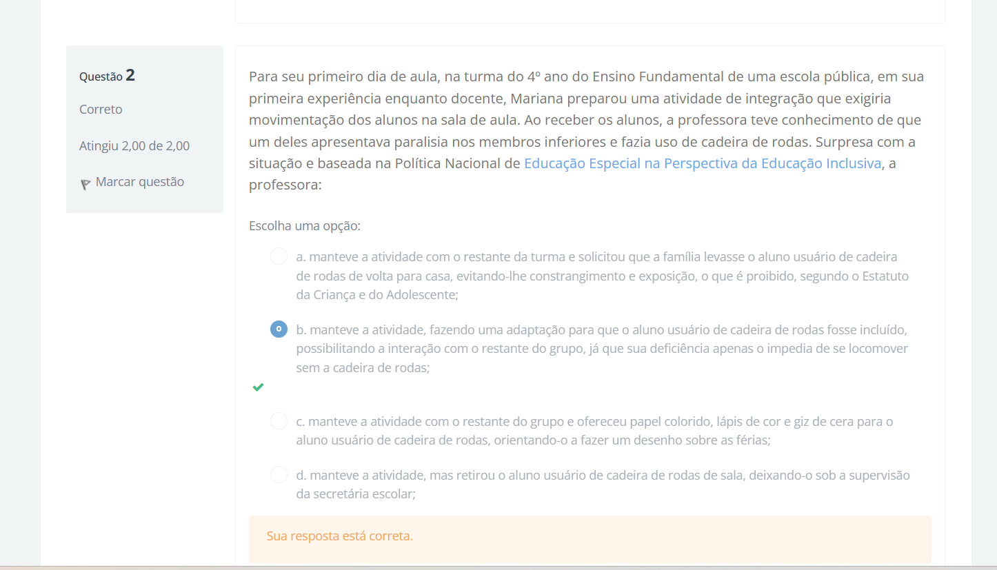 Questão 2 Para seu primeiro dia de aula, na turma do 4° ano do Ensino Fundamental de uma escola pública, em sua primeira experiência enquanto docente, Mariana preparou uma atividade de integração que exigiria Correto movimentação dos alunos na sala de aula. Ao receber os alunos, a professora teve conhecimento de que Atingiu 2,00 de 2,00 um deles apresentava paralisia nos membros inferiores e fazia uso de cadeira de rodas. Surpresa com a situação e baseada na Política Nacional de Educação Especial na Perspectiva da Educação Inclusiva, a Marcar questão professora: Escolha uma opção: a. manteve a atividade com O restante da turma e solicitou que a família levasse aluno usuário de cadeira de rodas de volta para casa, evitando-lhe constrangimento e exposição, que é proibido, segundo Estatuto da Criança e do Adolescente; b. manteve a atividade, fazendo uma adaptação para que aluno usuário de cadeira de rodas fosse incluído, possibilitando a interação com restante do grupo, já que sua deficiência apenas impedia de se locomover sem a cadeira de rodas; C. manteve a atividade com restante do grupo e ofereceu papel colorido, lápis de cor e giz de cera para aluno usuário de cadeira de rodas, orientando-o a fazer um desenho sobre as férias; d. manteve a atividade, mas retirou aluno usuário de cadeira de rodas de sala, deixando-o sob a supervisão da secretária escolar; Sua resposta está correta.