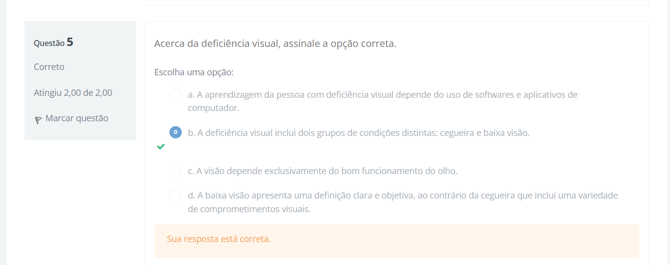 Questão 5 Acerca da deficiência visual, assinale a opção correta. Correto Escolha uma opção: Atingiu 2,00 de 2,00 a. A aprendizagem da pessoa com deficiência visual depende do uso de softwares e aplicativos de computador. Marcar questão b. A deficiência visual inclui dois grupos de condições distintas: cegueira e baixa visão. C. A visão depende exclusivamente do bom funcionamento do olho. d. A baixa visão apresenta uma definição clara e objetiva, ao contrário da cegueira que inclui uma variedade de comprometimentos visuais. Sua resposta está correta.