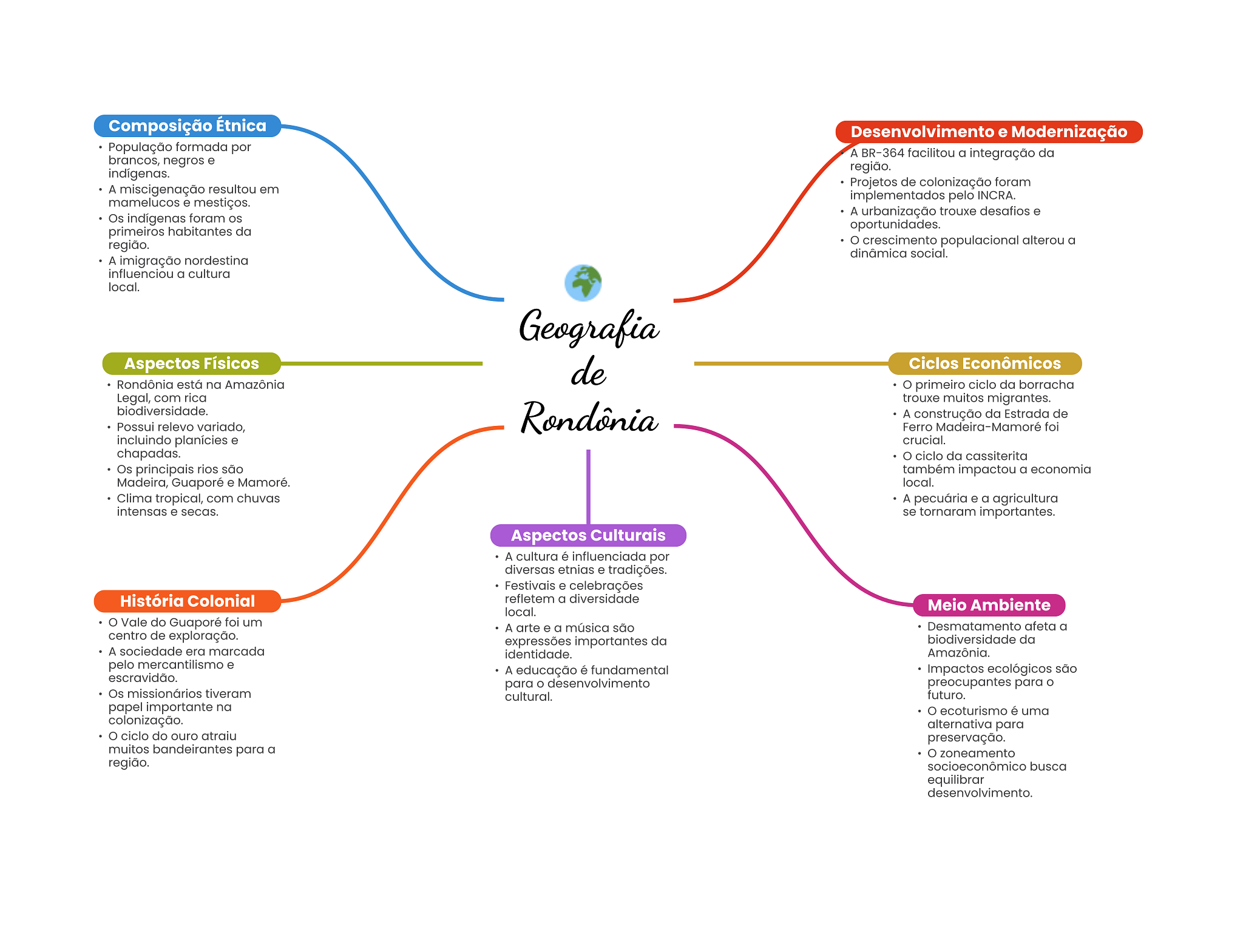 Composição Étnica Desenvolvimento e Modernização População formada por A BR-364 facilitou a integração da brancos, negros e região. indígenas. A miscigenação resultou em Projetos de colonização foram implementados pelo INCRA. mamelucos e mestiços. A trouxe desafios e Os indígenas foram primeiros habitantes da oportunidades. região. crescimento populacional alterou a dinâmica social. A imigração nordestina influenciou a cultura local. Geografia Aspectos Físicos de Ciclos Econômicos Rondônia está na Amazônia primeiro ciclo da borracha Legal, com rica trouxe muitos migrantes. biodiversidade. Rondônia A construção da Estrada de Possui relevo variado, Ferro Madeira-Mamoré foi incluindo planícies e crucial. chapadas. O ciclo da cassiterita Os principais rios são também impactou a economia Madeira, Guaporé e Mamoré. local. Clima tropical, com chuvas A pecuária e a agricultura intensas e secas. se tornaram importantes. Aspectos Culturais A cultura é influenciada por diversas etnias e tradições. Festivais e celebrações História Colonial refletem a diversidade Meio Ambiente local. Vale do Guaporé foi um A arte e a música são Desmatamento afeta a centro de exploração. expressões importantes da biodiversidade da A sociedade era marcada identidade. Amazônia. pelo mercantilismo e A educação é fundamental Impactos ecológicos são escravidão. para desenvolvimento preocupantes para Os missionários tiveram cultural. futuro. papel importante na O ecoturismo é uma colonização. alternativa para ciclo do ouro atraiu preservação. muitos bandeirantes para a zoneamento região. busca equilibrar desenvolvimento.