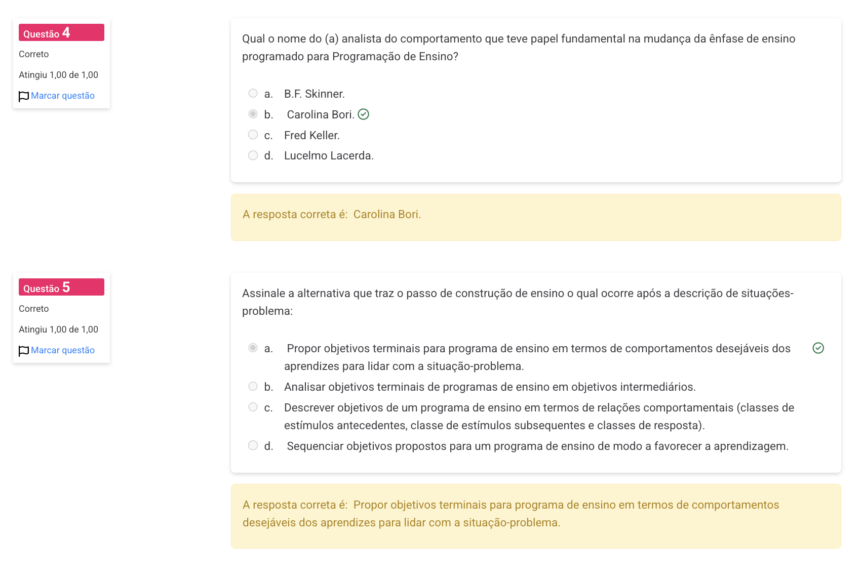 Questão 4 Qual nome do (a) analista do comportamento que teve papel fundamental na mudança da ênfase de ensino Correto programado para Programação de Ensino? Atingiu 1,00 de 1,00 Marcar questão a. B.F. Skinner. b. Carolina Bori. C. Fred Keller. d. Lucelmo Lacerda. A resposta correta é: Carolina Bori. Questão 5 Assinale a alternativa que traz o passo de construção de ensino qual ocorre após a descrição de situações- Correto problema: Atingiu 1,00 de 1,00 Marcar questão a. Propor objetivos terminais para programa de ensino em termos de comportamentos desejáveis dos aprendizes para lidar com a situação-problema. b. Analisar objetivos terminais de programas de ensino em objetivos intermediários. C. Descrever objetivos de um programa de ensino em termos de relações comportamentais (classes de estímulos antecedentes, classe de estímulos subsequentes e classes de resposta). d. Sequenciar objetivos propostos para um programa de ensino de modo a favorecer a aprendizagem. A resposta correta é: Propor objetivos terminais para programa de em termos de comportamentos desejáveis dos aprendizes para lidar com a situação-problema.