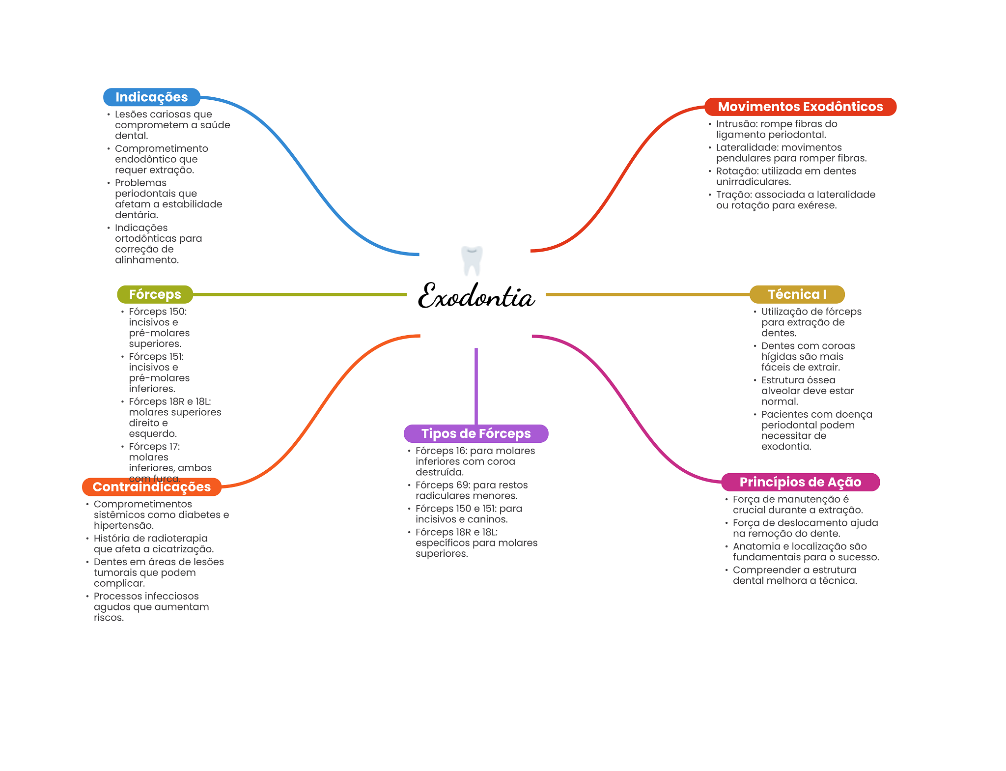 Indicações Movimentos Exodônticos Lesões cariosas que comprometem a saúde Intrusão: rompe fibras do dental. ligamento periodontal. Comprometimento Lateralidade: movimentos endodôntico que pendulares para romper fibras. requer extração. Rotação: utilizada em dentes Problemas unirradiculares. periodontais que Tração: associada a lateralidade afetam a estabilidade ou rotação para exérese. dentária. Indicações ortodônticas para correção de alinhamento. Fórceps Exodontia Técnica I Fórceps 150: Utilização de fórceps incisivos e para extração de pré-molares dentes. superiores. Dentes com coroas Fórceps 151: hígidas são mais incisivos e fáceis de extrair. pré-molares Estrutura óssea inferiores. alveolar deve estar Fórceps 18R e 18L: normal. molares superiores Pacientes com doença direito e periodontal podem esquerdo. Tipos de Fórceps necessitar de Fórceps 17: Fórceps 16: para molares exodontia. molares inferiores com coroa inferiores, ambos destruída. Contraindicações com furca Fórceps 69: para restos Princípios de Ação radiculares menores. Comprometimentos Força de manutenção é sistêmicos como diabetes e Fórceps 150 e 151: para crucial durante a extração. incisivos e caninos. hipertensão. Força de deslocamento ajuda Fórceps 18R e 18L: História de radioterapia na remoção do dente. específicos para molares que afeta a cicatrização. Anatomia e localização são superiores. Dentes em áreas de lesões fundamentais para O sucesso. tumorais que podem Compreender a estrutura complicar. dental melhora a técnica. Processos infecciosos agudos que aumentam riscos.
