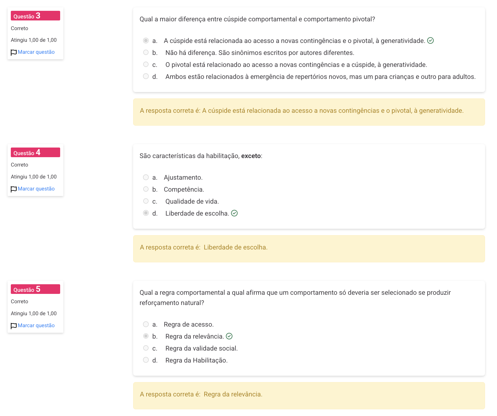 Questão 3 Qual a maior diferença entre cúspide comportamental e comportamento pivotal? Correto Atingiu 1,00 de 1,00 a. A cúspide está relacionada ao acesso a novas contingências e pivotal, à generatividade. Marcar questão b. Não há diferença. São sinônimos escritos por autores diferentes. C. 0 pivotal está relacionado ao acesso a novas contingências e a cúspide, à generatividade. d. Ambos estão relacionados à emergência de repertórios novos, mas um para crianças e outro para adultos. A resposta correta é: A cúspide está relacionada ao acesso a novas contingências e pivotal, à generatividade. Questão 4 São características da habilitação, exceto: Correto Atingiu 1,00 de 1,00 a. Ajustamento. Marcar questão b. Competência. C. Qualidade de vida. d. Liberdade de escolha. A resposta correta é: Liberdade de escolha. Questão 5 Qual a regra comportamental a qual afirma que um comportamento só deveria ser selecionado se produzir Correto reforçamento natural? Atingiu 1,00 de 1,00 Marcar questão a. Regra de acesso. b. Regra da relevância. C. Regra da validade social. d. Regra da Habilitação. A resposta correta é: Regra da relevância.