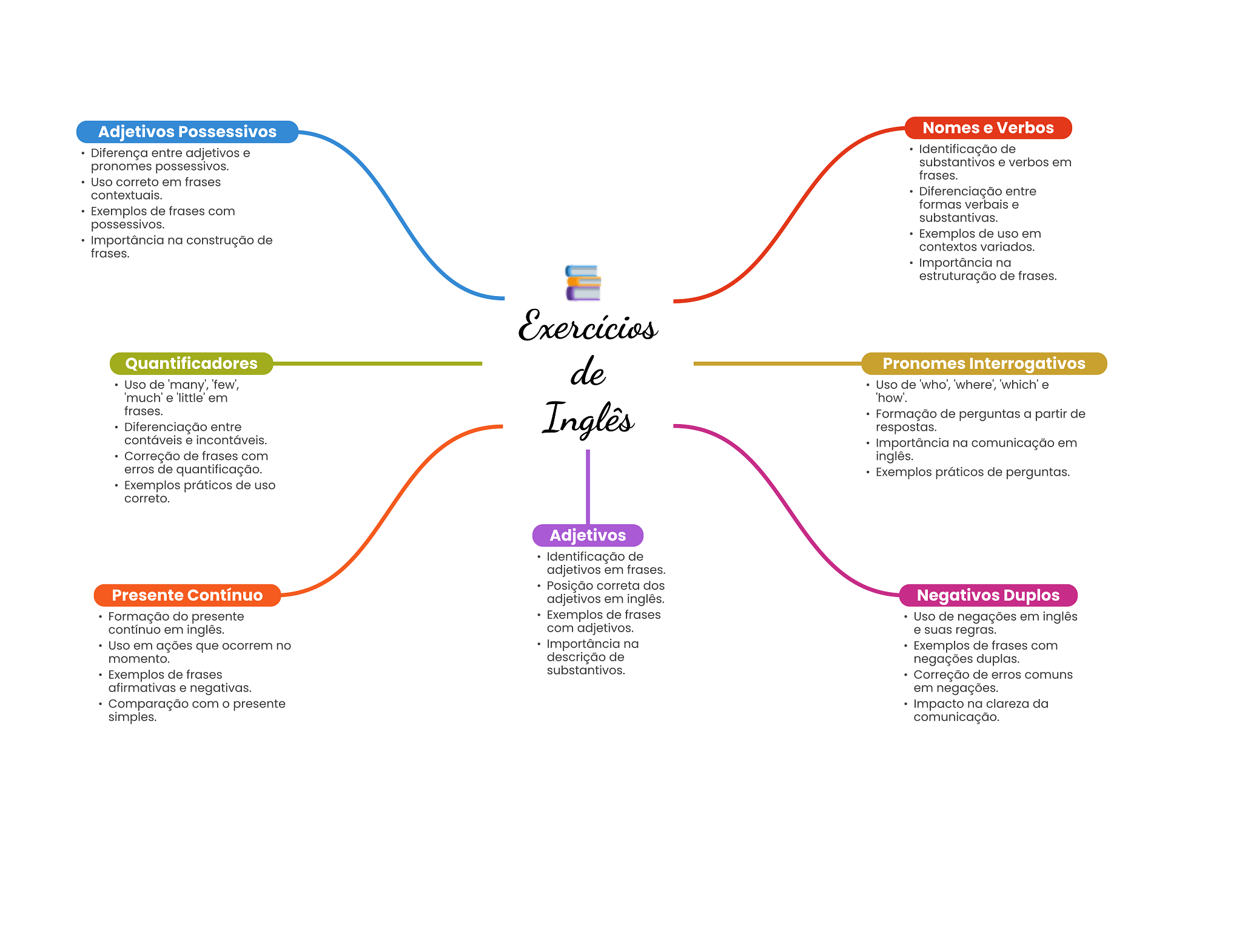 Adjetivos Possessivos Nomes e Verbos Diferença entre adjetivos e Identificação de pronomes possessivos. substantivos e verbos em frases. Uso correto em frases contextuais. Diferenciação entre formas verbais e Exemplos de frases com substantivas. possessivos. Importância na construção de Exemplos de uso em contextos variados. frases. Importância na estruturação de frases. Exercícios Quantificadores de Pronomes Interrogativos Uso de 'many', 'few', Uso de 'who', 'where', 'which' e 'much' e 'little' em 'how'. frases. Diferenciação entre Inglês Formação de perguntas a partir de respostas. contáveis e incontáveis. Importância na comunicação em Correção de frases com inglês. erros de quantificação. Exemplos práticos de perguntas. Exemplos práticos de uso correto. Adjetivos Identificação de adjetivos em frases. Posição correta dos Presente Contínuo adjetivos em inglês. Negativos Duplos Formação do presente Exemplos de frases Uso de negações em inglês contínuo em inglês. com adjetivos. e suas regras. Uso em ações que ocorrem no Importância na Exemplos de frases com momento. descrição de negações duplas. Exemplos de frases substantivos. Correção de erros comuns afirmativas e negativas. em negações. Comparação com presente Impacto na clareza da simples. comunicação.
