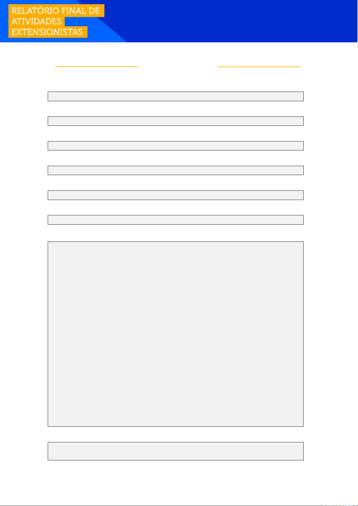 DADOS DO ALUNO: Aluno: [Nome completo] RA: [Número do RA do aluno] POLO / UNIDADE: CURSO: GESTÃO PÚBLICA COMPONENTE CURRICULAR: PROJETO DE EXTENSÃO II – GESTÃO PÚBLICA PROGRAMA DE EXTENSÃO: PROGRAMA DE INOVAÇÃO E EMPREENDEDORISMO. FINALIDADE E MOTIVAÇÃO: Pelo programa de extensão Inovação e Empreendedorismo o curso de Gestão Pública tem a missão de transferir à sociedade os conhecimentos gerados e potencializar a geração de novos conhecimentos de modo aplicado, permitindo o desenvolvimento de ações no âmbito da tecnologia e inovação, que apresentam soluções e produtos para resolução de problemas diversificados presentes no contexto social, trazendo impacto positivo a comunidade envolvida. Ao identificar as dificuldades da comunidade, os alunos compreendem a necessidade e a motivação para efetuar as ações de apoio relacionadas ao curso pelas quais poderão ser desenvolvidas competências técnicas e soft skills específicas absorvidas durante sua jornada acadêmica. Os conteúdos programáticos sugeridos para correlacionar as ações são: Modelos de Gestão, Gestão de Pessoas e Gestão de Conflitos; Teoria Geral da Administração Pública; Legislação Aplicada a Gestão Pública. Os locais que poderão contemplar esse projeto são: Entidades pertencentes à Administração Pública Municipal, Estadual ou Federal; escolas; colégios; Organizações não governamentais (ONG); Instituições privadas com ações sociais; fundações; entidades do Judiciário como Procons e Tribunais; Entidades religiosas como igrejas, ordens, templos, congregações, missões e casas de acolhimento ou assistência; entidades de saúde e assistência social; Organizações da Sociedade Civil de Interesse Público (OSCIPs); Organizações de moradores e Cooperativas, entre outras. COMPETÊNCIAS: I - Conhecer e dominar conceitos e teorias relacionadas a Gestão Pública e sua aplicação no cenário nacional; II - Dominar a linguagem pacificadora fomentando a solução de crises e conflitos de modo hábil, colaborativo e restaurador; III - Aplicar técnicas de Gestão e estudo do fenômeno da Administração Pública, auxiliando no planejamento, controle, auditoria e gestão. PERFIL DO EGRESSO: O perfil do egresso do curso de Gestão Pública, idealizado pela IES proporciona a formação do profissional com capacidade de interpretação com a valorização dos fenômenos da Gestão e Administração Pública; aliado a uma postura reflexiva e de visão crítica que fomente a capacidade e a aptidão para a aprendizagem autônoma para do desenvolvimento e planejamento de melhores técnicas a serem aplicadas no espaço da Administração Pública; domínio do diálogo construtivo e pacificador. SOFT SKILLS (COMPETÊNCIAS SOCIOEMOCIONAIS): Análise e resolução de problemas Criatividade e inovação Liderança OBJETIVOS DE APRENDIZAGEM: O objetivo de aprendizagem do programa de extensão em Inovação e Empreendedorismo do curso de Gestão Pública está relacionado ao fato de disseminar os conhecimentos multidisciplinares e transversais desenvolvidos no curso, com a finalidade de apoiar a comunidade no âmbito tecnológico, inovador e empreendedor explorando as Ciências Sociais Aplicadas, fomentando a geração de conhecimentos técnicos desenvolvidos nas ações e aprimorando das habilidades dos egressos. CONTEÚDOS: I – Modelos de Gestão, Gestão de Pessoas e Gestão de Projetos; II – Legislação Aplicada a Administração Pública; III – Modelos de Conflito. INDICAÇÕES BIBLIOGRÁFICAS: BURMESTER, Haino. Manual de gestão: organização, processos e práticas de Liderança coletiva. 2. ed. São Paulo: Saraiva, 2018. ESTEFAM, André ; GONÇALVES, Victor Eduardo Rios. Direito penal esquematizado: parte geral. 9. ed. São Paulo : Saraiva Educação, 2020. PUCCINI, Abelardo de Lima. Matemática financeira: objetiva e aplicada. 10. ed. São Paulo: Saraiva, 2017. RELATÓRIO FINAL: Aluno e Aluna, após realizar suas atividades de extensão, é necessário que você o formalize, enviando esse Relatório Final para ser avaliado junto ao seu Ambiente Virtual (AVA) e também para você poder comprovar sua atuação. Para o preenchimento, busque as anotações junto ao TEMPLATE PCDA para auxiliar na apresentação das atividades desenvolvidas. Todos os campos são de preenchimento obrigatório! DESCRIÇÃO DA AÇÃO COM RESULTADOS ALCANÇADOS Metas dos Objetivos de Desenvolvimento Sustentável (ODS) aderentes a este projeto: CAMPO OBRIGATÓRIO – busque no seu Template PDCA quais Metas você selecionou como aderentes ao seu projeto, conforme cada Objetivo de Desenvolvimento Sustentável (ODS) da Organização das Nações Unidas (ONU) que você explorou no seu planejamento. Liste as Metas selecionadas (pelo menos uma opção): Local de realização da atividade extensionista: Durante a ação: Caso necessário, houve mudança de estratégia para alcançar o resultado: Resultado da ação: Conclusão: Depoimentos (se houver): RELATE SUA PERCEPÇÃO DAS AÇÕES EXTENSIONISTAS REALIZADAS NO PROGRAMA DESENVOLVIDO: CAMPO OBRIGATÓRIO – relate em no mínimo 15 (quinze) linhas sua experiência com as ações extensionistas. O texto deve ser de sua autoria e inédito, evite plágio. Questões norteadoras: (1) Você notou que suas habilidades profissionais foram aprimoradas, com a atuação nas ações extensionistas? (2) Você identificou melhoria/resolução do problema identificado? (3) Você conseguiu articular os conhecimentos adquiridos no curso com as ações extensionistas? Ao escrever seu texto evite deixá-lo em forma de respostas as questões norteadoras, relate sua experiência em forma de texto dissertativo com justificativas. DEPOIMENTO DA INSTITUIÇÃO PARTICIPANTE CAMPO OBRIGATÓRIO - insira depoimento(s) do(s) gestor(es) da instituição/órgão/associação participante que contribuam como um feedback da ação realizada por você. REFERÊNCIAS BIBLIOGRÁFICAS CA