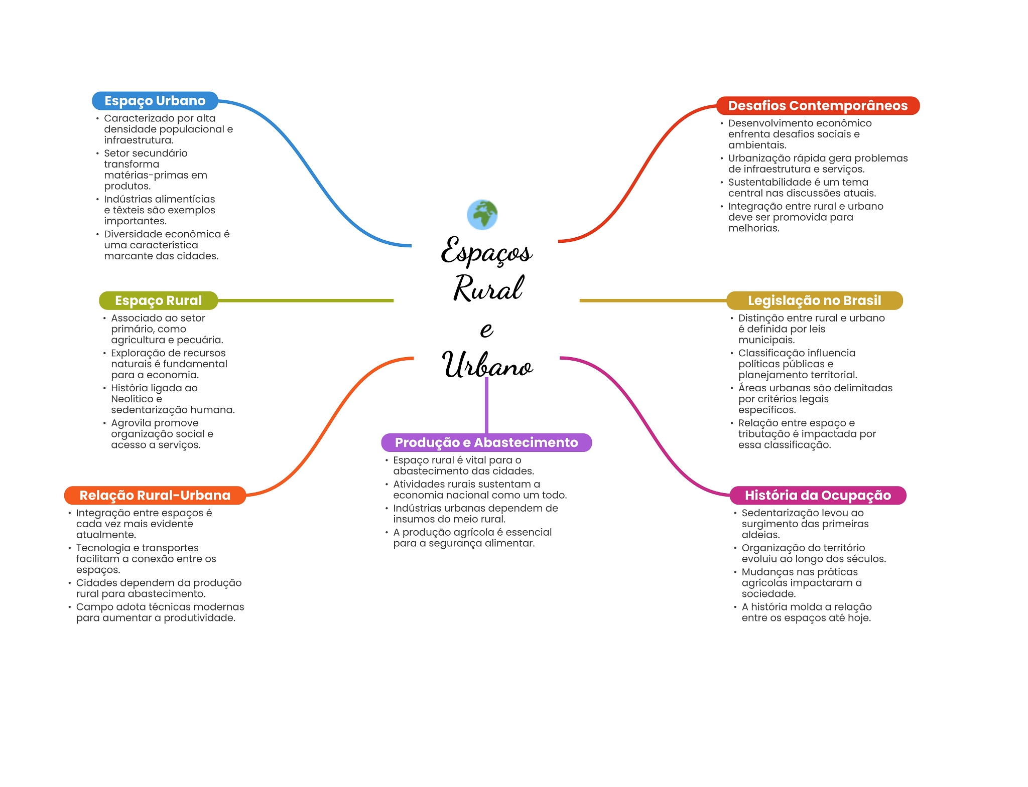 Espaço Urbano Desafios Contemporâneos Caracterizado por alta Desenvolvimento econômico densidade populacional e enfrenta desafios sociais e infraestrutura. ambientais. Setor secundário transforma Urbanização rápida gera problemas matérias-primas em de infraestrutura e serviços. produtos. Sustentabilidade é um tema central nas discussões atuais. Indústrias alimentícias e têxteis são exemplos Integração entre rural e urbano importantes. deve ser promovida para melhorias. Diversidade econômica é uma característica marcante das cidades. Espaços Rural Espaço Rural Legislação no Brasil Associado ao setor Distinção entre rural e urbano primário, como e é definida por leis agricultura e pecuária. municipais. Exploração de recursos naturais é fundamental Urbano Classificação influencia políticas públicas e para a economia. planejamento territorial. História ligada ao Áreas urbanas são delimitadas Neolítico e por critérios legais sedentarização humana. específicos. Agrovila promove Relação entre espaço e organização social e tributação é impactada por acesso a serviços. Produção e Abastecimento essa classificação. Espaço rural é vital para abastecimento das cidades. Atividades rurais sustentam a Relação Rural-Urbana economia nacional como um todo. História da Ocupação Integração entre espaços é Indústrias urbanas dependem de cada vez mais evidente insumos do meio rural. Sedentarização levou ao surgimento das primeiras atualmente. A produção agrícola é essencial aldeias. Tecnologia e transportes para a segurança alimentar. Organização do território facilitam a conexão entre os evoluiu ao longo dos séculos. espaços. Mudanças nas práticas Cidades dependem da produção agrícolas impactaram a rural para abastecimento. sociedade. Campo adota técnicas modernas A história molda a relação para aumentar a produtividade. entre espaços até hoje.