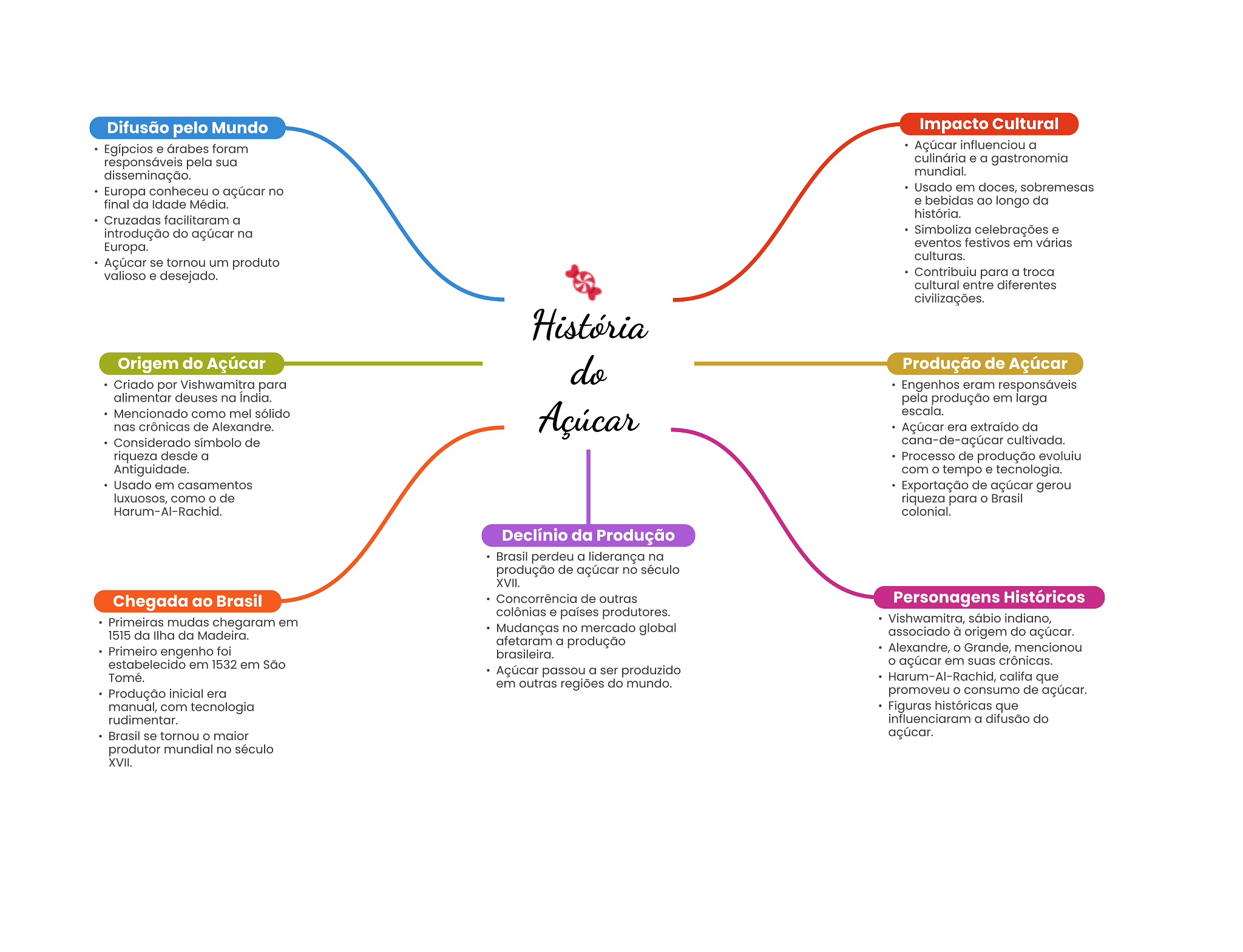 Difusão pelo Mundo Impacto Cultural Egípcios e árabes foram Açúcar influenciou a responsáveis pela sua culinária e a gastronomia disseminação. mundial. Europa conheceu açúcar no Usado em doces, sobremesas final da Idade Média. e bebidas ao longo da história. Cruzadas facilitaram a introdução do açúcar na Simboliza celebrações e Europa. eventos festivos em várias culturas. Açúcar se tornou um produto valioso e desejado. Contribuiu para a troca cultural entre diferentes civilizações. História Origem do Açúcar do Produção de Açúcar Criado por Vishwamitra para Engenhos eram responsáveis alimentar deuses na India. pela produção em larga Mencionado como mel sólido Açúcar escala. nas crônicas de Alexandre. Açúcar era extraído da Considerado símbolo de cana-de-açúcar cultivada. riqueza desde a Processo de produção evoluiu Antiguidade. com O tempo e tecnologia. Usado em casamentos Exportação de açúcar gerou luxuosos, como de riqueza para O Brasil colonial. Declínio da Produção Brasil perdeu a liderança na produção de açúcar no século XVII. Chegada ao Brasil Concorrência de outras Personagens Históricos colônias e países produtores. Primeiras mudas chegaram em Vishwamitra, sábio indiano, 1515 da Ilha da Madeira. Mudanças no mercado global associado à origem do açúcar. afetaram a produção Primeiro engenho foi brasileira. Alexandre, Grande, mencionou estabelecido em 1532 em São açúcar em suas crônicas. Tomé. Açúcar passou a ser produzido em outras regiões do mundo. Harum-Al-Rachid, califa que Produção inicial era promoveu consumo de açúcar. manual, com tecnologia Figuras históricas que rudimentar. influenciaram a difusão do Brasil se tornou maior açúcar. produtor mundial no século XVII.