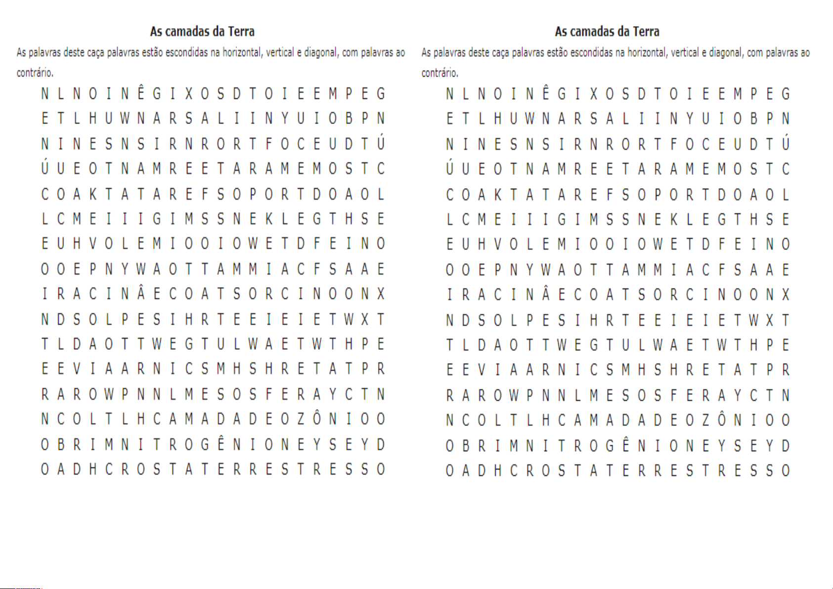Encontre as seguintes palavras: TROPOSFERA - ESTRATOSFERA – MESOSFERA – TERMOSFERA – EXOSFERA – CROSTA TERRESTRE – CROSTA OCEÂNICA – MANTO – LAVA – MAGMA – NÚCLEO EXTERNO – NÚCLEO INTERNO – OXIGÊNIO – NITROGÊNIO Encontre as seguintes palavras: TROPOSFERA - ESTRATOSFERA – MESOSFERA – TERMOSFERA – EXOSFERA – CROSTA TERRESTRE – CROSTA OCEÂNICA – MANTO – LAVA – MAGMA – NÚCLEO EXTERNO – NÚCLEO INTERNO – OXIGÊNIO – NITROGÊNIO image1.png