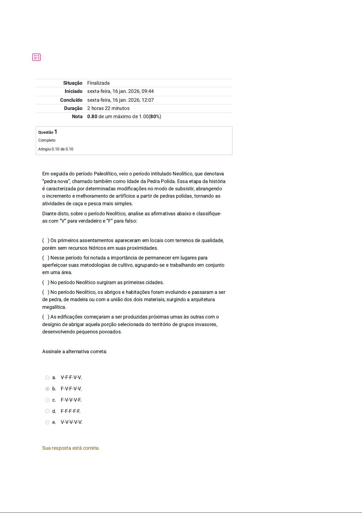 Situação Finalizada Iniciado sexta-feira, 16 jan. 2026, 09:44 Concluído sexta-feira, 16 jan. 2026, 12:07 Duração 2 horas 22 minutos Nota 0.80 de um máximo de 1.00(80%) Questão 1 Completo Atingiu 0.10 de 0.10 Em seguida do período Paleolítico, veio o período intitulado Neolítico, que denotava “pedra nova”, chamado também como Idade da Pedra Polida. Essa etapa da história é caracterizada por determinadas modi�cações no modo de subsistir, abrangendo o incremento e melhoramento de artifícios a partir de pedras polidas, tornando as atividades de caça e pesca mais simples. Diante disto, sobre o período Neolítico, analise as a�rmativas abaixo e classi�que- as com “V” para verdadeiro e “F” para falso: ( ) Os primeiros assentamentos apareceram em locais com terrenos de qualidade, porém sem recursos hídricos em suas proximidades. ( ) Nesse período foi notada a importância de permanecer em lugares para aperfeiçoar suas metodologias de cultivo, agrupando-se e trabalhando em conjunto em uma área. ( ) No período Neolítico surgiram as primeiras cidades. ( ) No período Neolítico, os abrigos e habitações foram evoluindo e passaram a ser de pedra, de madeira ou com a união dos dois materiais, surgindo a arquitetura megalítica. ( ) As edi�cações começaram a ser produzidas próximas umas às outras com o desígnio de abrigar aquela porção selecionada do território de grupos invasores, desenvolvendo pequenos povoados. Assinale a alternativa correta: a. V-F-F-V-V. b. F-V-F-V-V. c. F-V-V-V-F. d. F-F-F-F-F. e. V-V-V-V-V. Sua resposta está correta. Questão 2 Completo Atingiu 0.10 de 0.10 O início da revolução urbana aconteceu no Oriente Médio, nas margens dos rios Nilo (Egito), Jordão (Israel/Palestina), Tigre e Eufrates (Mesopotâmia, atual Iraque), em uma área que �cou popular como Crescente Fértil. Essas terras, de particularidade desértica, apresentaram suas áreas cultiváveis adjuntas aos rios para irrigação de seus solos, locomoção entre cidades e provimento de água para a população (OLIVEIRA, 2016). Essa região abrange os sumérios, os egípcios, os hebreus, os persas e os fenícios. Deste modo, quanto a esses povos, relacione a coluna da direita com a da esquerda: 1 – Sumérios ( ) Com poucas áreas férteis, o maior donativo à arquitetura foi a cidade de Persépolis. 2 – Egípcios ( ) Com uma religião monoteísta, foram caracterizados por grandes migrações e convivência em tribos. 3 – Hebreus ( ) Foram os primeiros a criar as cidades-estados e as cidades-templos, sendo sociedades urbanas autônomas. 4 - Persas ( ) Inventaram a irrigação, conseguiram conduzir o excesso de produção e, a partir dele, reproduziram sua cultura. 5 - Fenícios ( ) Subsistiam do comércio marítimo e �cavam dispostos em cidades-estados. Assinale a alternativa correta: a. 2, 1, 5, 4, 3. b. 5, 4, 1, 2, 3. c. 4, 3, 2, 1, 5. d. 2, 1, 3, 5, 4. e. 4, 3, 1, 2, 5. Sua resposta está correta. Questão 3 Completo Atingiu 0.00 de 0.10 Através da inovação Neolítica o modelo de vida urbana se iniciou. Os primeiros apontamentos da aparição das cidades datam de 12.000 a.C. a 10.000 a.C., quando ocorreu uma seca na região do Oriente Próximo, o lugar de origem da civilização. Em aproximadamente 9.000 a.C., aconteceu uma alteração da atividade de caça para pastoreio. Já por volta de 8.000 a.C., as comunidades evoluíram seus procedimentos de plantação, utilizando melhor a terra e desenvolvendo suas a�nidades com o meio. No ano 6.000 a.C., apareceram algumas novidades técnicas, como o arado de relhas. Foi próximo de 5.000 a.C. que surgiram de fato, junto ao rio Eufrates e em outros lugares da Ásia menor, as primeiras aldeias às quais pode-se denominar de cidade (SCOPEL et al., 2018). De acordo com esses fatos, analise as a�rmações: I – A cidade surgiu da aldeia. Porém, não foi espontaneamente uma aldeia que aumentou. A cidade se expandiu com a especi�cação das atividades, quando as tarefas produtivas eram efetivadas pelas pessoas que usavam a terra. II – O re�namento dos conhecimentos técnicos, por volta de 3500 a.C., solidi�cou o artesanato e o comércio. III - A pedra aos poucos foi substituída pela madeira para a produção de elementos cotidianos. IV - O invento da roda proporcionou novos meios de locomoção, como transporte de rodas puxados por animais, o que admitiu a condução de produtos agrícolas, matérias-primas, artifícios entre espaços distantes, incitando a atividade de barganha de produtos. V - Todos esses inventos concretizaram uma nova falência urbana, que propiciou ainda a escrita, os parâmetros de medida e sistemas de contagem, além de um calendário aprimorado. Assinale a alternativa correta: a. As a�rmativas I, II, III e IV estão corretas. b. Apenas I e II estão corretas. c. Apenas IV está correta. d. Apenas II e IV estão corretas. e. Apenas II, III e IV estão corretas. Sua resposta está incorreta. Questão 4 Completo Atingiu 0.10 de 0.10 A Revolução Industrial, no ano de 1789, trouxe modi�cações em diversos aspectos da sociedade, permitindo novas maneiras de pensar, também relacionadas ao urbanismo e à arquitetura. Analise as a�rmações acerca disso: I. A revolução industrial ocasionou uma revisão conceitual ao Barroco. II. O estilo neoclássico surgiu em concordância com a modéstia e simplicidade dos estilos barroco e rococó. III. Ocorreu um enaltecimento da arquitetura clássica, entendendo sua relevância para a história. IV. Com o surgimento do estilo eclético houve mais autonomia nas composições, criando arquiteturas com identidades intrínsecas. V. Difusão e emprego de novos materiais dotados de maior liberdade compositiva e estrutural na construção. Assinale a alternativa correta: a. Apenas II e IV estão corretas. b. Todas as alternativas estão corretas. c. Apenas II está correta. d. Apenas I, III, IV e V estão corretas. e. Apenas I e II