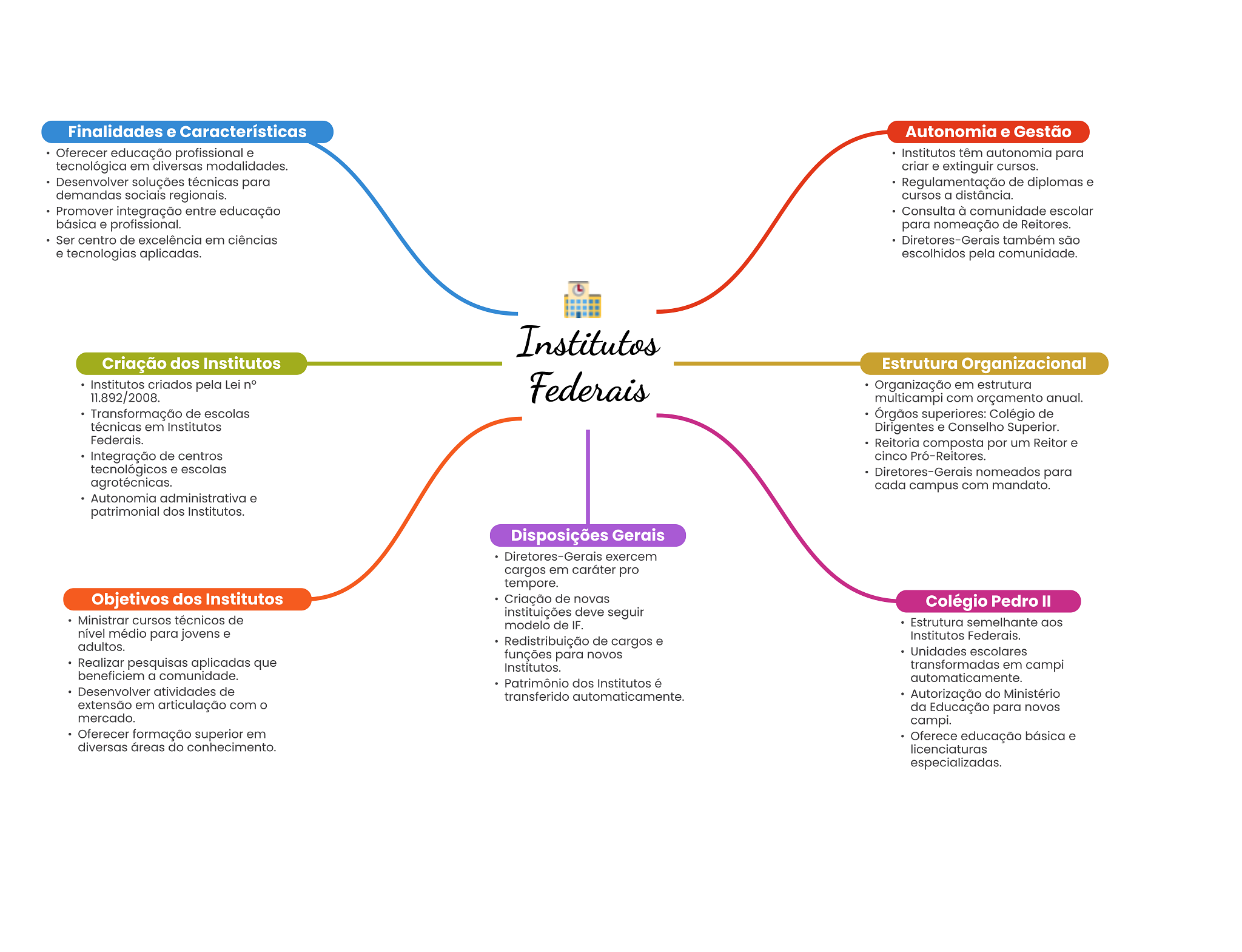 Finalidades e Características Autonomia e Gestão Oferecer educação profissional e Institutos têm autonomia para tecnológica em diversas modalidades. criar e extinguir cursos. Desenvolver soluções técnicas para Regulamentação de diplomas e demandas sociais regionais. cursos a distância. Promover integração entre educação Consulta à comunidade escolar básica e profissional. para nomeação de Reitores. Ser centro de excelência em ciências Diretores-Gerais também são e tecnologias aplicadas. escolhidos pela comunidade. Institutos Criação dos Institutos Estrutura Organizacional Institutos criados pela Lei n° Federais Organização em estrutura 11.892/2008. multicampi com orçamento anual. Transformação de escolas Órgãos superiores: Colégio de técnicas em Institutos Dirigentes e Conselho Superior. Federais. Reitoria composta por um Reitor e Integração de centros cinco Pró-Reitores. tecnológicos e escolas Diretores-Gerais nomeados para agrotécnicas. cada campus com mandato. Autonomia administrativa e patrimonial dos Institutos. Disposições Gerais Diretores-Gerais exercem cargos em caráter pro tempore. Objetivos dos Institutos Criação de novas Colégio Pedro II instituições deve seguir Ministrar cursos técnicos de modelo de IF. Estrutura semelhante aos nível médio para jovens e Institutos Federais. adultos. Redistribuição de cargos e funções para novos Unidades escolares Realizar pesquisas aplicadas que Institutos. transformadas em campi beneficiem a comunidade. Patrimônio dos Institutos é automaticamente. Desenvolver atividades de transferido automaticamente. Autorização do Ministério extensão em articulação com da Educação para novos mercado. campi. Oferecer formação superior em Oferece educação básica e diversas áreas do conhecimento. licenciaturas especializadas.