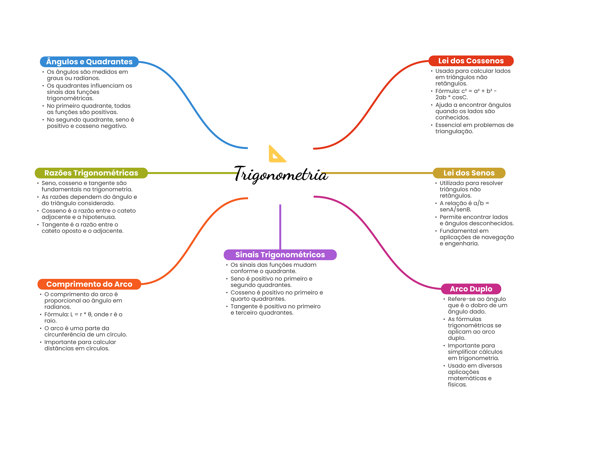 Ângulos e Quadrantes Lei dos Cossenos Os ângulos são medidos em Usada para calcular lados graus ou radianos. em triângulos não Os quadrantes influenciam retângulos. sinais das funções Fórmula: = + trigonométricas. 2ab cosC. No primeiro quadrante, todas Ajuda a encontrar ângulos as funções são positivas. quando lados são No segundo quadrante, seno é conhecidos. positivo e cosseno negativo. Essencial em problemas de triangulação. Razões Trigonométricas Trigonometria Lei dos Senos Seno, cosseno e tangente são Utilizada para resolver fundamentais na trigonometria. triângulos não As razões dependem do ângulo e retângulos. do triângulo considerado. A relação é a/b = Cosseno é a razão entre O cateto senA/senB. adjacente e a hipotenusa. Permite encontrar lados Tangente é a razão entre O e ângulos desconhecidos. cateto oposto e adjacente. Fundamental em aplicações de navegação e engenharia. Sinais Trigonométricos Os sinais das funções mudam conforme quadrante. Seno é positivo no primeiro e Comprimento do Arco segundo quadrantes. Cosseno é positivo no primeiro e Arco Duplo O comprimento do arco é proporcional ao ângulo em quarto quadrantes. Refere-se ao ângulo radianos. Tangente é positiva no primeiro que é O dobro de um Fórmula: L = r onde r é e terceiro quadrantes. ângulo dado. raio. As fórmulas arco é uma parte da trigonométricas se circunferência de um círculo. aplicam ao arco duplo. Importante para calcular distâncias em círculos. Importante para simplificar cálculos em trigonometria. Usado em diversas aplicações matemáticas e físicas.