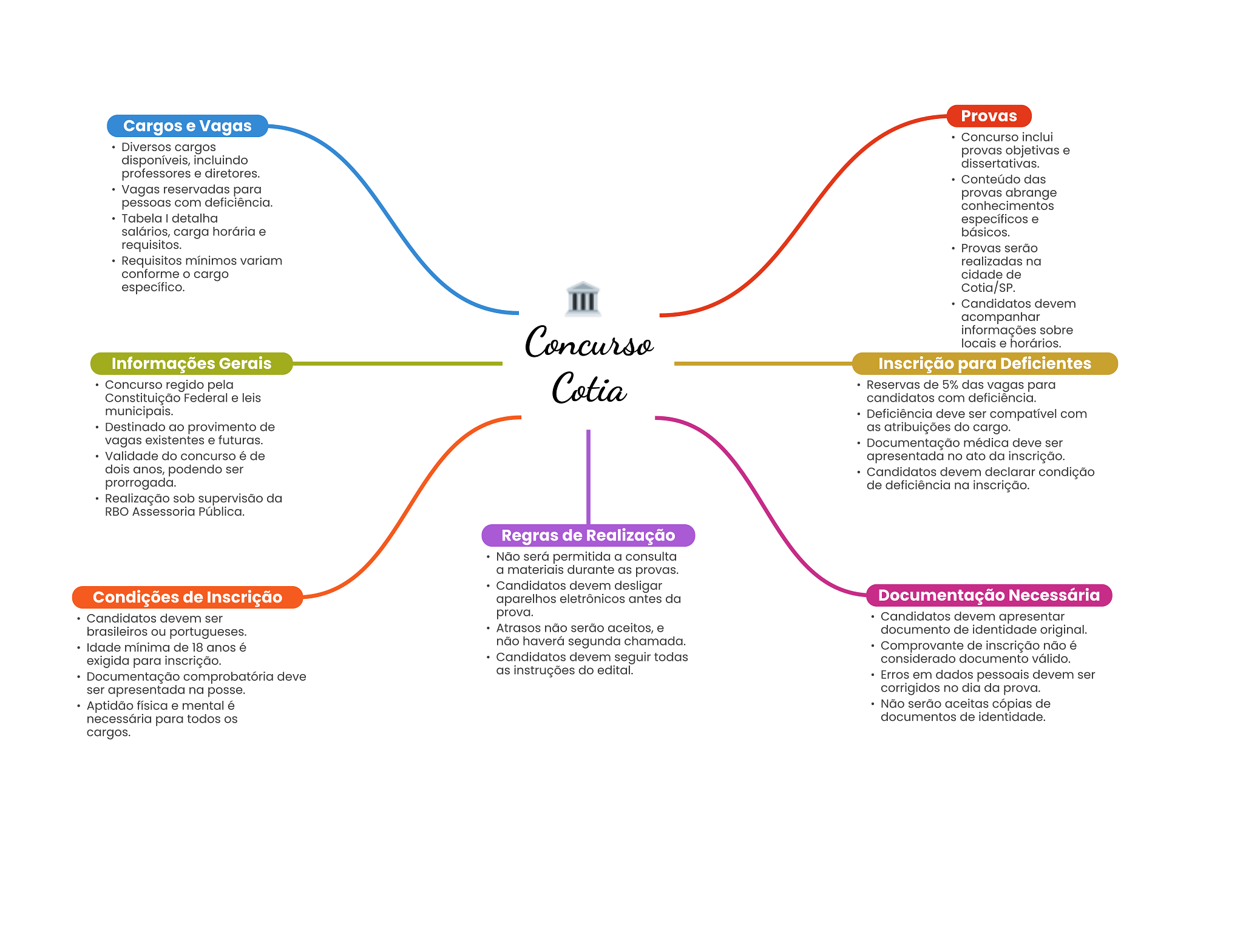 Provas Cargos e Vagas Concurso inclui Diversos cargos provas objetivas e disponíveis, incluindo dissertativas. professores e diretores. Conteúdo das Vagas reservadas para provas abrange pessoas com deficiência. conhecimentos Tabela detalha específicos e salários, carga horária e básicos. requisitos. Provas serão Requisitos mínimos variam realizadas na conforme cargo cidade de específico. Cotia/SP. Candidatos devem acompanhar Concurso informações sobre locais e horários. Informações Gerais Inscrição para Deficientes Concurso regido pela Constituição Federal e leis Cotia Reservas de 5% das vagas para candidatos com deficiência. municipais. Deficiência deve ser compatível com Destinado ao provimento de as atribuições do cargo. vagas existentes e futuras. Documentação médica deve ser Validade do concurso é de apresentada no ato da inscrição. dois anos, podendo ser Candidatos devem declarar condição prorrogada. de deficiência na inscrição. Realização sob supervisão da RBO Assessoria Pública. Regras de Realização Não será permitida a consulta a materiais durante as provas. Candidatos devem desligar Condições de Inscrição aparelhos eletrônicos antes da Documentação Necessária Candidatos devem ser prova. Candidatos devem apresentar brasileiros ou portugueses. Atrasos não serão aceitos, e documento de identidade original. Idade mínima de 18 anos é não haverá segunda chamada. Comprovante de inscrição não é exigida para inscrição. Candidatos devem seguir todas considerado documento válido. Documentação comprobatória deve as instruções do edital. Erros em dados pessoais devem ser ser apresentada na posse. corrigidos no dia da prova. Aptidão física e mental é Não serão aceitas cópias de necessária para todos OS documentos de identidade. cargos.