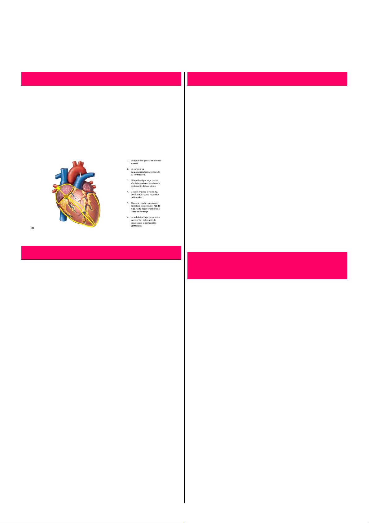 Biofísica Cardiaca 1 SISTEMA ESPECIAL El corazón posee un sistema especializado que genera impulsos eléctricos rítmicos de forma autónoma (potenciales de acción) y los conduce rápidamente a través de todo el órgano. Este sistema se conoce como sistema cardionector. POTENCIAL DE ACCIÓN DEL CORAZÓN El potencial de membrana en reposo del músculo cardíaco se mantiene entre -85 y -90 mV, y en las fibras de Purkinje puede llegar a -90 a -100 mV, lo que refleja una alta negatividad interna en estado de reposo. Tras la despolarización (espiga), la membrana permanece despolarizada durante un tiempo prolongado: aproximadamente 0,2 segundos en las aurículas y 0,3 segundos en los ventrículos. Esta fase sostenida se llama meseta y se debe a la entrada continua de calcio y sodio, lo que retrasa la repolarización. La repolarización ocurre de forma abrupta una vez que se restablece la salida de potasio, lo que permite que la membrana vuelva a su estado negativo. La contracción del músculo cardíaco dura entre 3 a 5 veces más que la del músculo esquelético, lo cual es crucial para permitir un vaciamiento eficiente de las cavidades del corazón y prevenir una contracción sostenida (tetanización), que sería incompatible con la función cardíaca normal. CONTRACCIÓN ESQUELÉTICA X CARDIACA En el músculo esquelético, la contracción inicia con la breve apertura de canales rápidos de sodio. En el músculo cardíaco, se abren tanto canales de sodio como de calcio, y los de calcio permanecen abiertos más tiempo, permitiendo la entrada sostenida de iones, lo que genera la meseta en el potencial de acción. El calcio facilita la excitación y contracción del músculo cardíaco. Al final del potencial, aumenta la salida de potasio, lo que finaliza la contracción. La velocidad de conducción es de 0.3 a 0.5 m/seg en fibras auriculares y ventriculares, mucho más lenta que en fibras nerviosas gruesas o músculo esquelético. En el sistema de conducción especializado, la velocidad varía entre 0.02 y 4 m/seg. ACOPLAMIENTO EXCITACIÓN X CONTRACCIÓN 1. Inicio del proceso El potencial de acción se propaga por la membrana de la fibra muscular y se transmite hacia el interior de la célula a través de los túbulos T. Esta señal activa al retículo sarcoplásmico, que libera iones de calcio al sarcoplasma. 2. Contracción muscular El calcio liberado permite que ocurran las reacciones químicas entre los filamentos de actina y miosina, provocando la contracción de la fibra muscular. 3. Particularidades en el músculo cardíaco El retículo sarcoplásmico está menos desarrollado que en el músculo esquelético. Los túbulos T tienen un diámetro mayor y un volumen más amplio, lo que permite un mayor almacenamiento de calcio. Además, contienen mucopolisacáridos con carga negativa que ayudan a mantener calcio adicional disponible. 4. Finalización del proceso Al finalizar la meseta del potencial de acción, se detiene de forma abrupta la entrada de calcio. Los iones de calcio son transportados de regreso al retículo sarcoplásmico y a los túbulos T. La contracción muscular cesa y la fibra queda lista para responder a un nuevo potencial de acción. 2 DURACIÓN DE LA CONTRACCIÓN La contracción muscular comienza pocos milisegundos después del inicio del potencial de acción y continúa durante algunos milisegundos después de que este finaliza. • En el músculo auricular, la contracción dura aproximadamente 0.2 segundos. • En el músculo ventricular, dura cerca de 0.3 segundos. CICLO CARDIACO El ciclo cardíaco es el periodo que transcurre desde el inicio de un latido hasta el comienzo del siguiente. Comienza con la generación espontánea de un potencial de acción en el nodo sinusal, ubicado en la pared superior y lateral de la aurícula derecha, cerca de la abertura de la vena cava superior. El potencial de acción se propaga por ambas aurículas y luego llega a los ventrículos a través del haz auriculoventricular. SÍSTOLE Y DIÁSTOLE Sístole – Relajación y llenado Diástole – Contracción y vaciado. POTENCIAL DE ACCIÓN Un potencial de acción es un cambio reversible en el potencial de membrana, producido por el movimiento de iones a favor de su gradiente electroquímico. En el corazón, este proceso se conoce como potencial de acción cardíaco. • En reposo, las células del miocardio auricular, ventricular y del sistema de conducción (Haz de His y fibras de Purkinje) tienen un potencial de membrana de -85 mV. • Cuando estas células son excitadas y la despolarización alcanza el umbral de -65 mV, se genera un potencial de acción. Existen dos tipos de potenciales de acción en el corazón: 1. Respuesta rápida Se debe a la apertura de canales rápidos de sodio. Se encuentra en: miocardio auricular, ventrículos, Haz de His y fibras de Purkinje. 2. Respuesta lenta Se debe a la activación de canales lentos de calcio. Se encuentra en: nodo sinoauricular (NSA) y nodo auriculoventricular (NAV). FASES DEL POTENCIAL DE ACCIÓN Fase 0 – Despolarización rápida Se produce por la entrada masiva de iones sodio (Na⁺) a través de canales voltaje-dependientes. Estos canales se activan con la despolarización, se abren brevemente (1-2 milisegundos) y luego se inactivan. Fase 1 – Repolarización temprana Ocurre el cierre de los canales de sodio y un aumento en la salida de potasio (K⁺). También puede haber entrada de cloro (Cl⁻), lo que ayuda a que el potencial de membrana se acerque al valor de reposo. 3 Fase 2 – Meseta Característica del músculo cardíaco. Se mantiene una despolarización prolongada por la entrada de calcio (Ca²⁺) a través de canales lentos activados alrededor de -30 mV. Esta fase se prolonga hasta que los canales se inactivan cerca de 0 mV. Fase 3 – Repolarización final La repolarización se completa por el cierre de los canales de calcio, la salida máxima de potasio y la inactivación completa de los canales de sodio. Fase 4 