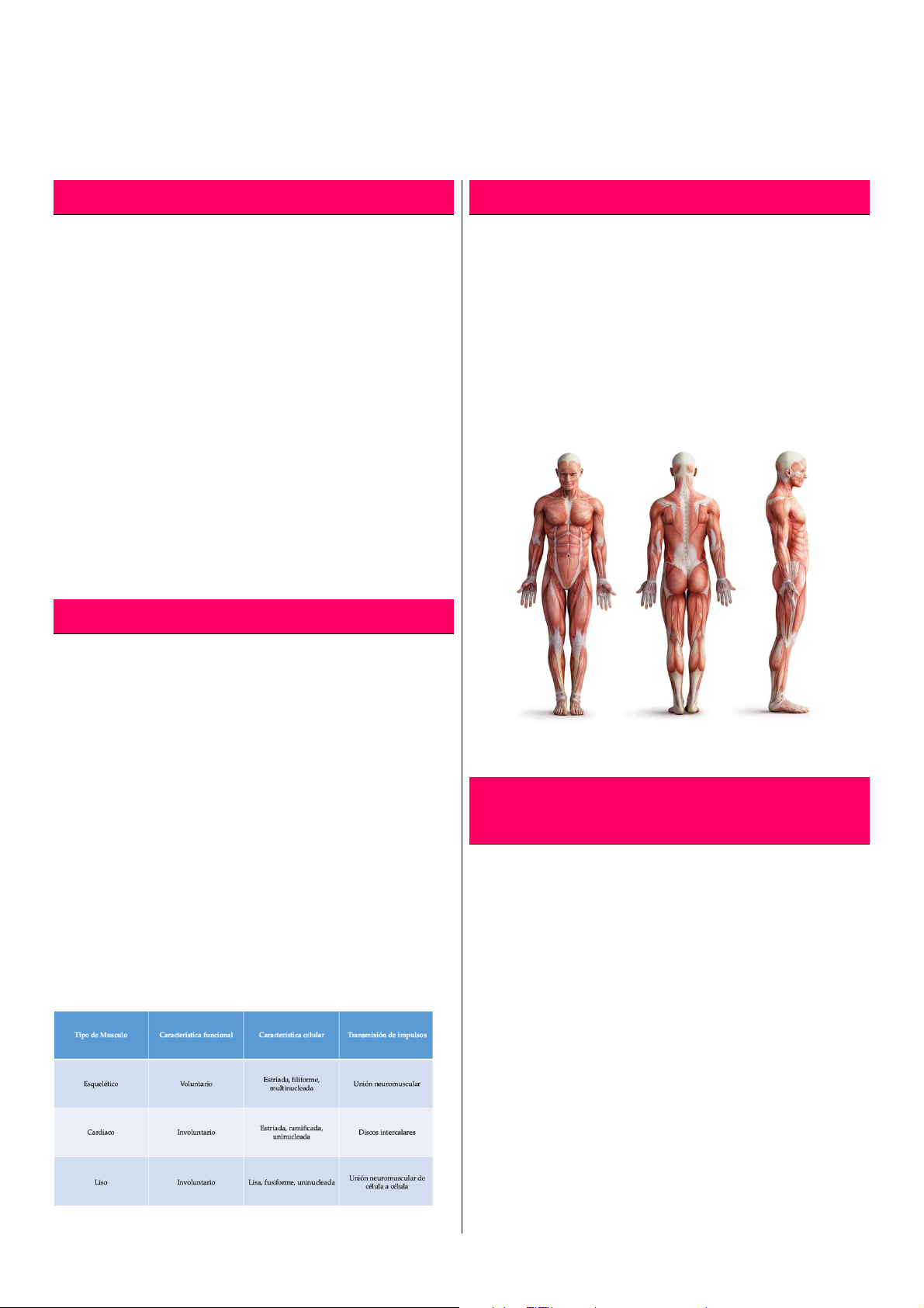 Contracción muscular 1 GENERALIDADES La biofísica muscular se enfoca en el estudio del músculo esquelético, abarcando aspectos moleculares, eléctricos, mecánicos y energéticos. Los músculos, compuestos principalmente por tejido muscular, tienen como función generar fuerza, que puede convertirse en trabajo o en tensión. La contracción muscular puede resultar en trabajo externo, mantener la postura corporal o generar calor. El músculo actúa como un transductor de energía química en energía mecánica, utilizando entre el 25% y el 30% de la energía consumida para generar fuerza, mientras que el resto se convierte en calor. MUSCULOS Existen tres tipos de tejido muscular: estriado esquelético, estriado cardíaco y liso visceral, todos involucrados en el trabajo mecánico. El tejido muscular cardíaco permite las contracciones del corazón, facilitando la circulación sanguínea. El tejido muscular liso visceral, ubicado en las paredes de las vísceras, se contrae para movilizar contenidos necesarios para funciones específicas. El tejido muscular esquelético, mediante contracciones, permite movimientos voluntarios de partes o segmentos del cuerpo. FUNCIÓN MUSCULO ESQUELÉTICO El tejido muscular estriado esquelético forma los músculos esqueléticos o voluntarios, responsables de los movimientos voluntarios del cuerpo. Estos músculos están distribuidos por todo el cuerpo y están estrechamente conectados con el sistema nervioso central, específicamente con el sistema motor somático voluntario, recibiendo órdenes de él. CLASIFICACIÓN DEL MUSCULO ESQUELÉTICO MUSCULO RÁPIDO: Se denomina también musculo blanco; su color es más pálido por necesitar poco riego sanguíneo. Su metabolismo es principalmente anaeróbico. Obtiene ATP por medio de la glucolisis, por ser un proceso de obtención de energía sin necesitar de oxígeno. Las fibras son de gran tamaño, con el retículo sarcoplasmático muy desarrollado. 2 MUSCULO LENTO: Se le llama músculo rojo debido a la gran cantidad de mioglobina, una proteína que almacena hierro y facilita la captación de oxígeno. Este tipo de músculo tiene un metabolismo principalmente aeróbico, con una gran cantidad de mitocondrias. Las fibras musculares son pequeñas y están altamente vascularizadas, lo que favorece el suministro de oxígeno necesario para la producción de energía en actividades de larga duración. ESTRUCTURA DEL MUSCULO ESQUELÉTICO El músculo está formado por haces paralelos de fibras musculares, donde cada fibra es una célula muscular. El conjunto del órgano muscular está rodeado por una capa fibrosa llamada epimisio. Los fascículos musculares, que son grupos de fibras, están envueltos por una capa interna denominada perimisio. Cada célula o fibra muscular está rodeada por el endomisio, una delgada capa de tejido conectivo que se conecta con la membrana celular. Las tres capas fibrosas (epimisio, perimisio y endomisio) se unen en los extremos para formar el tendón de inserción. El tendón es crucial porque proporciona soporte, permitiendo que el músculo ejerza fuerza sobre las estructuras cuando se acorta, funcionando como una palanca. La unidad celular del músculo es la fibra muscular, que tiene una membrana plasmática llamada sarcolema y un citoplasma denominado sarcoplasma. El retículo sarcoplásmico es su retículo endoplásmico. Las fibras musculares contienen miofibrillas, formadas por sarcómeros, que son las unidades contráctiles del músculo. Las sarcómeros están compuestas por miofilamentos de actina y miosina. El filamento de actina está formado por proteínas globulares (actina G), y el de miosina por proteínas en forma de bastón. MIOFIBRILLA Y SARCOMERO La célula muscular está formada por miofibrillas, fibras más pequeñas y paralelas entre sí, que presentan estriaciones transversales. Estas estriaciones incluyen franjas densas llamadas bandas A y franjas más claras llamadas bandas I. En el centro de las bandas I se encuentran líneas delgadas denominadas líneas Z. El sarcómero es la unidad contráctil del músculo, que se extiende entre dos líneas Z y tiene una longitud de aproximadamente 2 micras en reposo. Las miofibrillas están formadas por sarcómeros dispuestas en serie. 3 MIOFILAMENTOS Y SARCÓMERO Las bandas A contienen filamentos de actina y miosina, mientras que las bandas I solo tienen actina. La actina mide 1 micra y se fija en las líneas Z, creando una zona clara dentro de la banda A llamada línea H. La miosina tiene una longitud de 1,6 micras, abarcando el centro de la sarcómero, y sus extremos no tocan la línea Z. La miosina está sostenida por la proteína titina, que regula la longitud de la sarcómero. UNIDAD MOTORA Una unidad motora está formada por una fibra nerviosa y las fibras musculares que inerva. La cantidad de fibras musculares en una unidad motora influye en la habilidad del músculo. En músculos más hábiles, como los de las cuerdas vocales, una fibra nerviosa inerva solo dos o tres fibras musculares. En músculos más gruesos, como los del tronco, una sola fibra nerviosa controla miles de fibras musculares, lo que provoca una respuesta más masiva y menos graduada. MECANISMO DE CONTRACCIÓN MUSCULAR 1. Un potencial de acción viaja a lo largo del axón de una neurona motora hasta sus terminaciones en las fibras musculares. 2. En cada terminación axonal se libera el neurotransmisor acetilcolina. 3. La acetilcolina actúa sobre el sarcolema, abriendo canales de Na+ con puerta química. 4. Esto provoca la entrada de grandes cantidades de Na+ al interior de la fibra muscular, iniciando un potencial de acción en la fibra muscular. 5. El potencial de acción viaja a lo largo de la membrana sarcolémica y se propaga por los túbulos T, alcanzando las tríadas y cisternas del retículo sarcoplásmico. 6. La despolarización de la membrana de los túbulos T provoca la apertura de canales de Ca2+ en las membranas del retículo sarcoplásm