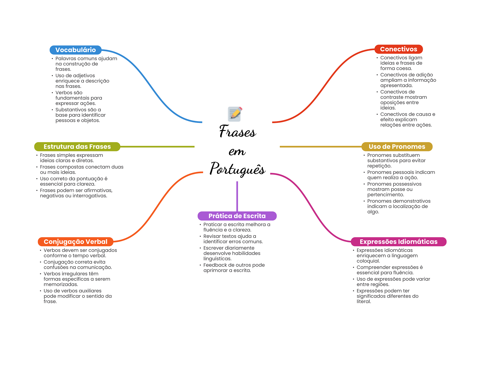 Vocabulário Conectivos Palavras comuns ajudam Conectivos ligam na construção de ideias e frases de frases. forma coesa. Uso de adjetivos Conectivos de adição enriquece a descrição ampliam a informação nas frases. apresentada. Verbos são Conectivos de fundamentais para contraste mostram expressar ações. oposições entre Substantivos são a ideias. base para identificar Conectivos de causa e pessoas e objetos. efeito explicam relações entre ações. Frases Estrutura das Frases Uso de Pronomes em Frases simples expressam Pronomes substituem ideias claras e diretas. substantivos para evitar Frases compostas conectam duas ou mais ideias. Português repetição. Pronomes pessoais indicam Uso correto da pontuação é quem realiza a ação. essencial para clareza. Pronomes possessivos Frases podem ser afirmativas, mostram posse ou negativas ou interrogativas. pertencimento. Pronomes demonstrativos indicam a localização de algo. Prática de Escrita Praticar a escrita melhora a fluência e a clareza. Revisar textos ajuda a Conjugação Verbal identificar erros comuns. Expressões Idiomáticas Escrever diariamente Verbos devem ser conjugados desenvolve habilidades Expressões idiomáticas conforme tempo verbal. linguísticas. enriquecem a linguagem Conjugação correta evita coloquial. confusões na comunicação. Feedback de outros pode Compreender expressões é aprimorar a escrita. Verbos irregulares têm essencial para fluência. formas específicas a serem Uso de expressões pode variar memorizadas. entre regiões. Uso de verbos auxiliares Expressões podem ter pode modificar sentido da significados diferentes do frase. literal.