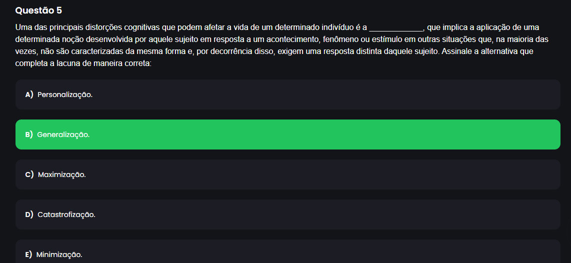 Questão 5 Uma das principais distorções cognitivas que podem afetar a vida de um determinado indivíduo é a que implica a aplicação de uma determinada noção desenvolvida por aquele sujeito em resposta a um acontecimento, fenômeno ou estímulo em outras situações que, na maioria das vezes, não são caracterizadas da mesma forma e, por decorrência disso, exigem uma resposta distinta daquele sujeito. Assinale a alternativa que completa a lacuna de maneira correta: A) Personalização. B) Generalização. c) Maximização. D) Catastrofização. E) Minimização.