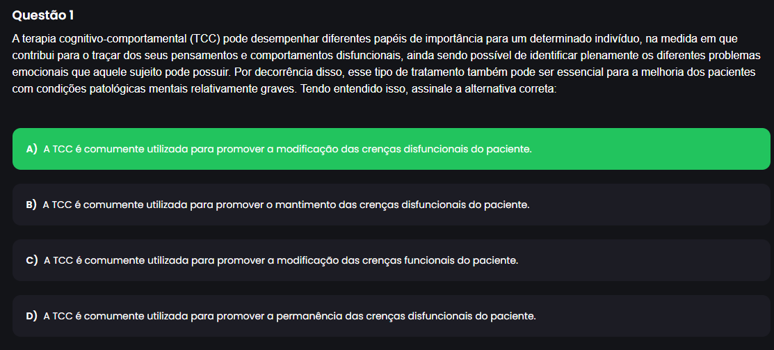 Questão 1 A terapia (TCC) pode desempenhar diferentes papéis de importância para um determinado indivíduo, na medida em que contribui para traçar dos seus pensamentos e comportamentos disfuncionais, ainda sendo possível de identificar plenamente os diferentes problemas emocionais que aquele sujeito pode possuir. Por decorrência disso, esse tipo de tratamento também pode ser essencial para a melhoria dos pacientes com condições patológicas mentais relativamente graves. Tendo entendido isso, assinale a alternativa correta: A) A TCC é comumente utilizada para promover a modificação das crenças disfuncionais do paciente. B) A TCC é comumente utilizada para promover O mantimento das crenças disfuncionais do paciente. c) A TCC é comumente utilizada para promover a modificação das crenças funcionais do paciente. D) A TCC é comumente utilizada para promover a permanência das crenças disfuncionais do paciente.